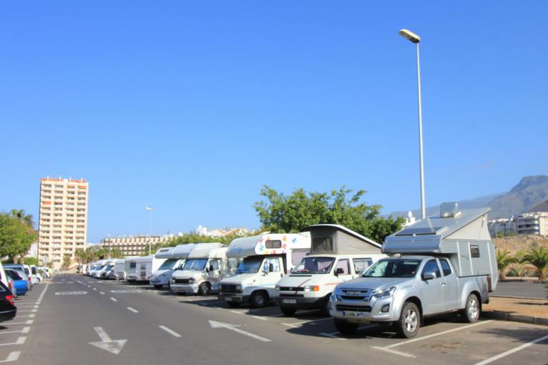 Nous reprenons l'autoroute et arrivons à Los Cristianos. Il fait nuit, nous nous posons avenue Juan Carlos, sur un parking en épis occupé par des dizaines de camping-cars et fourgons.