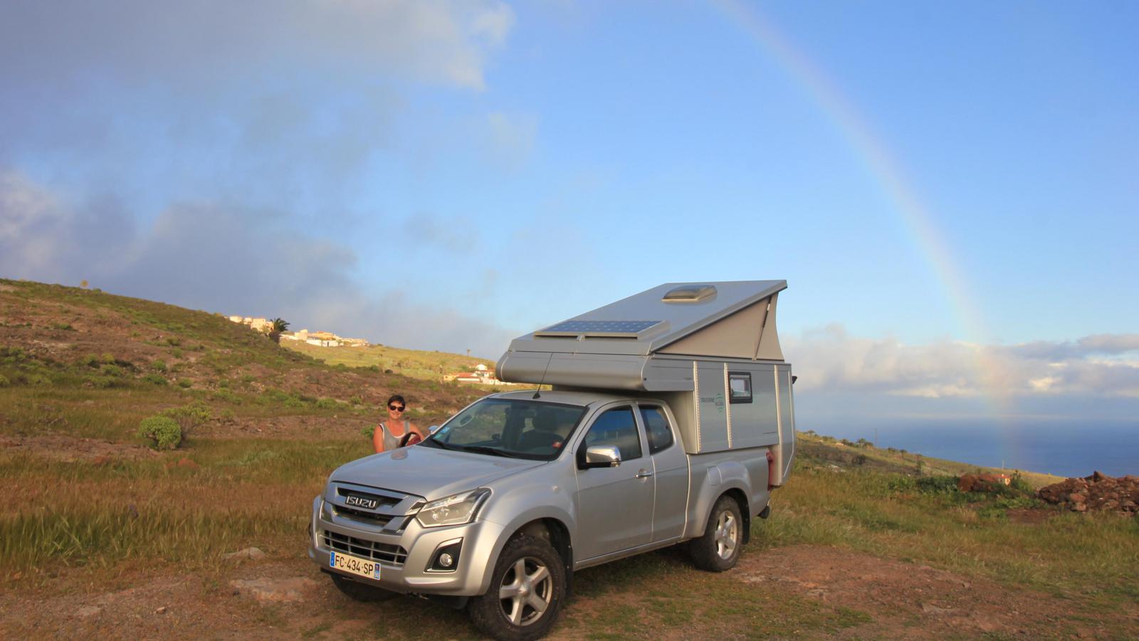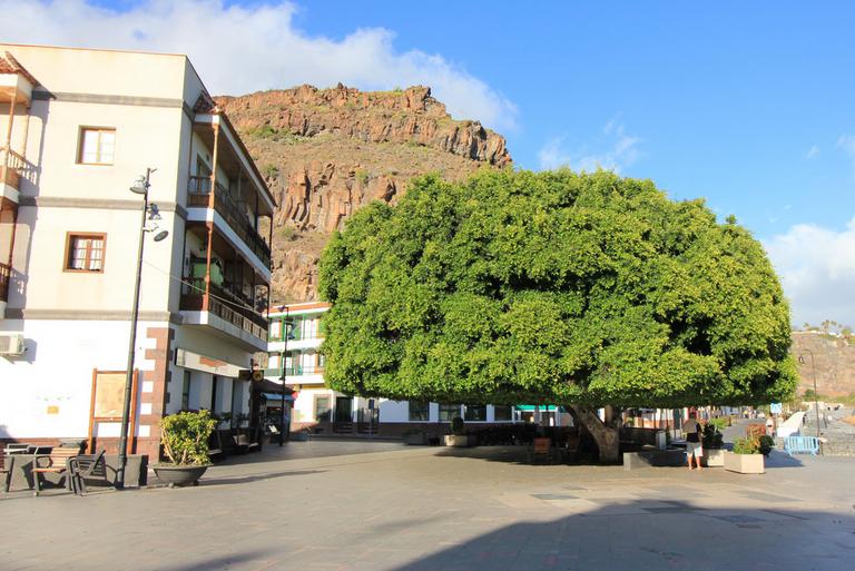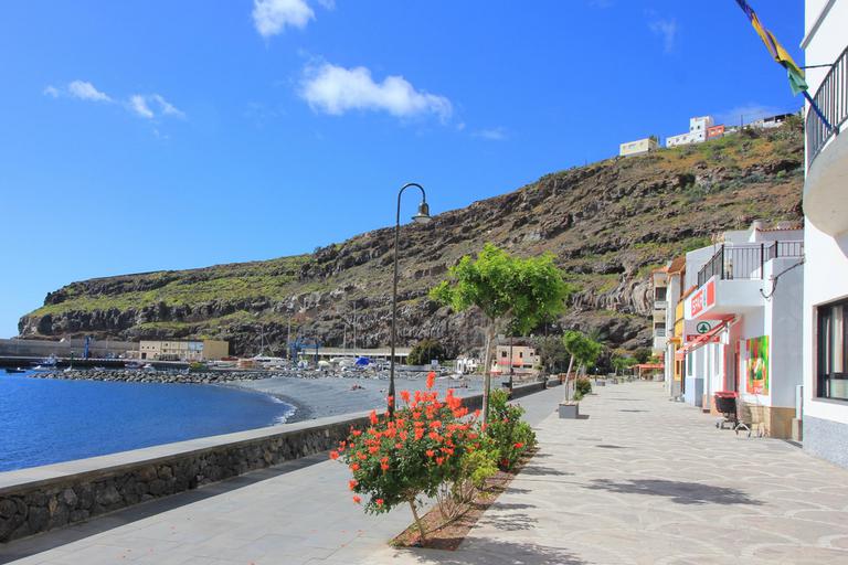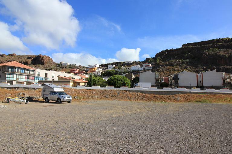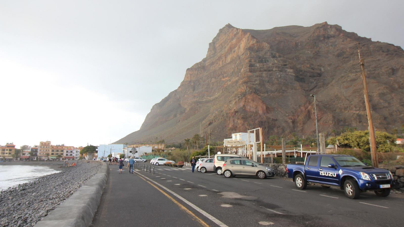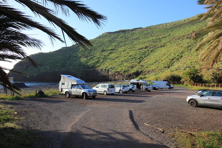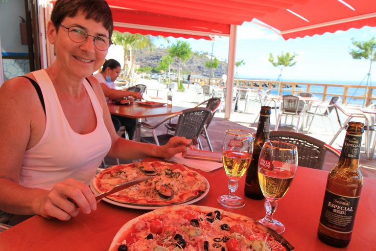 Nous nous installons sur le grand parking en terre derrière l'unique rangée de maisons du front de mer et allons déjeuner sur la terrasse de la pizzéria Don Tomate. La mer est calme et la température est douce, quel changement avec le parc de Garajonay que nous venons de quitter !