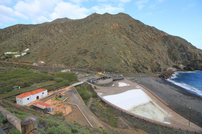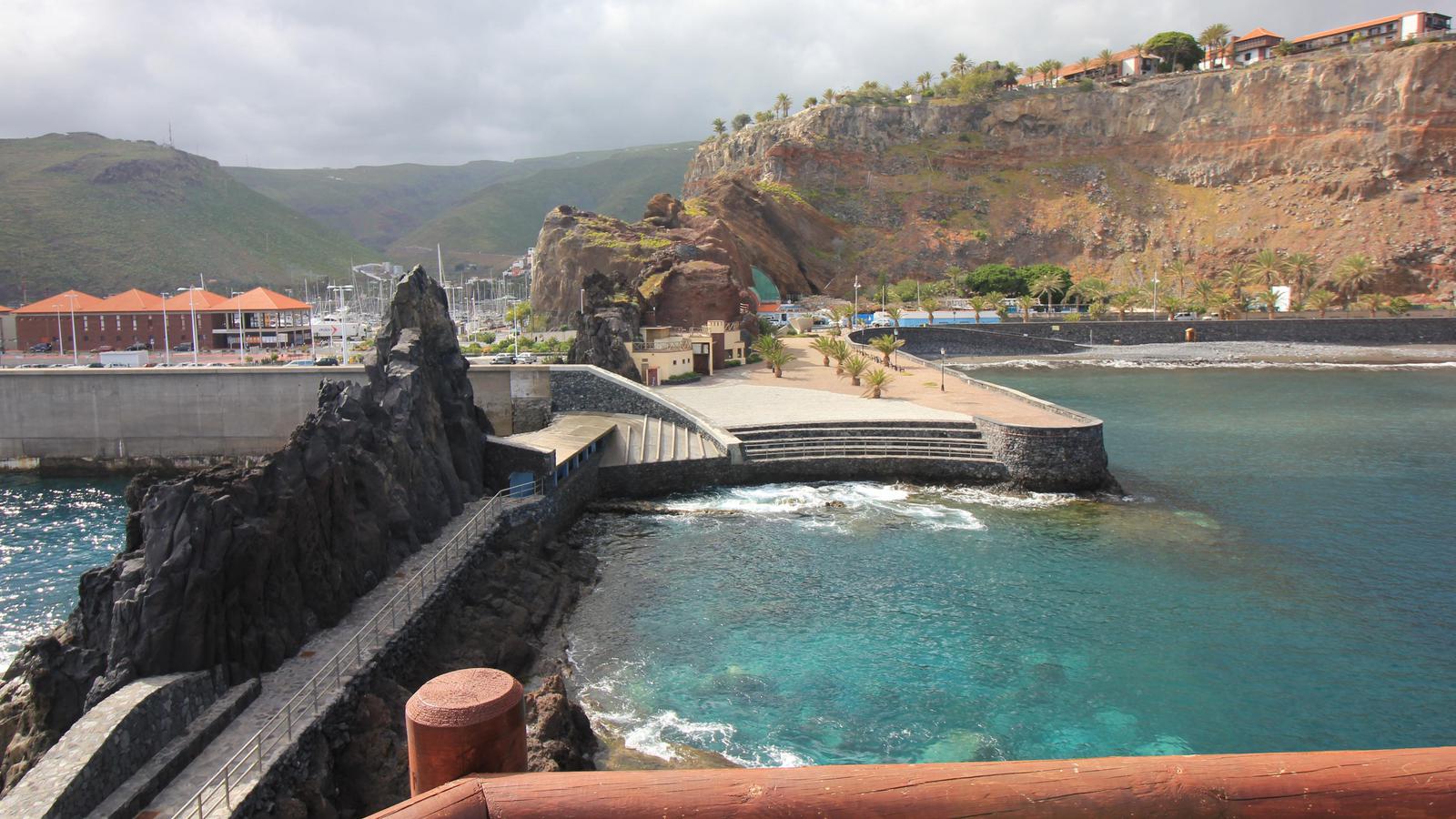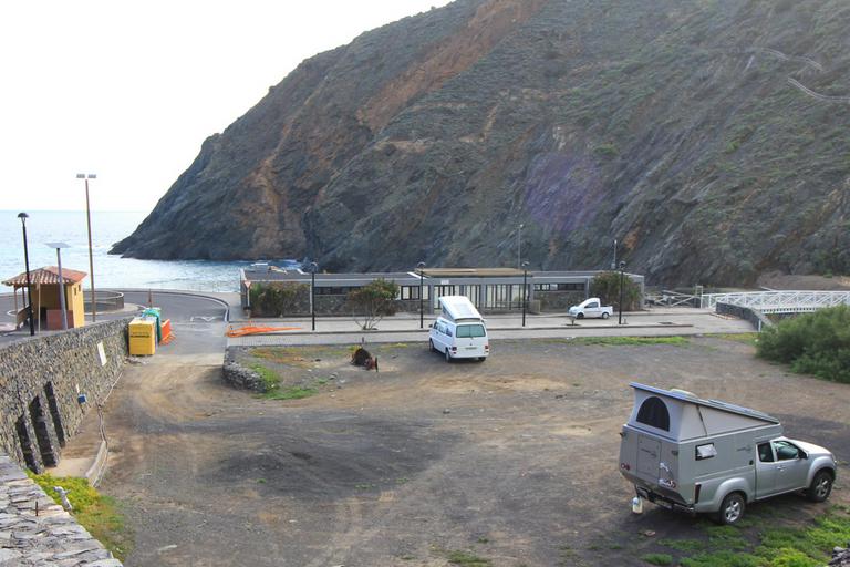 Le soleil refait son apparition vers 800m, puis la température remonte à mesure que nous descendons. Nous passons Vallehermoso et continuons jusqu'au bord de mer. Nous nous installons pour la nuit sur le parking du Parque Maritimo, un complexe de piscines d'eau de mer, fermé actuellement. C'est très agréable, nous avons retrouvé la douceur, il fait 19°c.