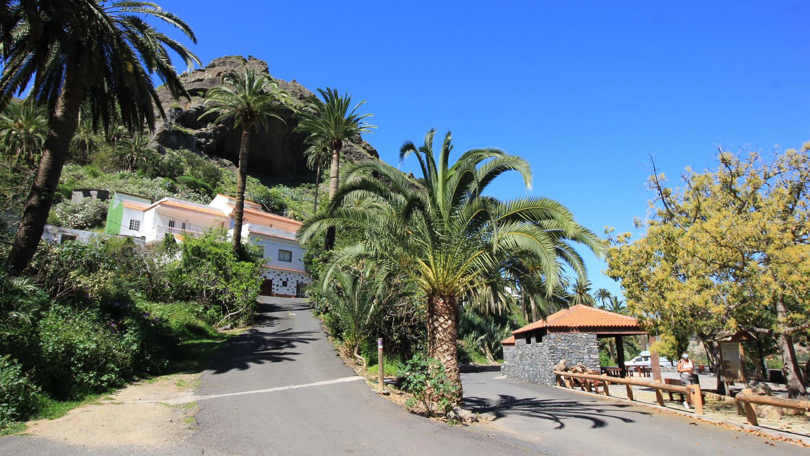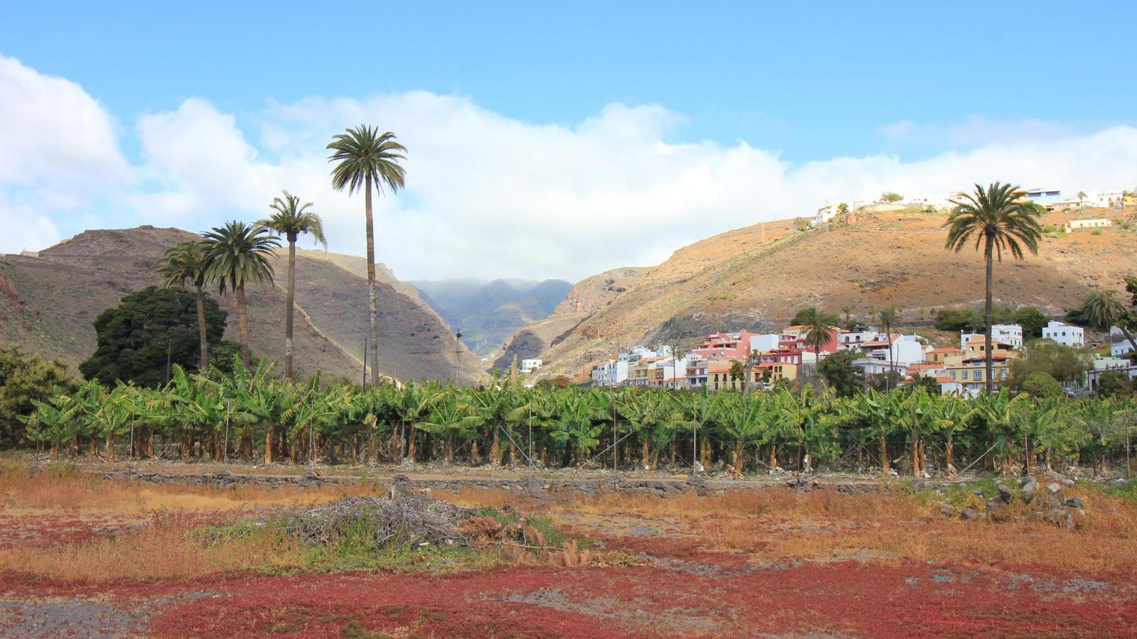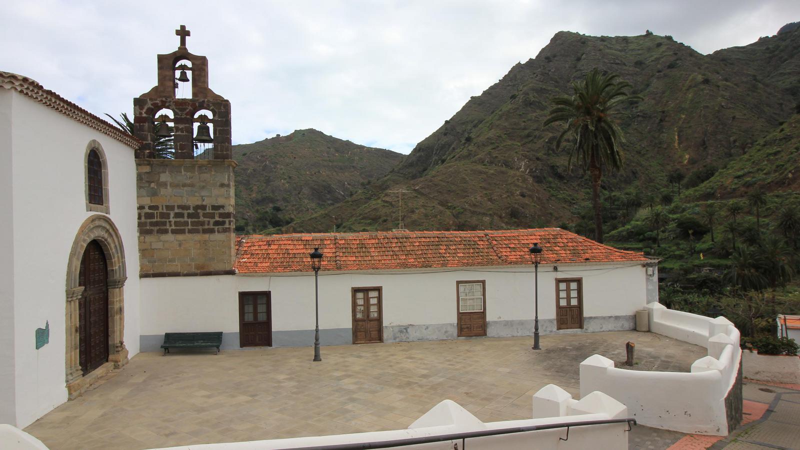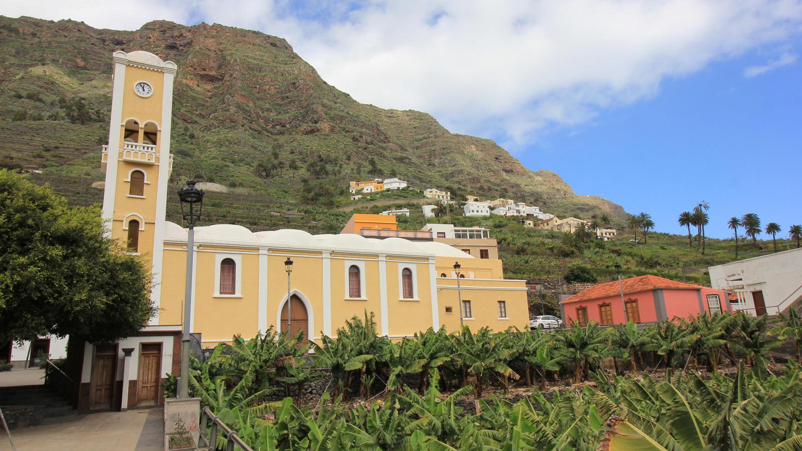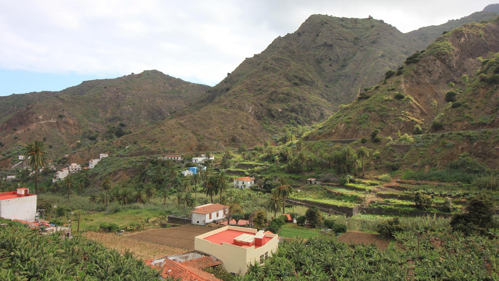 Ce village est un peu plus petit et moins étendu que Hermigua. Il se compose également de pluieurs hameaux, dispersés sur un plateau au-dessus de l'océan. On retrouve ici aussi quelques bananeraies ainsi que de nombreuses terrasses de cultures, le plus souvent en friche. Les ruelles sont agréables, bordées de maisons canariennes bien entretenues, seule l'église dénote avec une toiture en dôme qui me la fait prendre pour une structure démontable en arrivant par la route par le dessus.