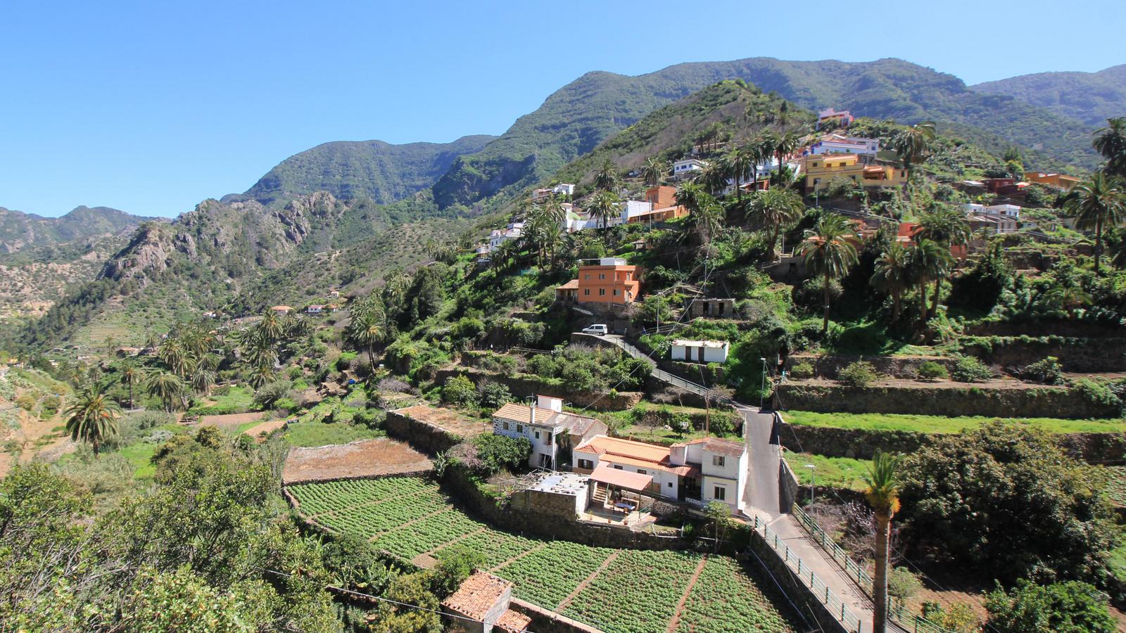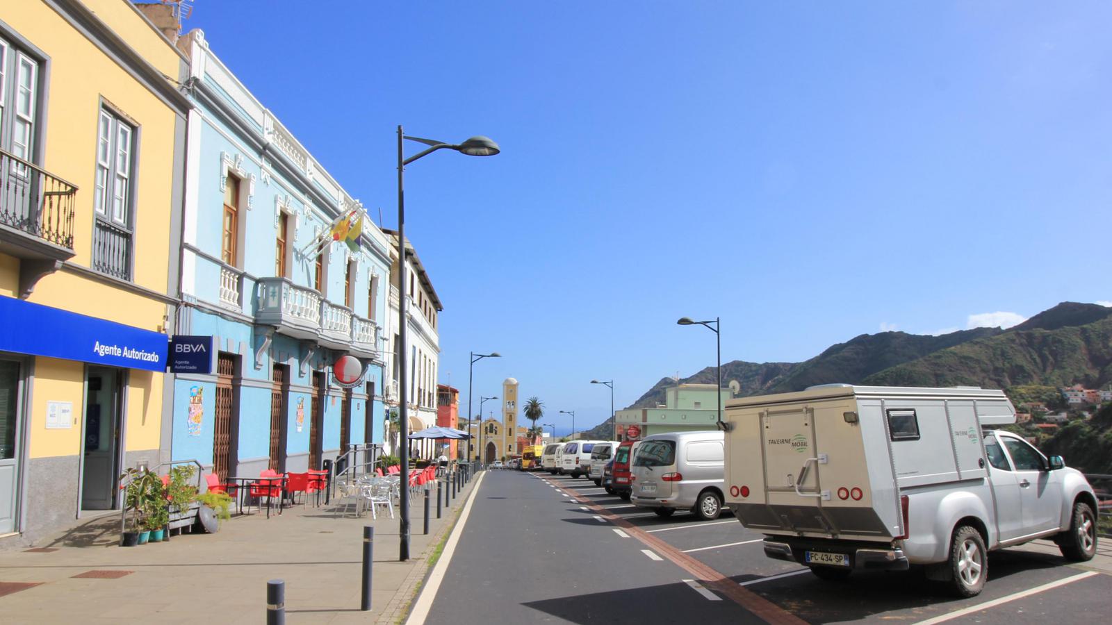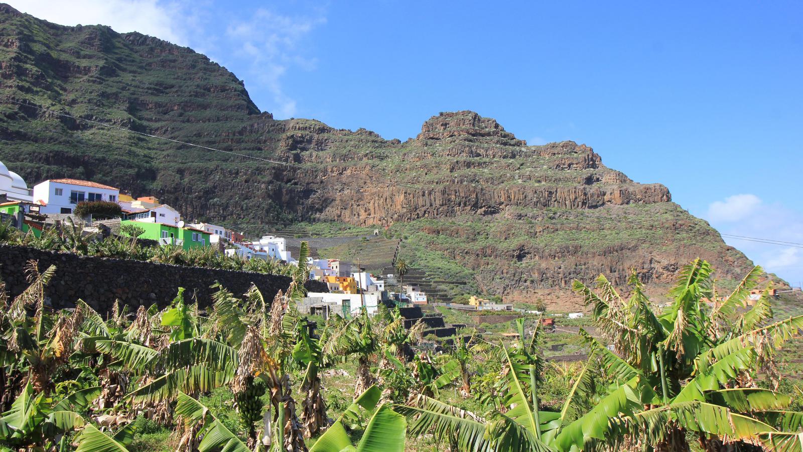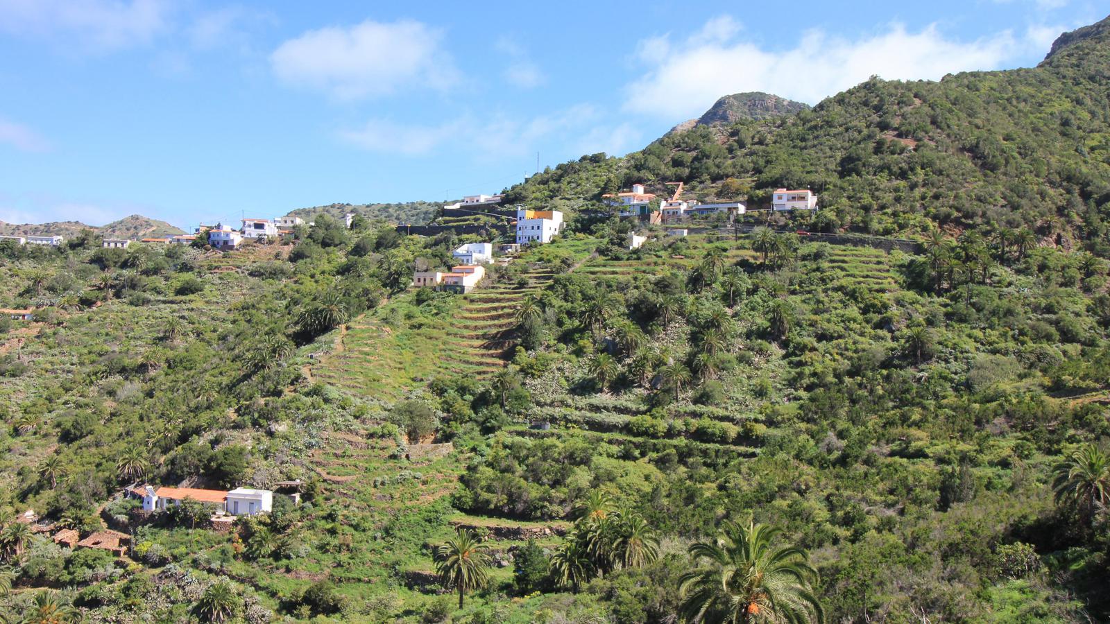 Ce village est un peu plus petit et moins étendu que Hermigua. Il se compose également de pluieurs hameaux, dispersés sur un plateau au-dessus de l'océan. On retrouve ici aussi quelques bananeraies ainsi que de nombreuses terrasses de cultures, le plus souvent en friche. Les ruelles sont agréables, bordées de maisons canariennes bien entretenues, seule l'église dénote avec une toiture en dôme qui me la fait prendre pour une structure démontable en arrivant par la route par le dessus.