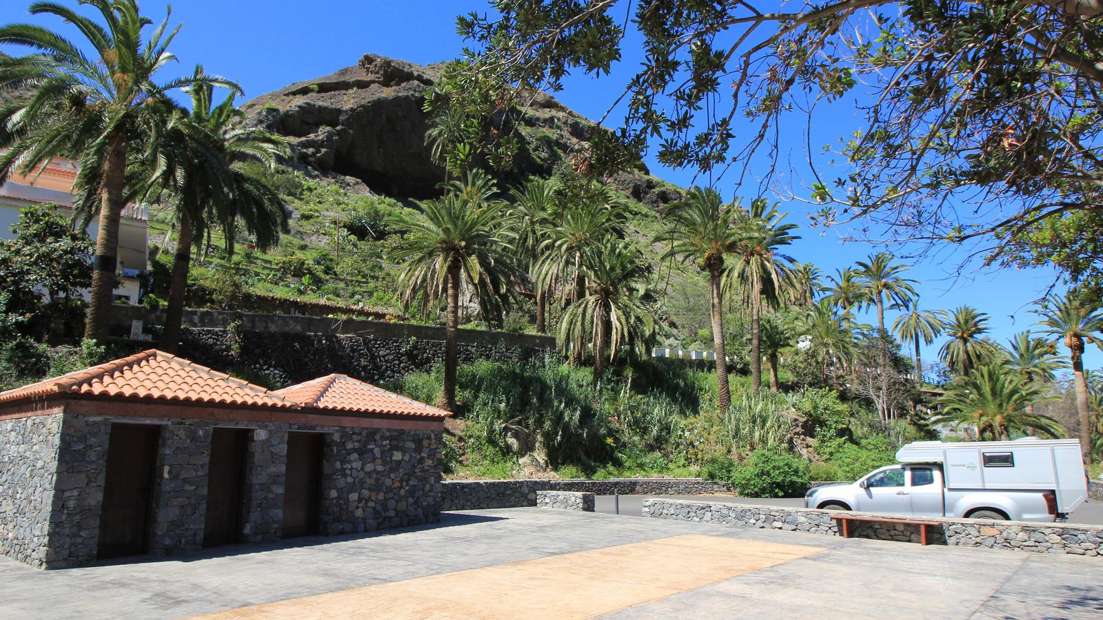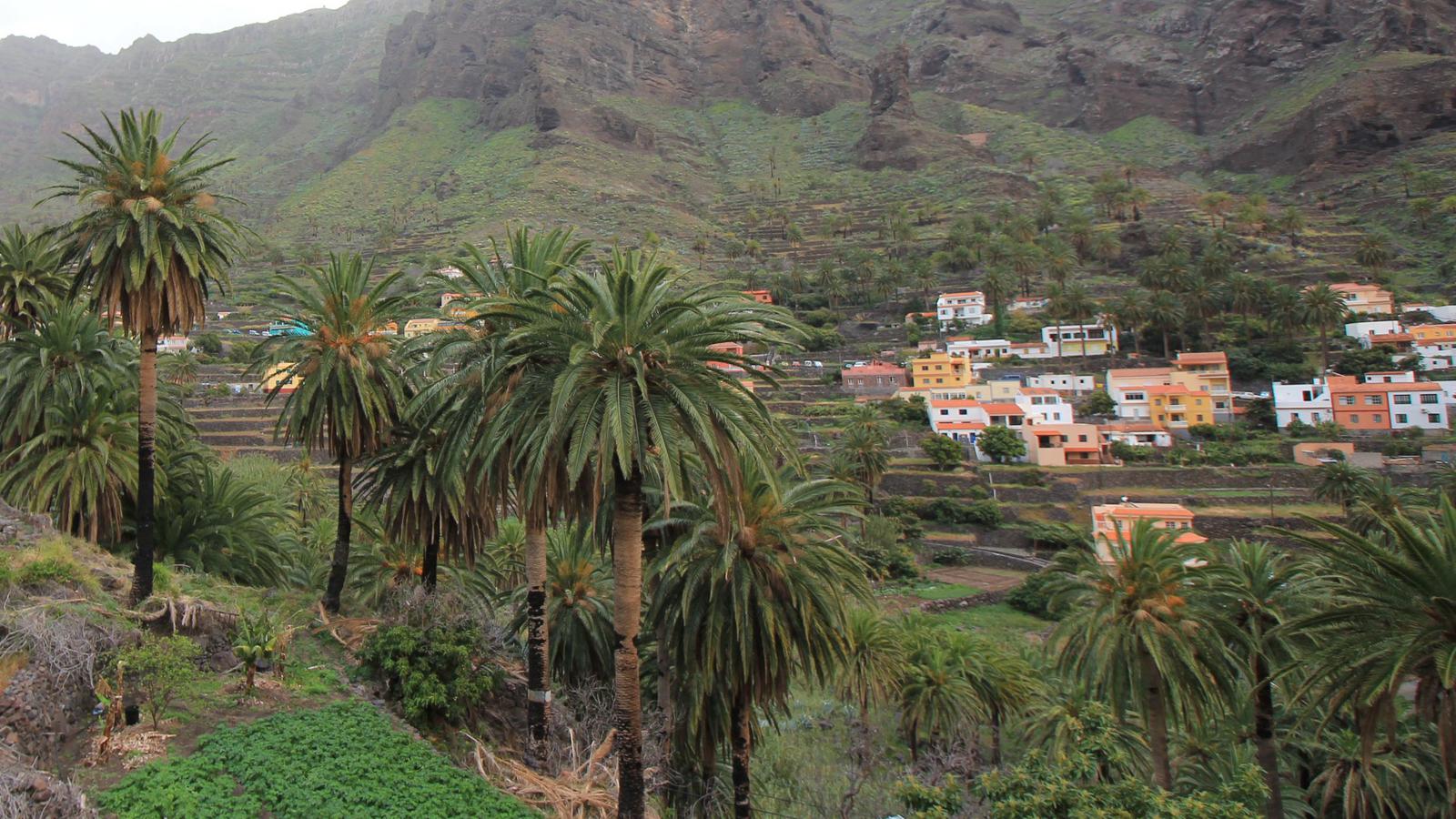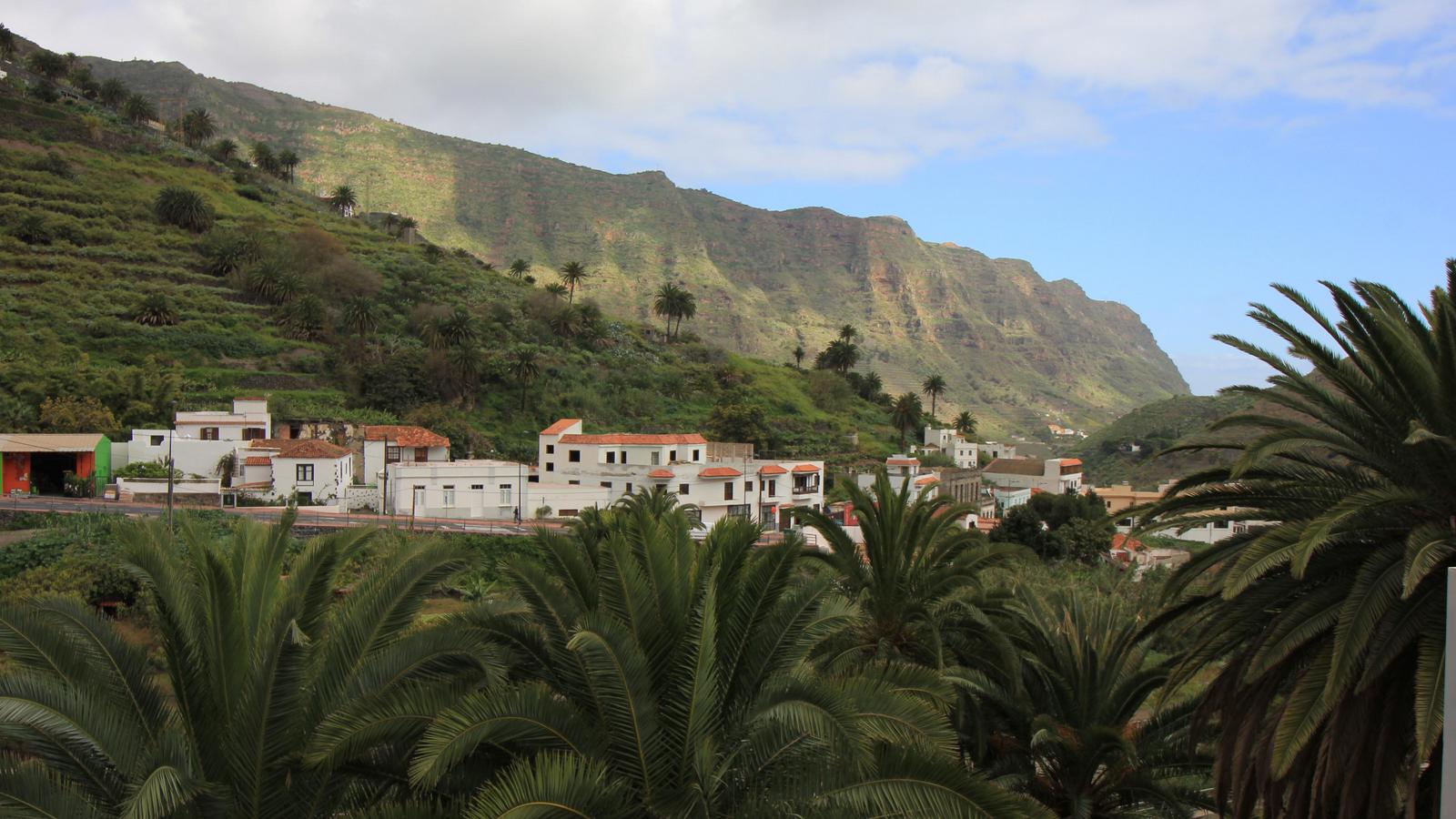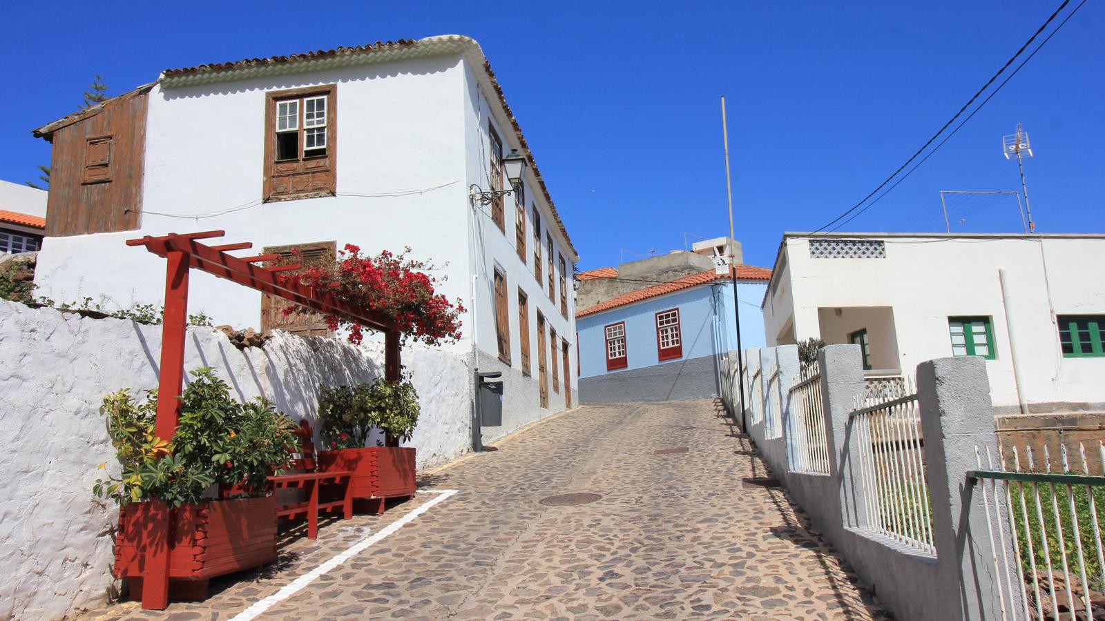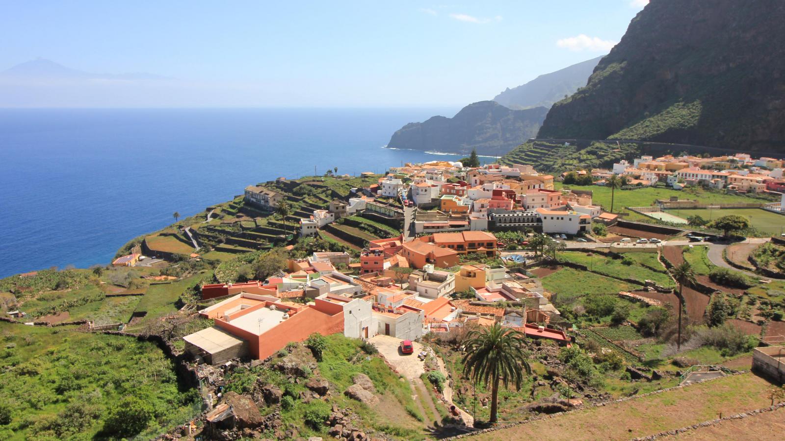 Ce village est un peu plus petit et moins étendu que Hermigua. Il se compose également de pluieurs hameaux, dispersés sur un plateau au-dessus de l'océan. On retrouve ici aussi quelques bananeraies ainsi que de nombreuses terrasses de cultures, le plus souvent en friche. Les ruelles sont agréables, bordées de maisons canariennes bien entretenues, seule l'église dénote avec une toiture en dôme qui me la fait prendre pour une structure démontable en arrivant par la route par le dessus.