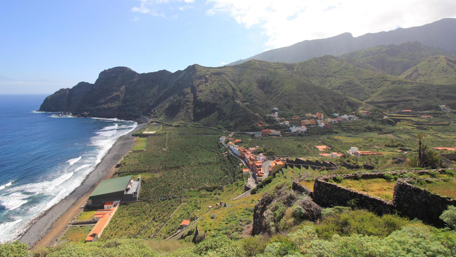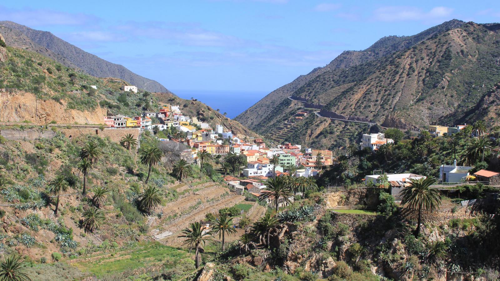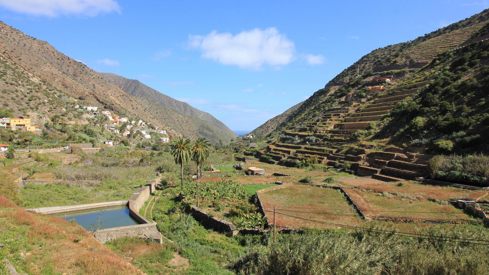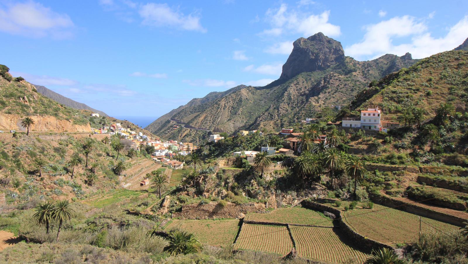 Ce village est un peu plus petit et moins étendu que Hermigua. Il se compose également de pluieurs hameaux, dispersés sur un plateau au-dessus de l'océan. On retrouve ici aussi quelques bananeraies ainsi que de nombreuses terrasses de cultures, le plus souvent en friche. Les ruelles sont agréables, bordées de maisons canariennes bien entretenues, seule l'église dénote avec une toiture en dôme qui me la fait prendre pour une structure démontable en arrivant par la route par le dessus.