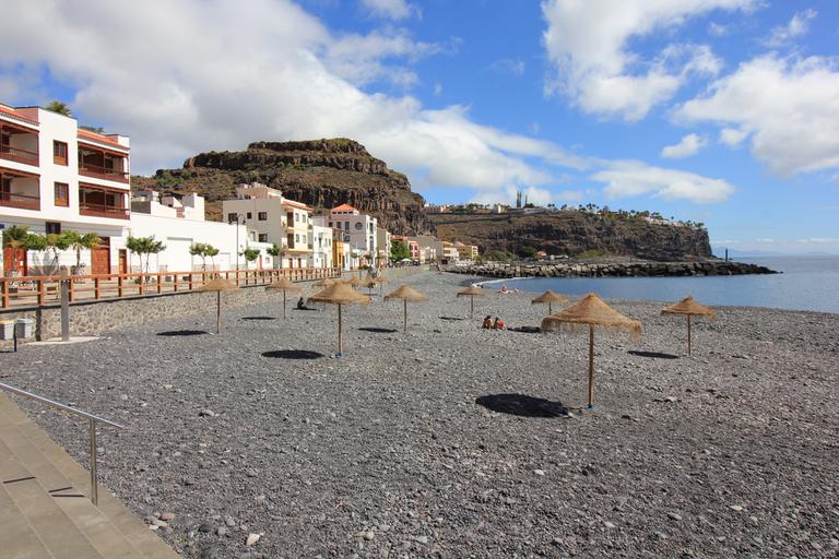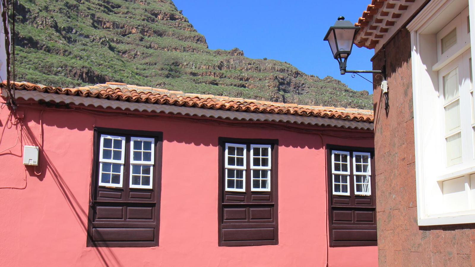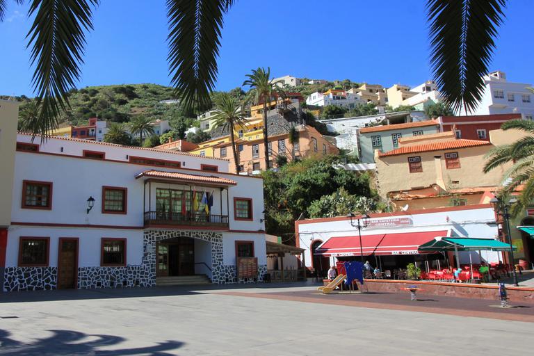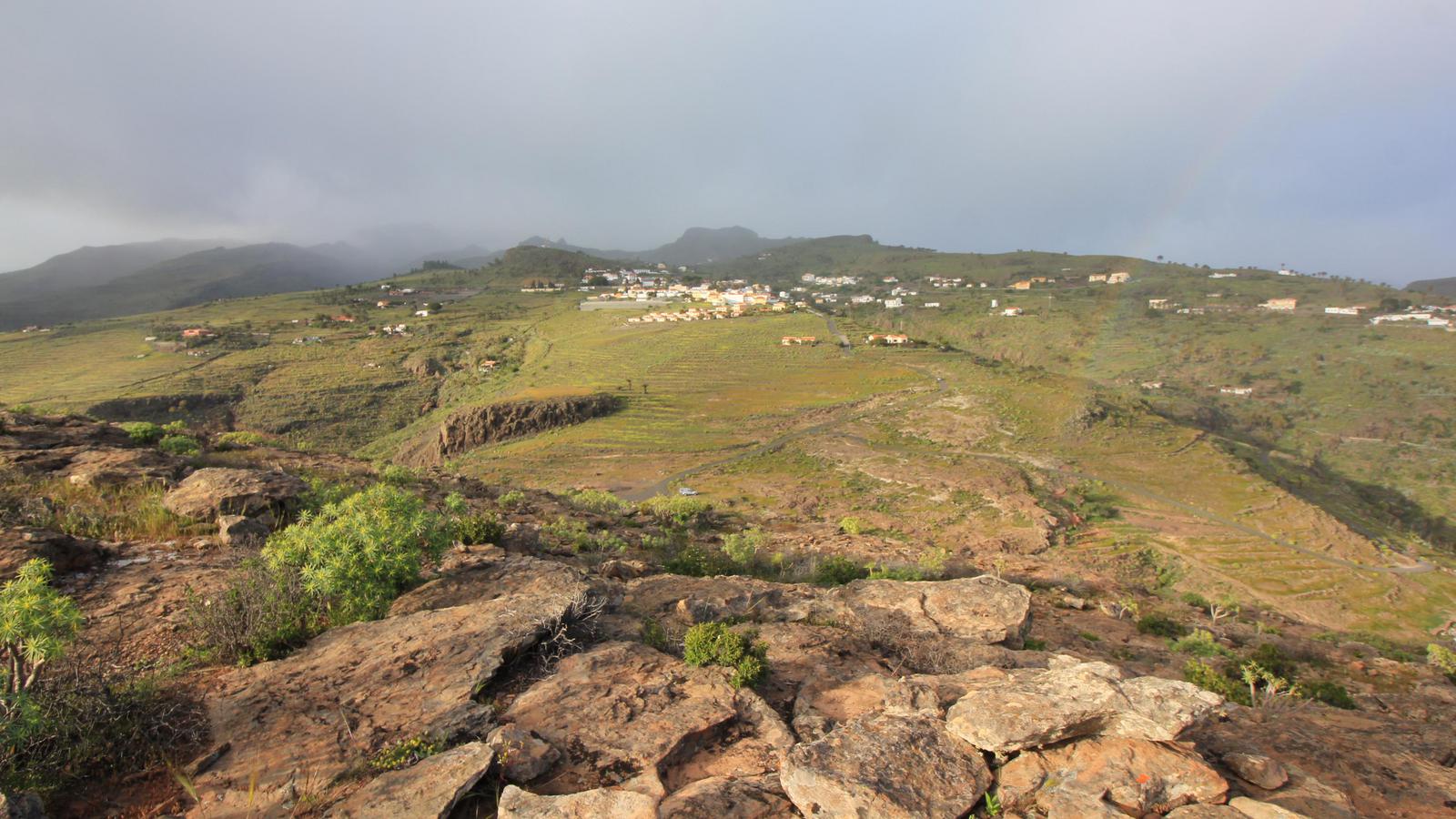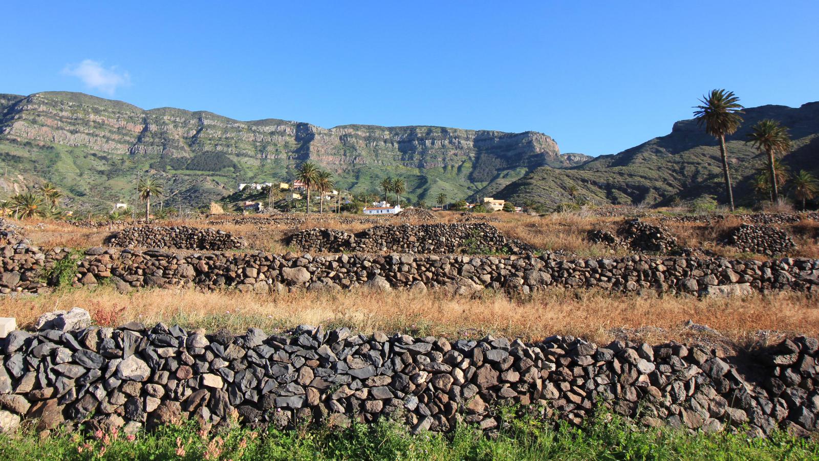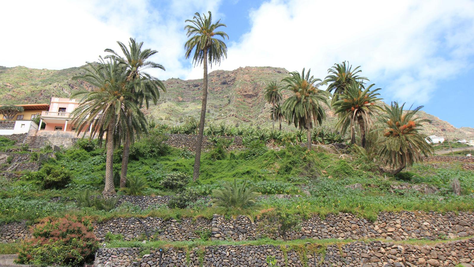 Ce village est un peu plus petit et moins étendu que Hermigua. Il se compose également de pluieurs hameaux, dispersés sur un plateau au-dessus de l'océan. On retrouve ici aussi quelques bananeraies ainsi que de nombreuses terrasses de cultures, le plus souvent en friche. Les ruelles sont agréables, bordées de maisons canariennes bien entretenues, seule l'église dénote avec une toiture en dôme qui me la fait prendre pour une structure démontable en arrivant par la route par le dessus.