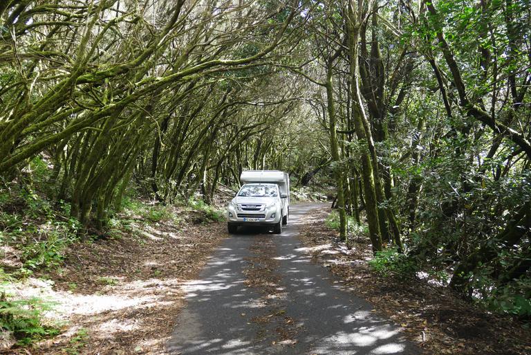 Néanmoins, nous devons faire nos pleins et vidange, nous décidons de retourner à San Sebastian où se trouve l'unique aire de service de l'île. Pour ce faire, nous rejoignons la GM-2 en basculant sur l'autre versant de la vallée, en suivant la crête entre deux barrancos couverts de cultures en terrasse et de palmiers. Pas de changement par rapport aux jours précédents, le Parque de Garajonay est dans un épais brouillard et nous ne voyons rien des différents points de vue.