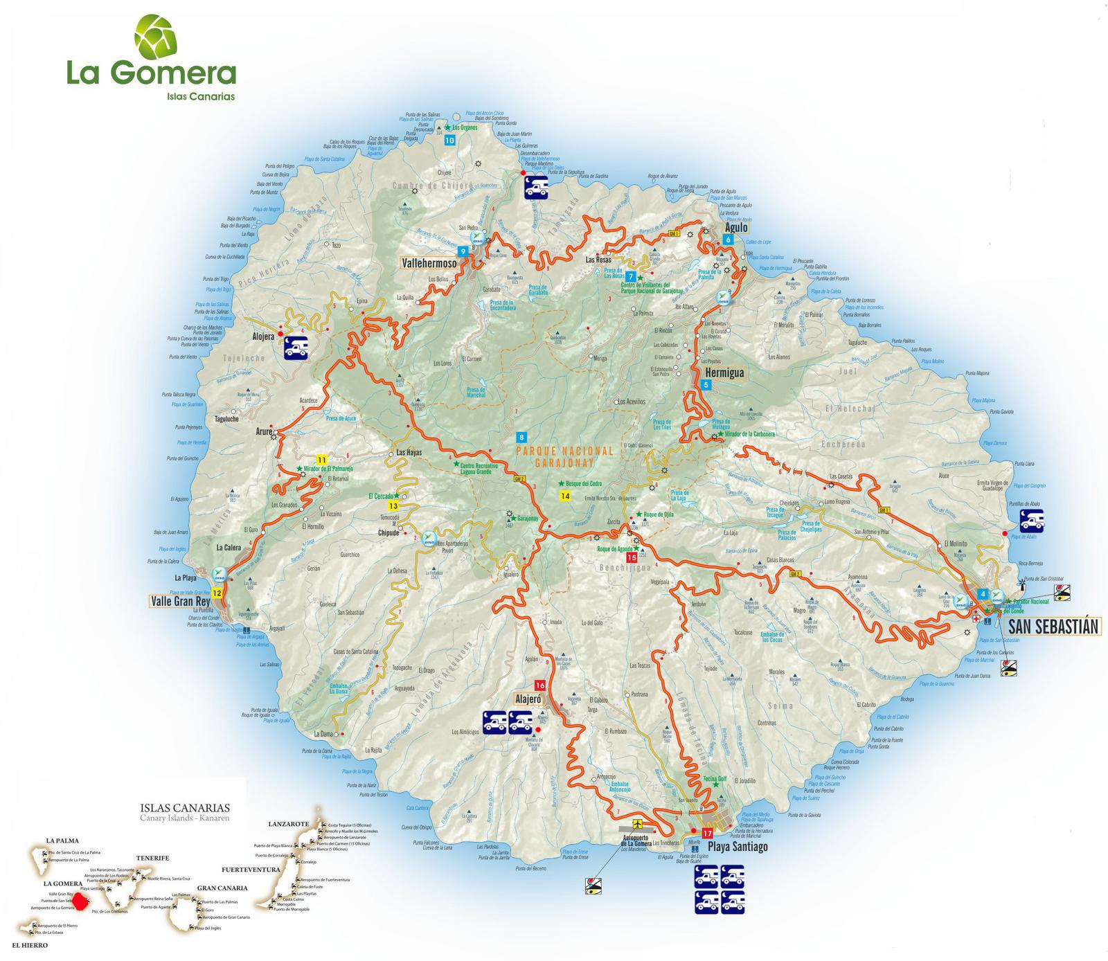 La Gomera est la deuxième plus petite île de l'archipel, par sa dimension et son nombre d'habitants. Son point culminant est l'Alto de Garajonay à 1 487m d'altitude. Elle est de forme presque circulaire, d'une trentaine de kilomètres pour son plus grand diamètre. Elle compte 23 000 habitants.