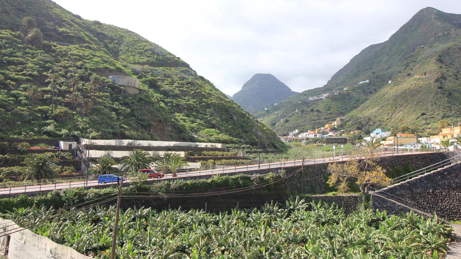 Après avoir traversé des montagnes et franchi un tunnel, la GM-1 redescend vers l'océan. Le ciel bleu a disparu et c'est dans le brouillard que nous découvrons les premières maisons de Hermigua. Ce village, bâti en étage et très étendu, compte 2000 habitants. Il occupe les deux versants de la vallée, les flancs sont occupés par des maisons blanches entourées de cultures en terrasse, tandis que le fond est réservé aux bananeraies.