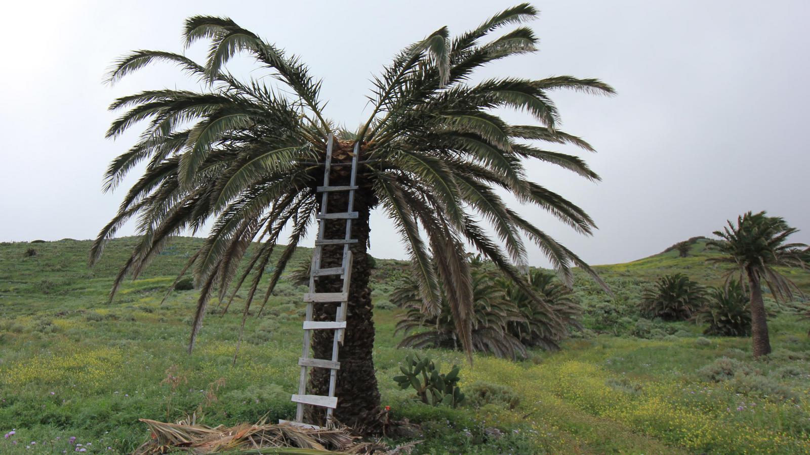 Nous remontons la route de l'aller, nous apercevons déjà la brume sur les sommets. Nous faisons une halte à mi-chemin, près d'un cimetière. Un palmier a été taillé et l'échelle est restée sur l'arbre... Quel travail périlleux, d'autant que tous les palmiers sont très loin d'être aussi accessibles que celui-ci!