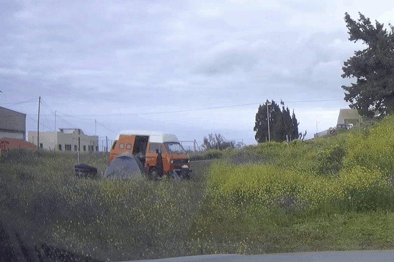 L'aire en question est un champ mis à la disposition des voyageurs par la commune. Un seul van y était installé lorsque nous sommes arrivés, mais les vanlifers suisses se sont judicieusement posés en travers du chemin d'accès pour être sûr de ne pas être dérangés par d'éventuels voisins et ont bien occupé l'espace avec tout ce qu'ils avaient sous la main... Nous avons fait un peu de tout-terrain et les avons contournés. Egoïsme ou mesures covid ?