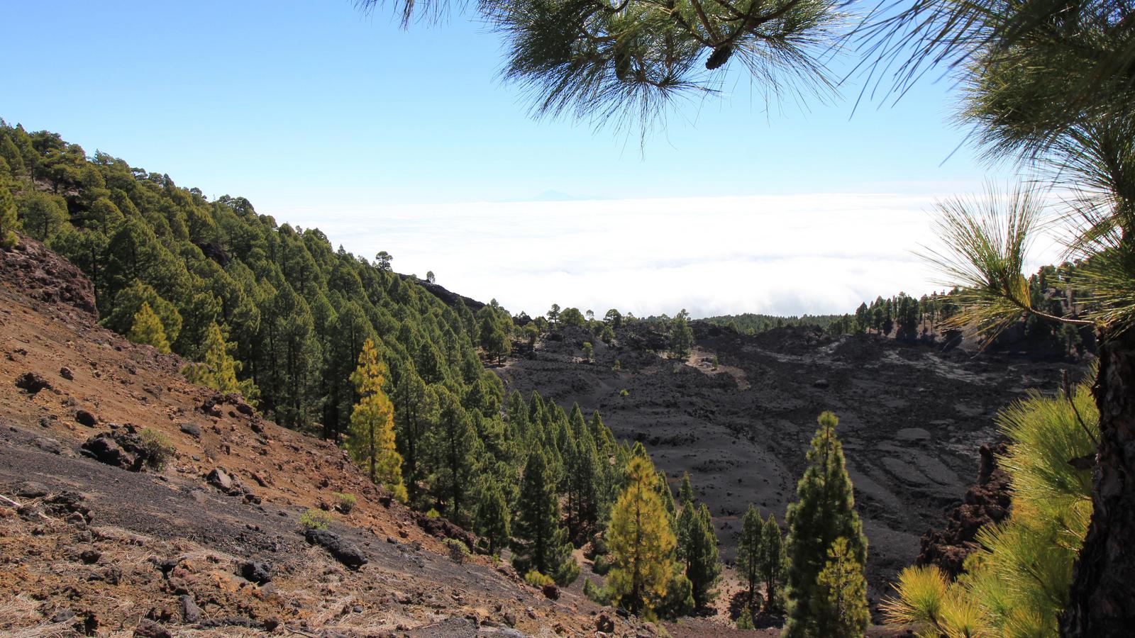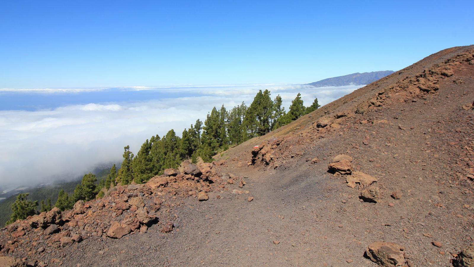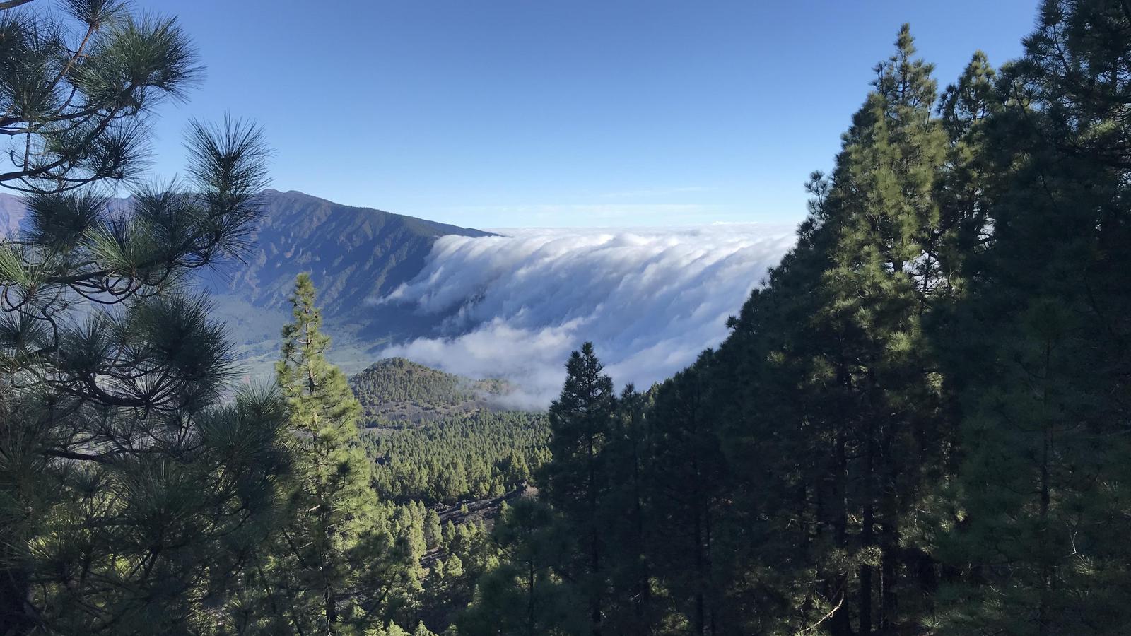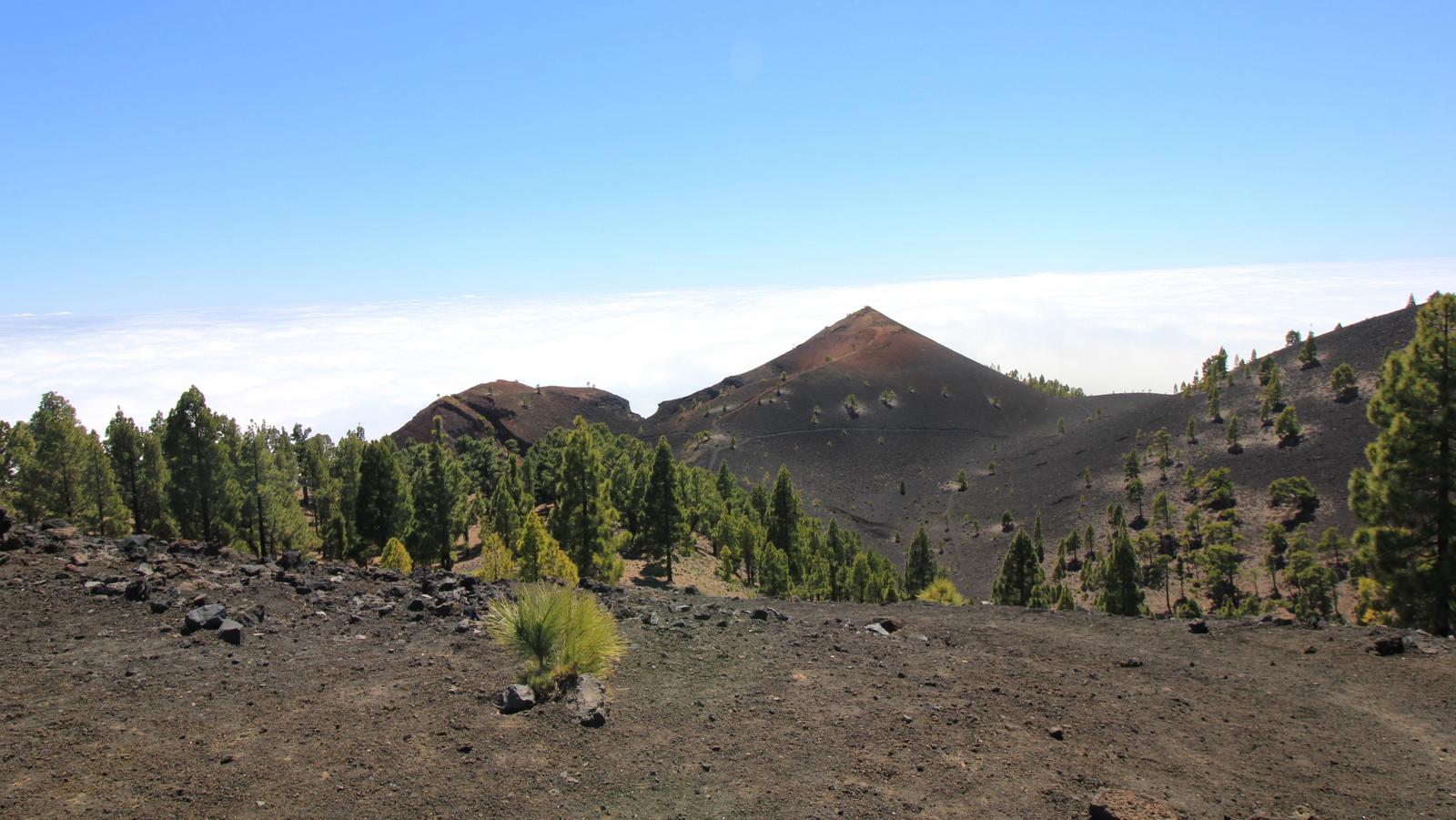 Nous restons un long moment à admirer ce phénomène d'une grande beauté puis poursuivons notre ascension. Peu à peu les pins se font plus rares, les premiers dômes de la chaîne de volcans apparaissent. Nous sommes entourés de nuages d'où seul émerge le Teide sur l'île voisine de Tenerife. La mer apparaît dans quelques trouées mais nous la devinons plus que nous ne la voyons.