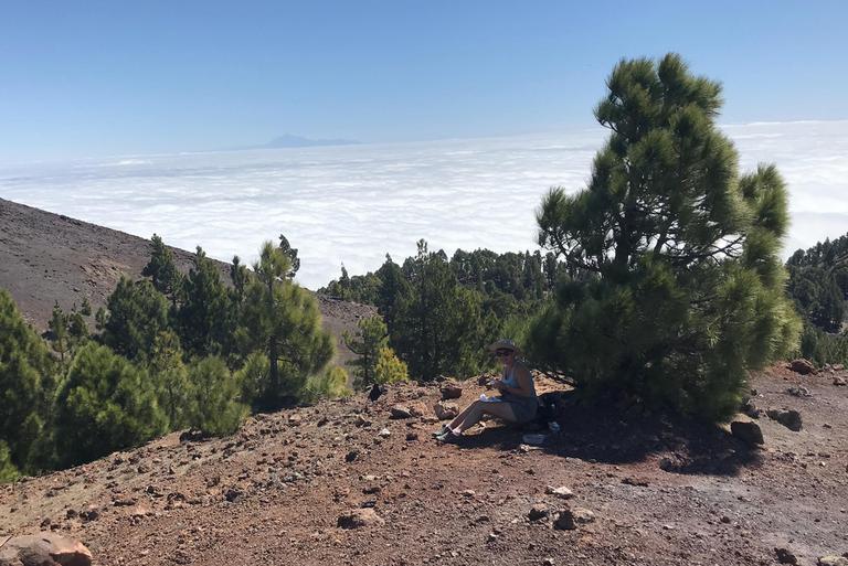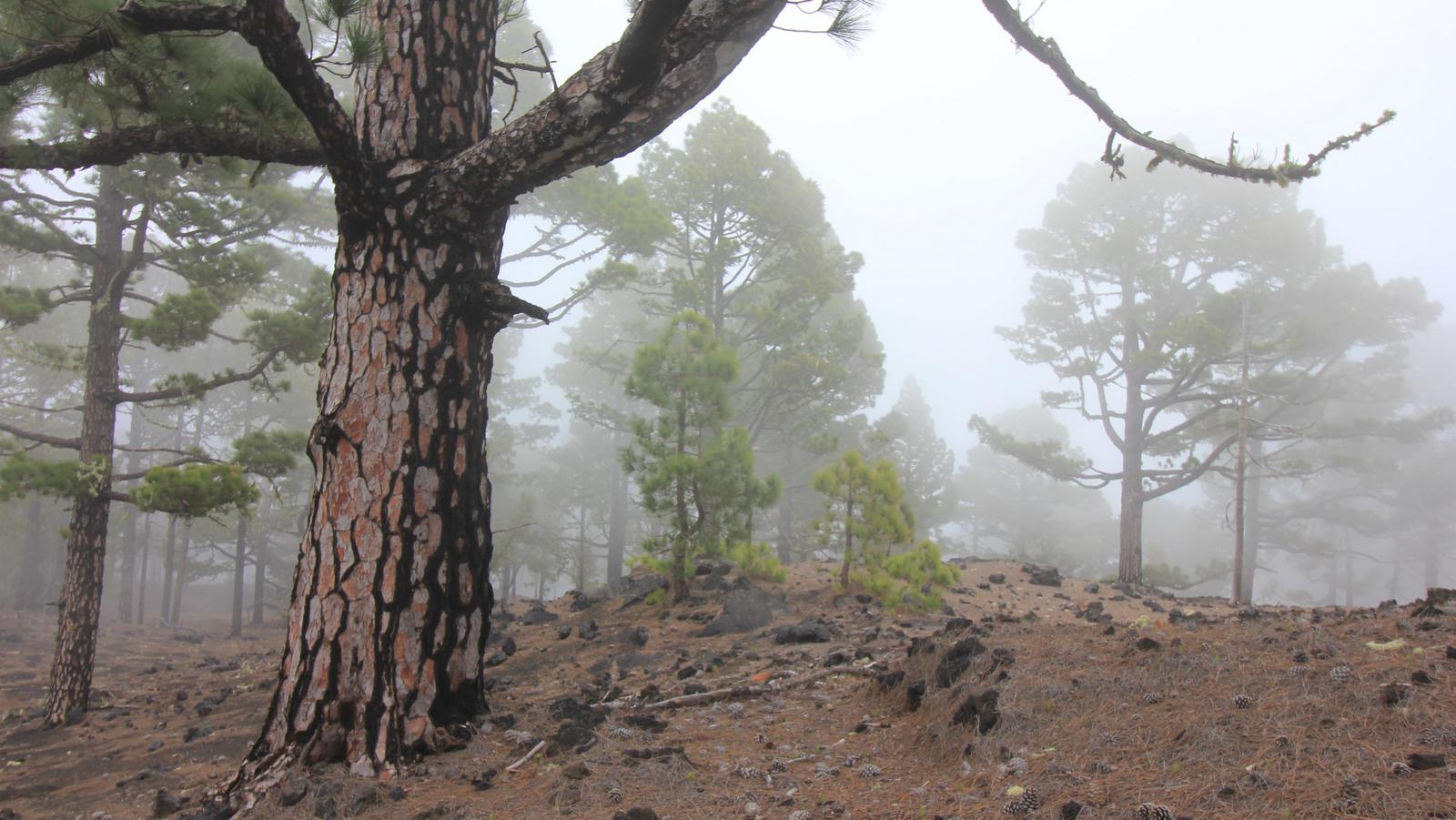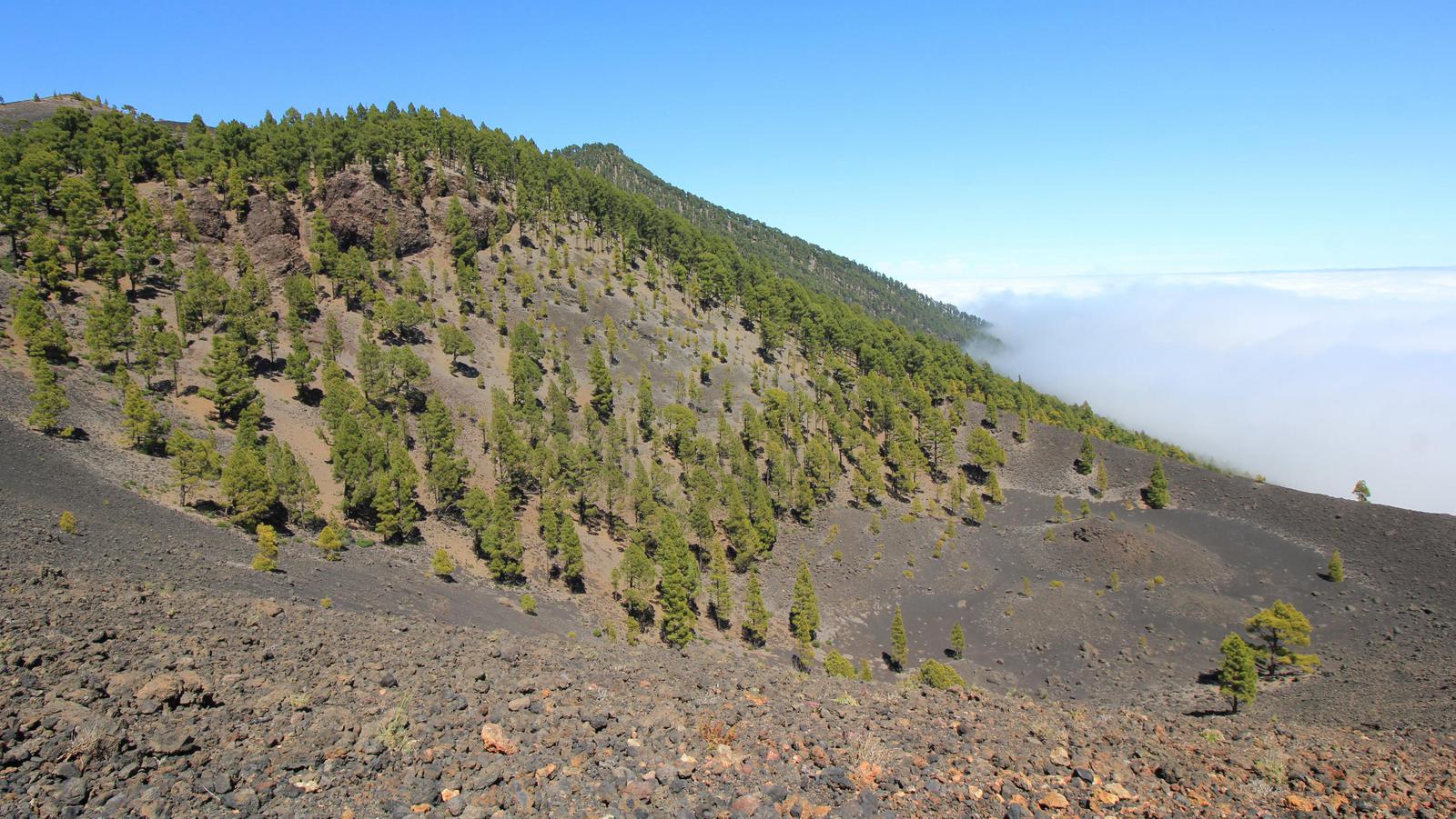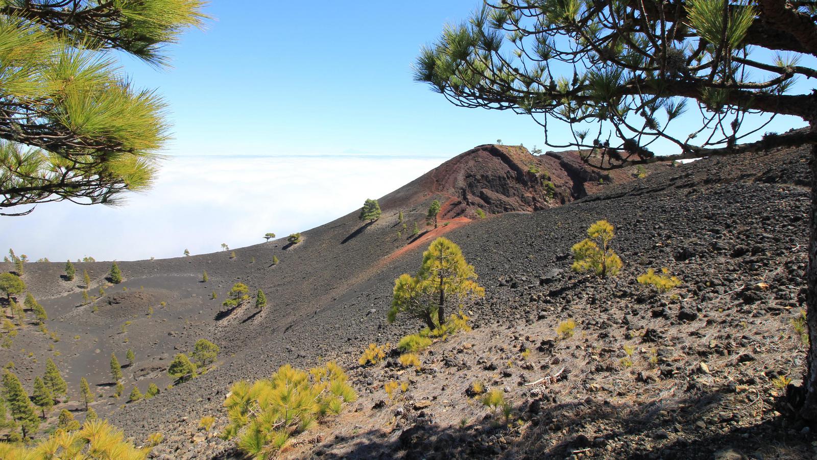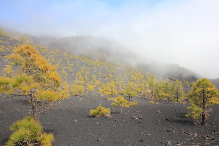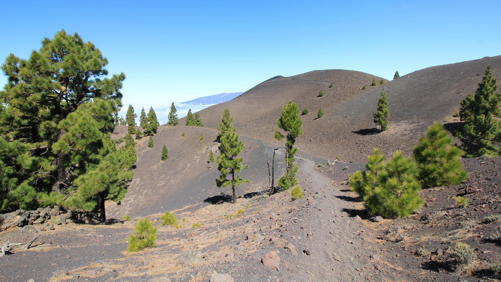 Nous restons un long moment à admirer ce phénomène d'une grande beauté puis poursuivons notre ascension. Peu à peu les pins se font plus rares, les premiers dômes de la chaîne de volcans apparaissent. Nous sommes entourés de nuages d'où seul émerge le Teide sur l'île voisine de Tenerife. La mer apparaît dans quelques trouées mais nous la devinons plus que nous ne la voyons.