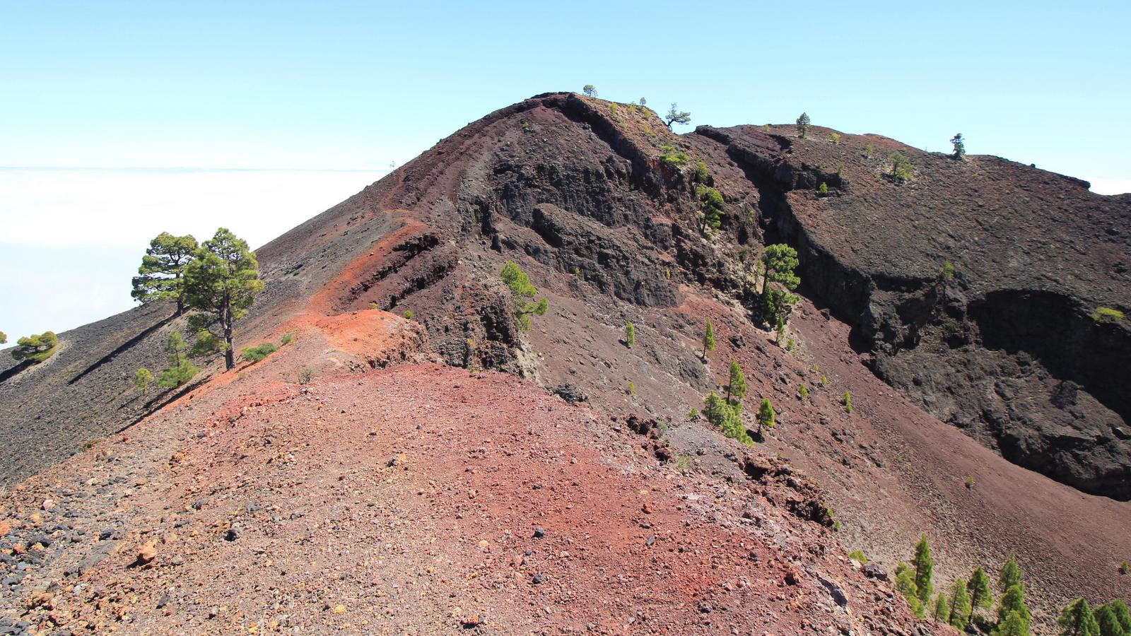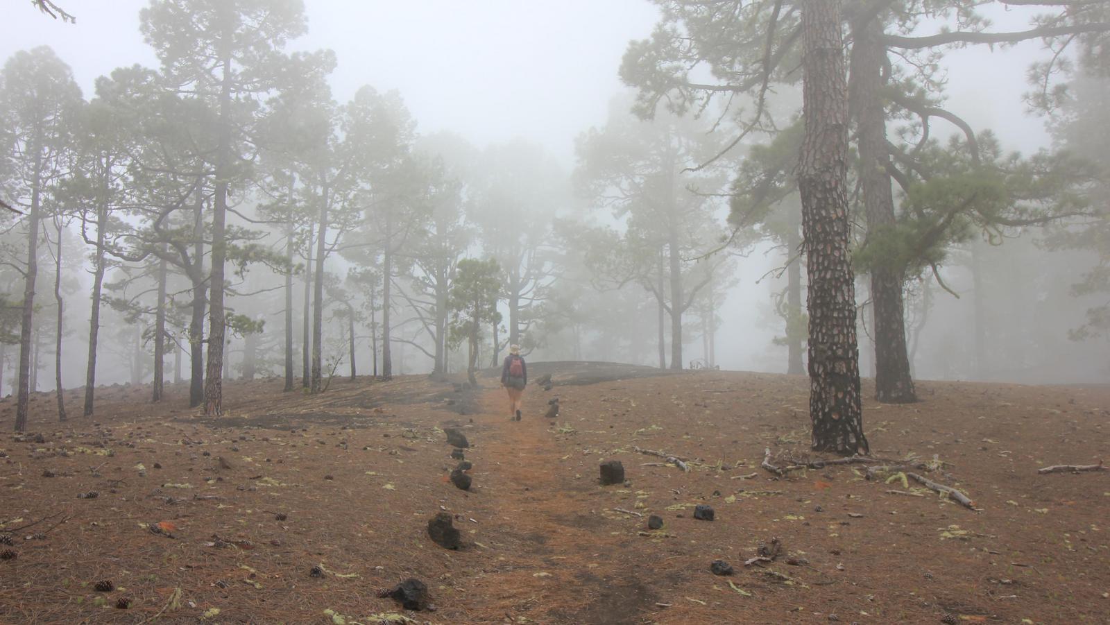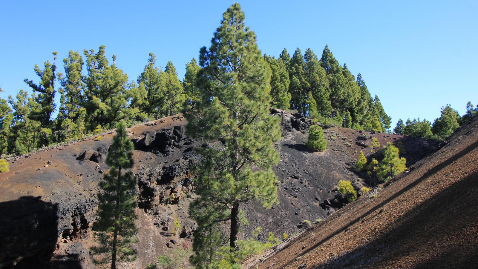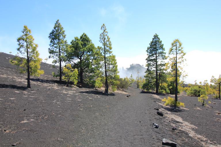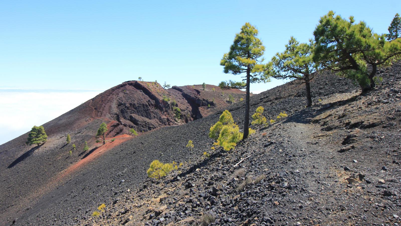 Nous restons un long moment à admirer ce phénomène d'une grande beauté puis poursuivons notre ascension. Peu à peu les pins se font plus rares, les premiers dômes de la chaîne de volcans apparaissent. Nous sommes entourés de nuages d'où seul émerge le Teide sur l'île voisine de Tenerife. La mer apparaît dans quelques trouées mais nous la devinons plus que nous ne la voyons.
