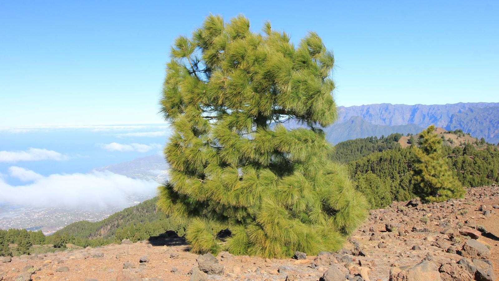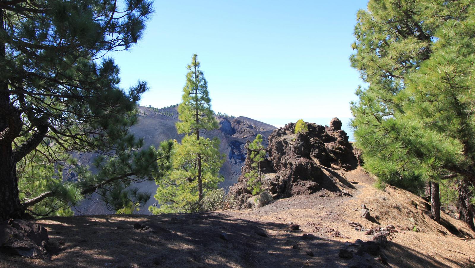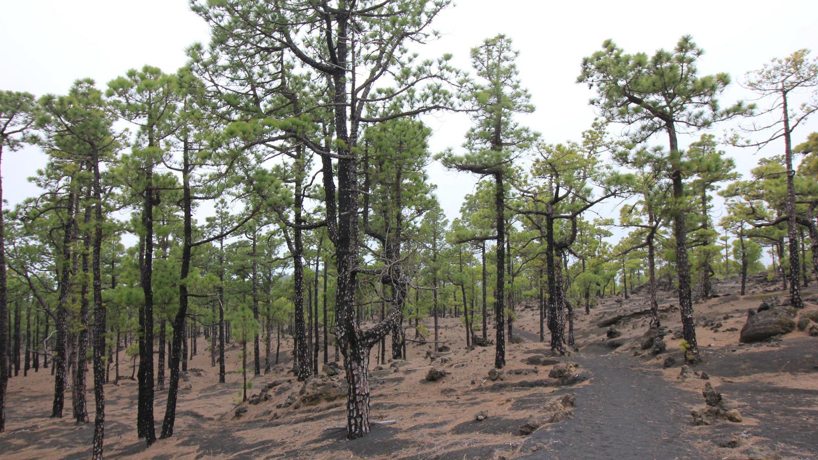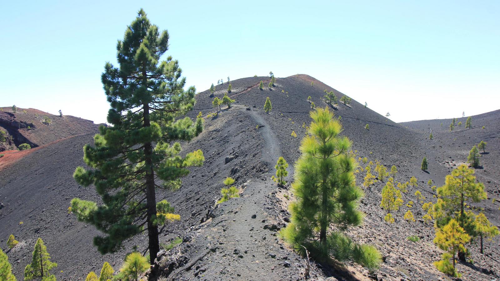 Nous restons un long moment à admirer ce phénomène d'une grande beauté puis poursuivons notre ascension. Peu à peu les pins se font plus rares, les premiers dômes de la chaîne de volcans apparaissent. Nous sommes entourés de nuages d'où seul émerge le Teide sur l'île voisine de Tenerife. La mer apparaît dans quelques trouées mais nous la devinons plus que nous ne la voyons.