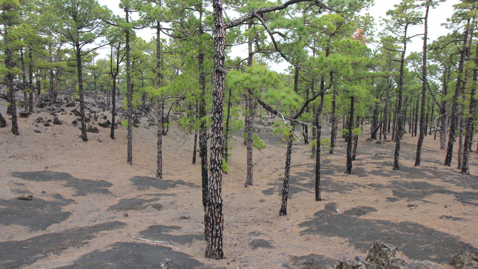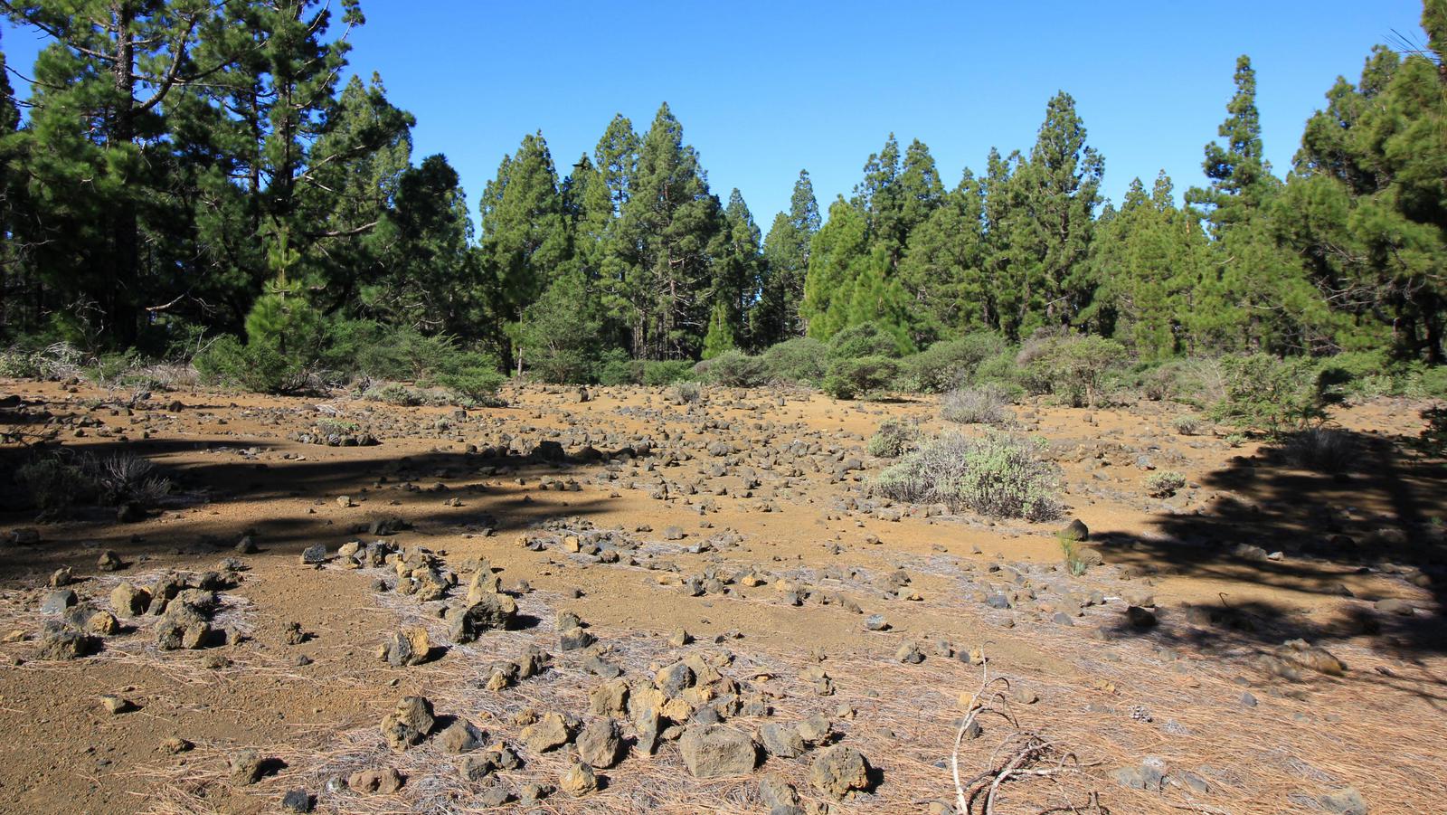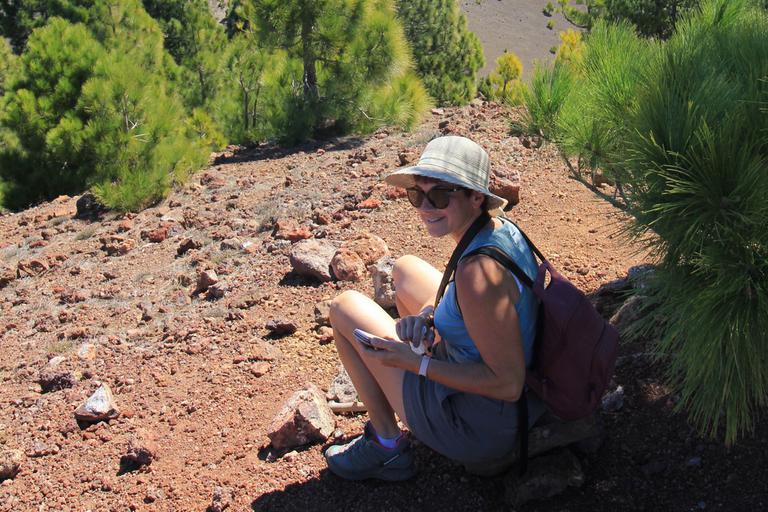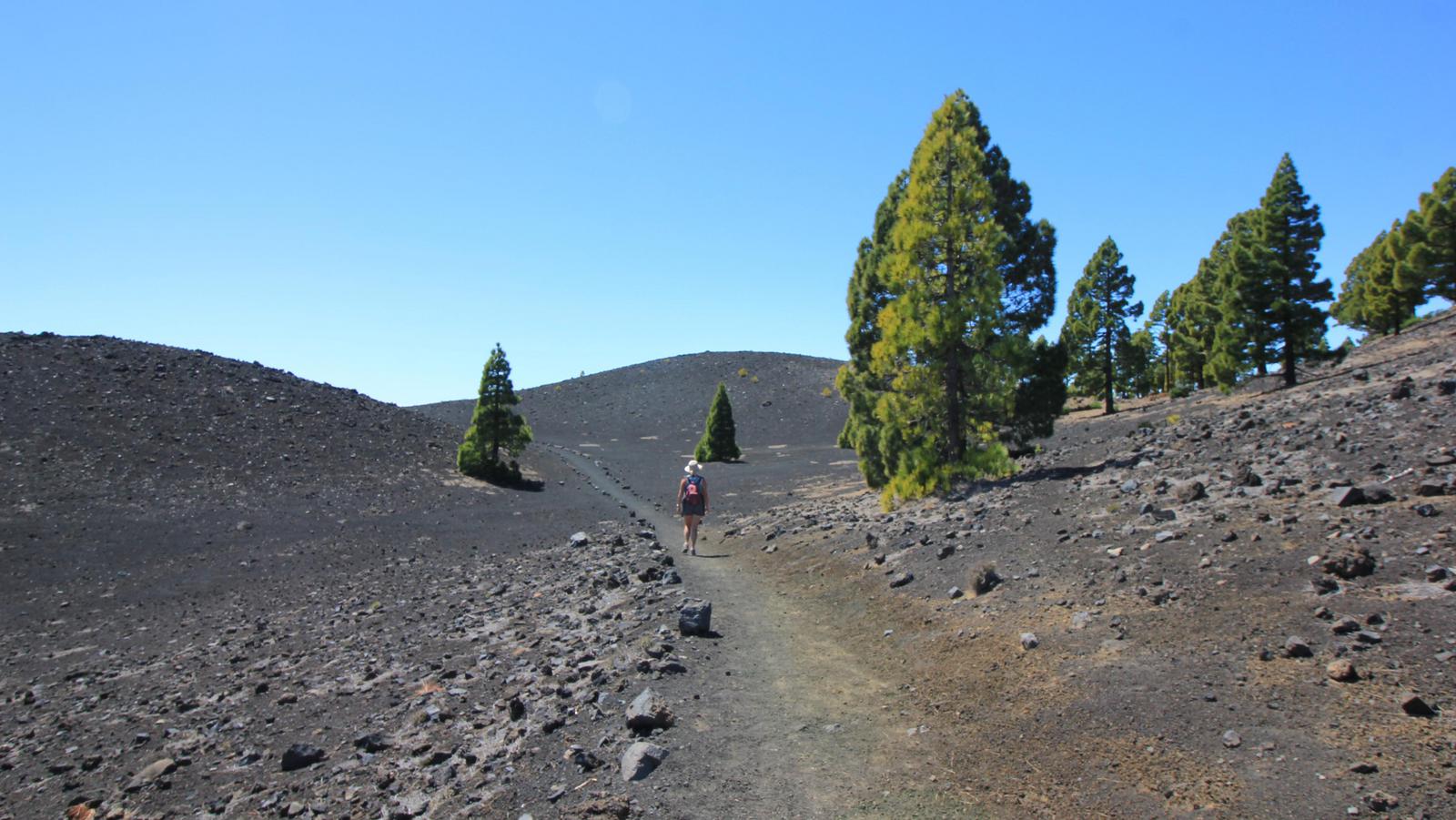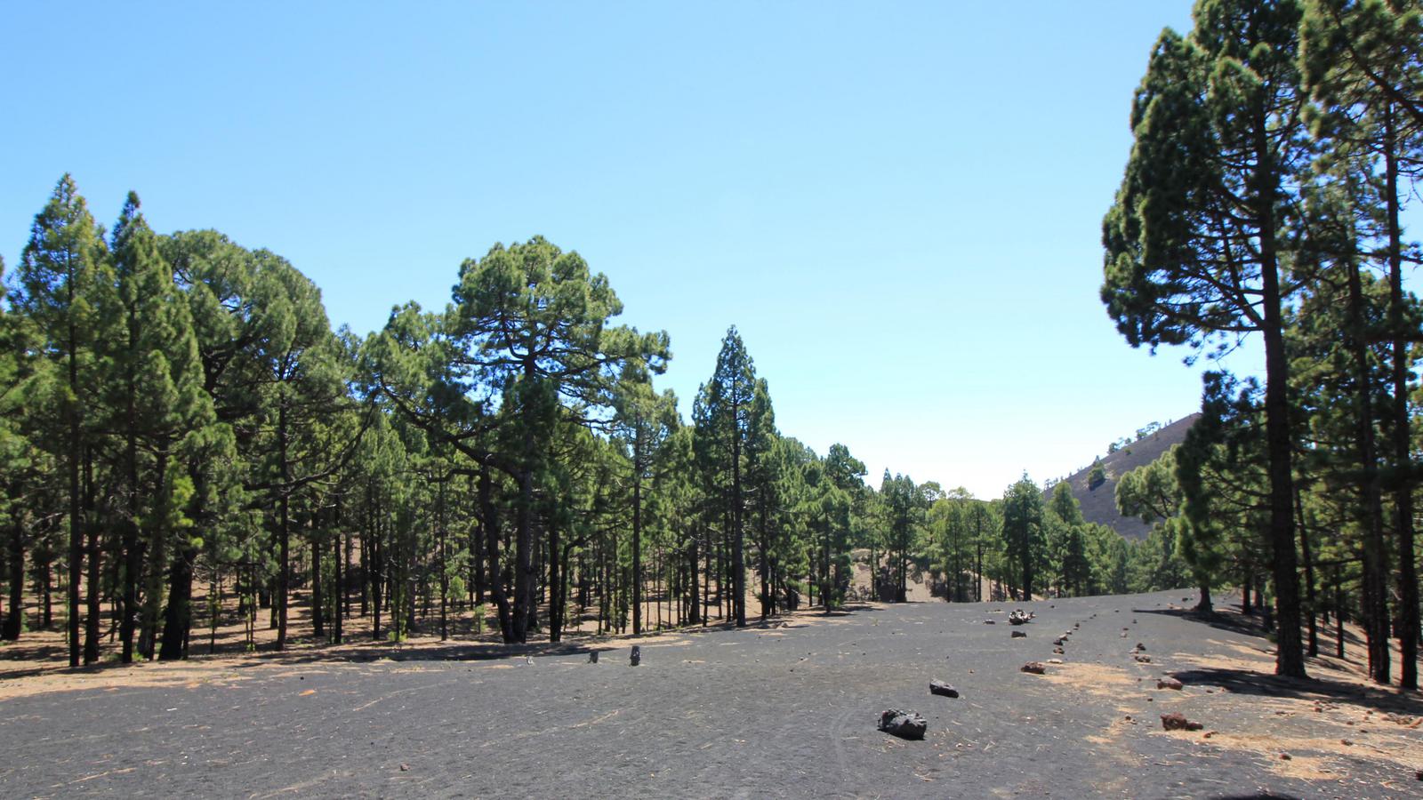 Nous restons un long moment à admirer ce phénomène d'une grande beauté puis poursuivons notre ascension. Peu à peu les pins se font plus rares, les premiers dômes de la chaîne de volcans apparaissent. Nous sommes entourés de nuages d'où seul émerge le Teide sur l'île voisine de Tenerife. La mer apparaît dans quelques trouées mais nous la devinons plus que nous ne la voyons.