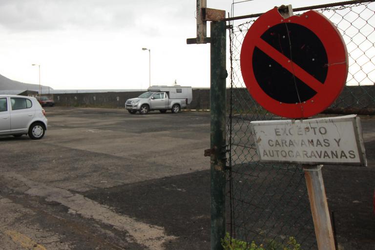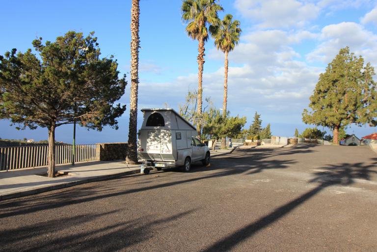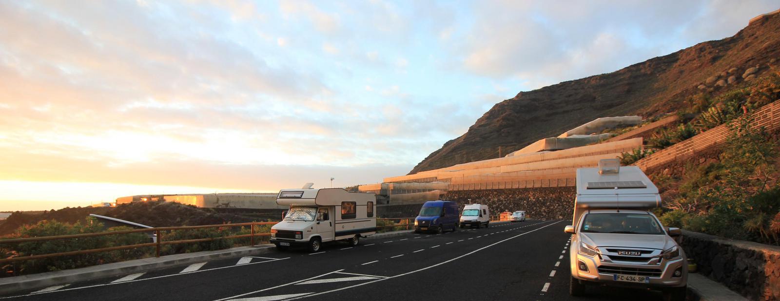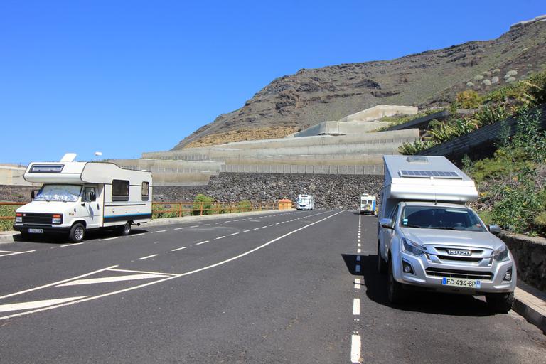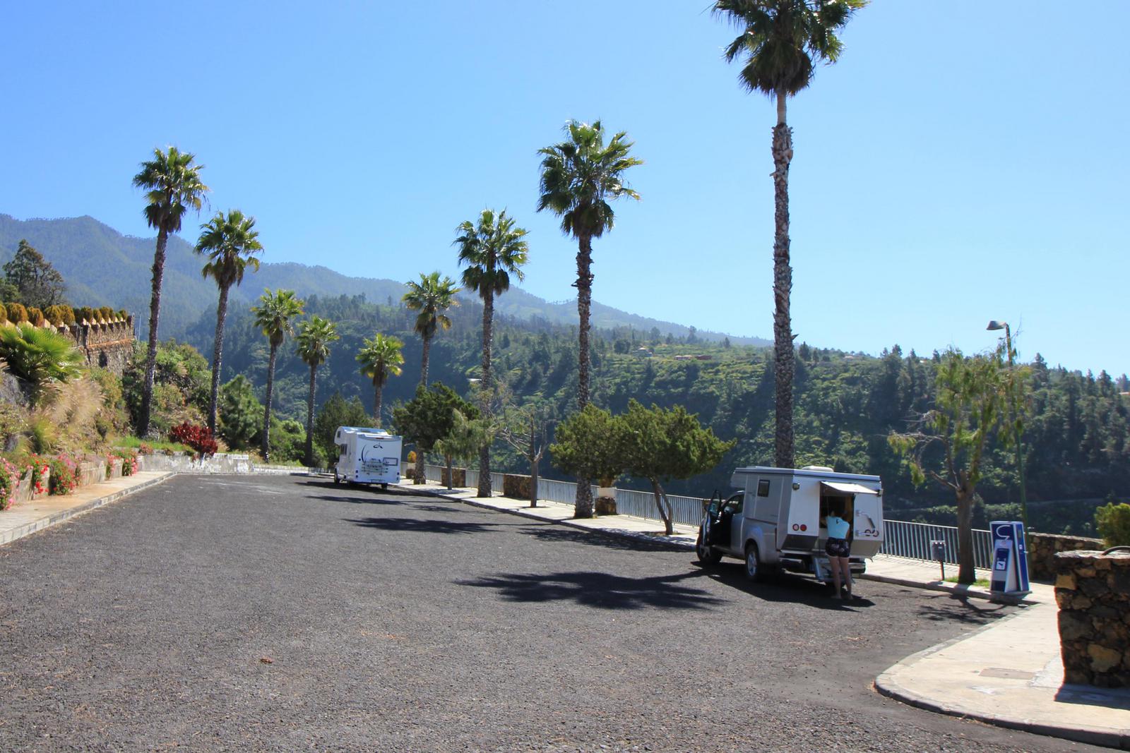Le parking en balcon sur un profond ravin est magnifique, bien que très en pente. Tous les services sont disponibles sur place et gratuitement, même la prise électrique. La nuit s'annonce tout de même un peu fraîche et il nous faut ravitailler, nous décidons de revenir faire nos courses au Lidl de Los Llanos et de retourner dormir sur la plage de Charco Verde.