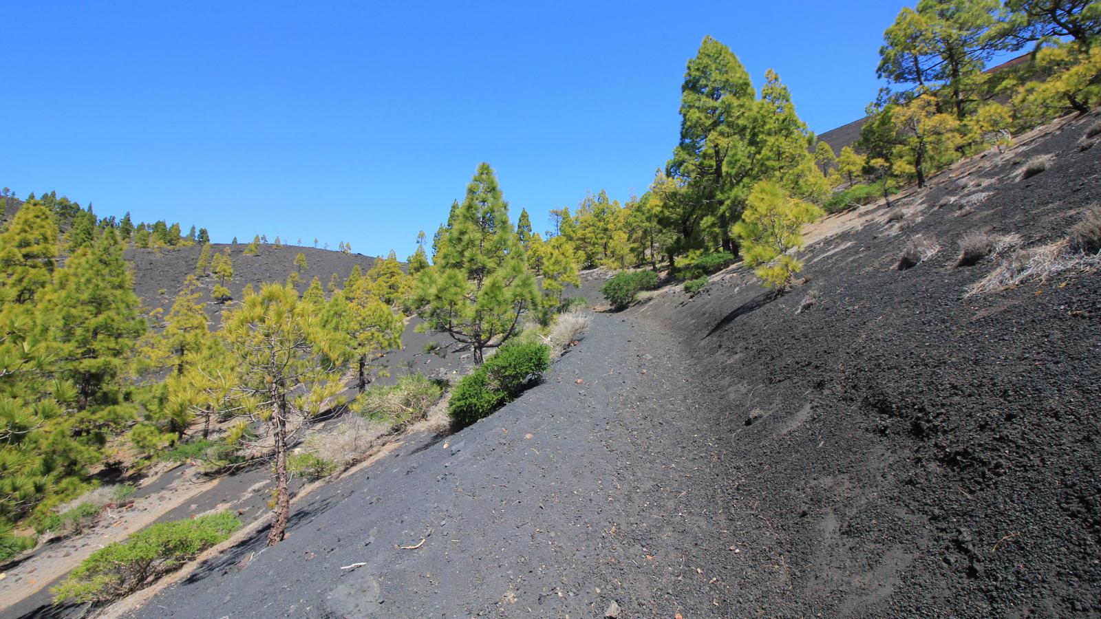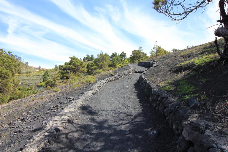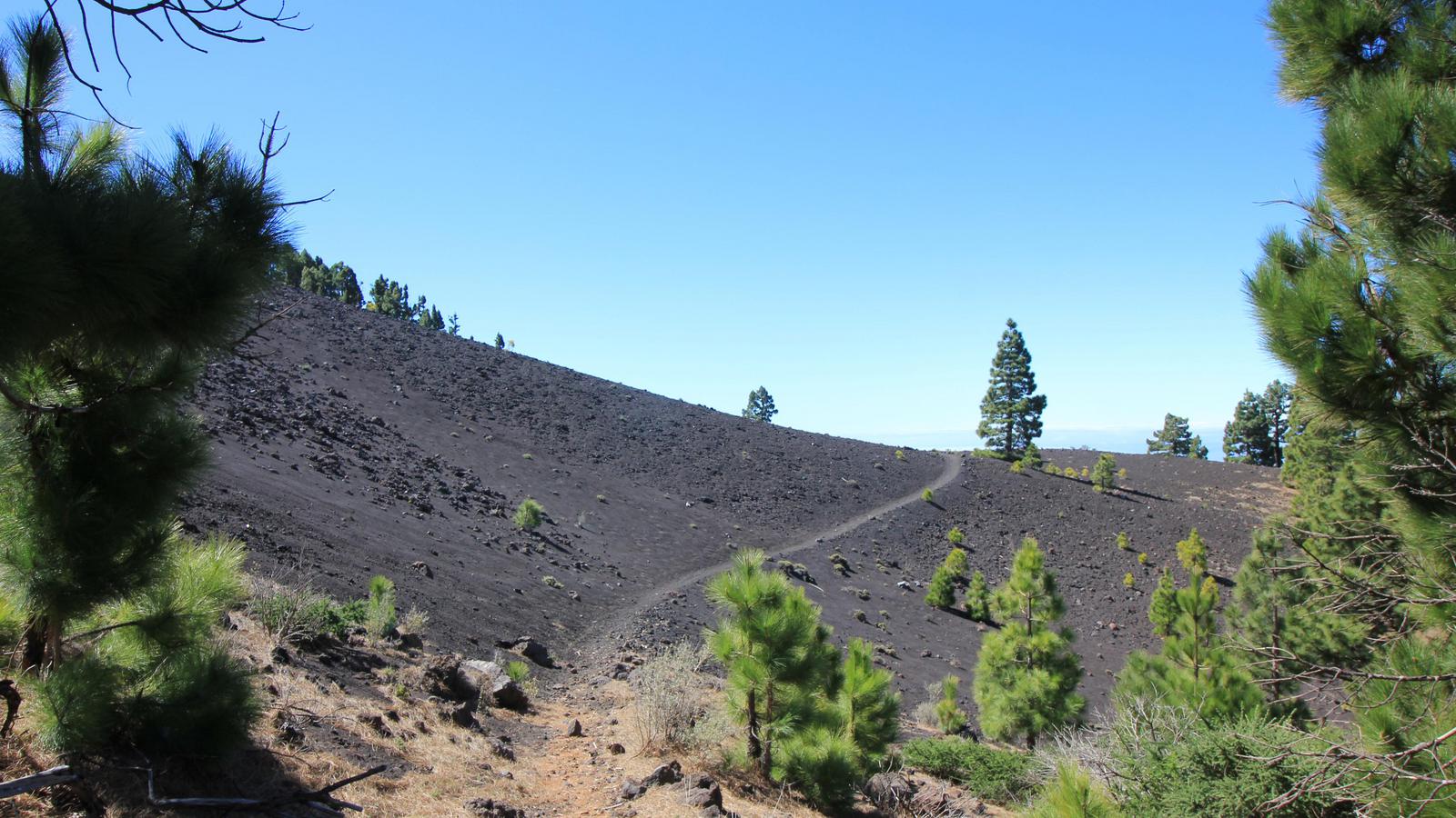Le sentier a cédé la place à une large piste conduisant au hameau de Los Quemados dont nous apercevons les premières maisons. Nous la suivons sur un bon kilomètre puis le GR bifurque en direction de Los Canarios. Nous grimpons maintenant sur le flanc du volcan de San Antonio apparu en 1677. Le sentier est abominablement raide et les quelques lacets qui nous sont octroyés semblent paradoxalement encore accentuer la difficulté. La couche de fins graviers est épaisse, nos pieds s'enfoncent et dérapent, c'est épuisant.