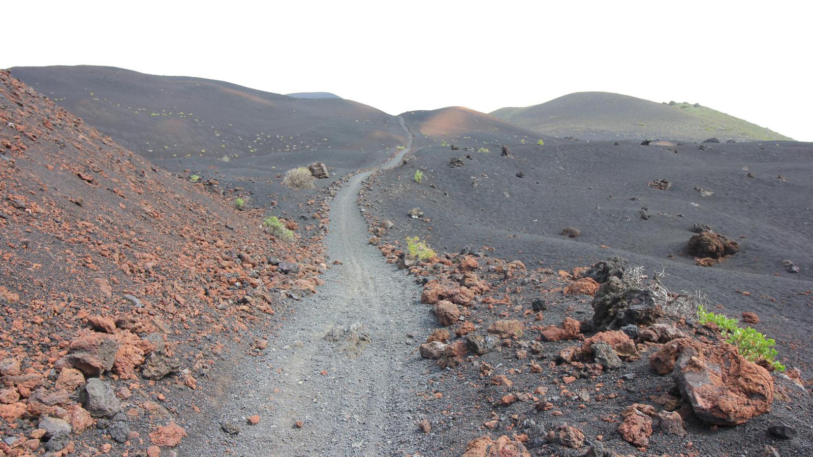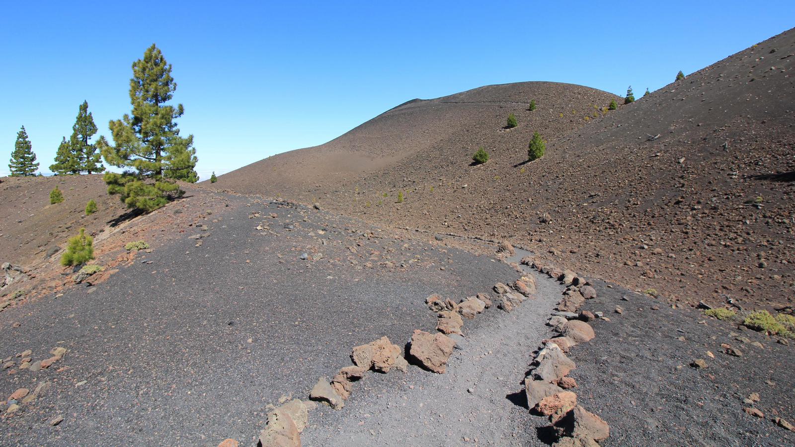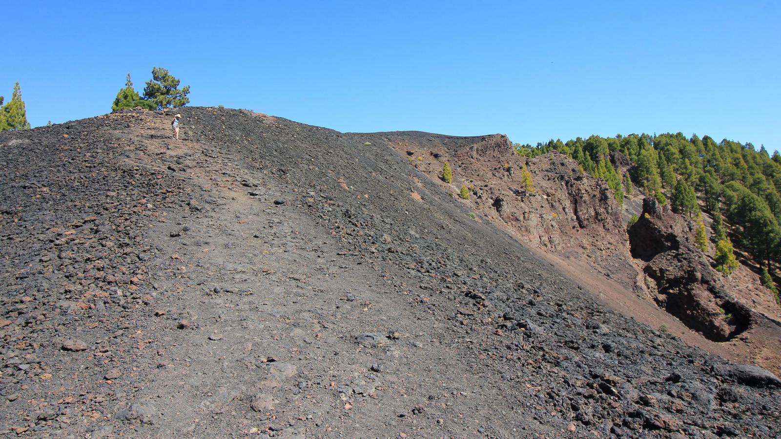 Le sentier a cédé la place à une large piste conduisant au hameau de Los Quemados dont nous apercevons les premières maisons. Nous la suivons sur un bon kilomètre puis le GR bifurque en direction de Los Canarios. Nous grimpons maintenant sur le flanc du volcan de San Antonio apparu en 1677. Le sentier est abominablement raide et les quelques lacets qui nous sont octroyés semblent paradoxalement encore accentuer la difficulté. La couche de fins graviers est épaisse, nos pieds s'enfoncent et dérapent, c'est épuisant.