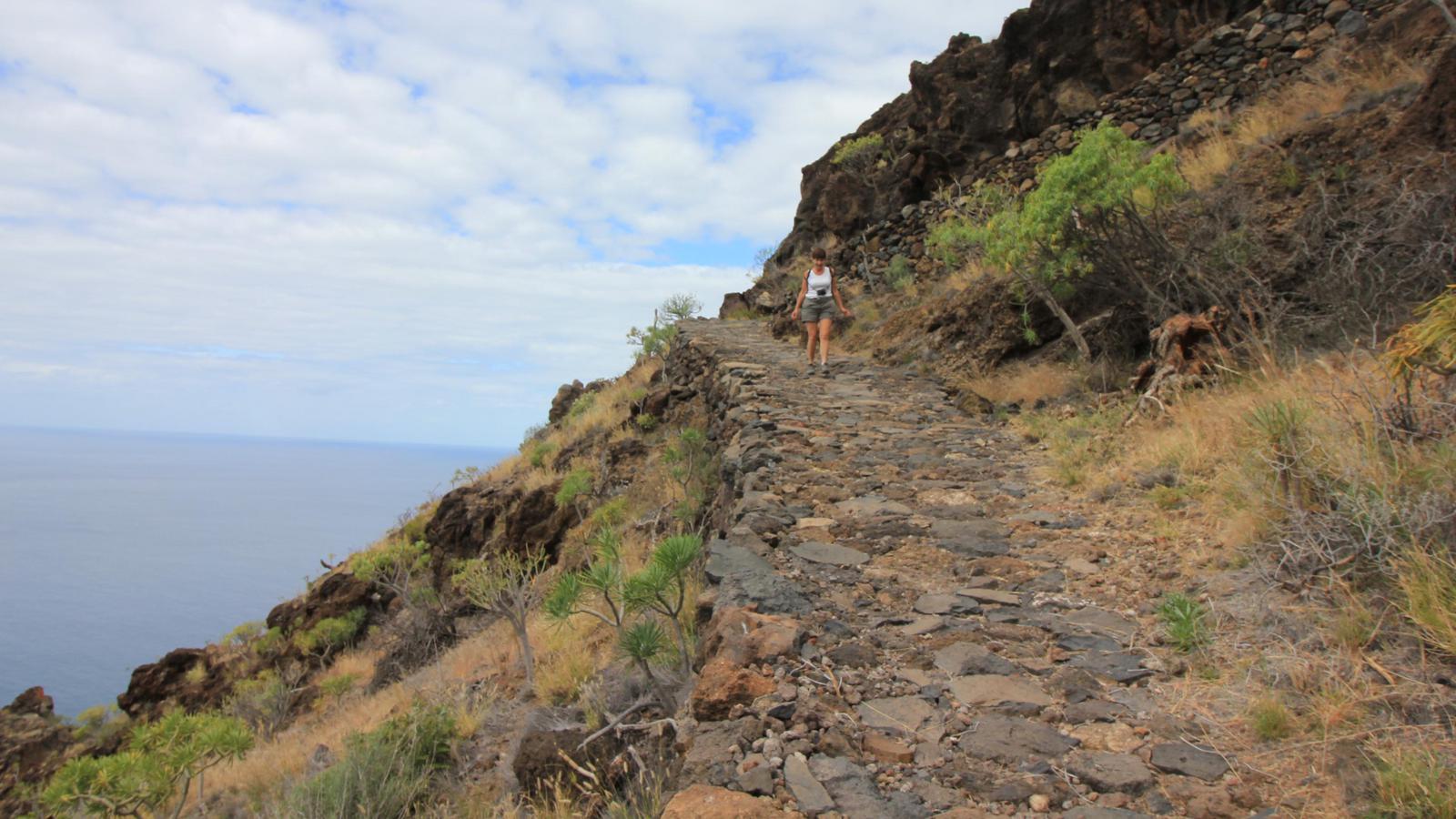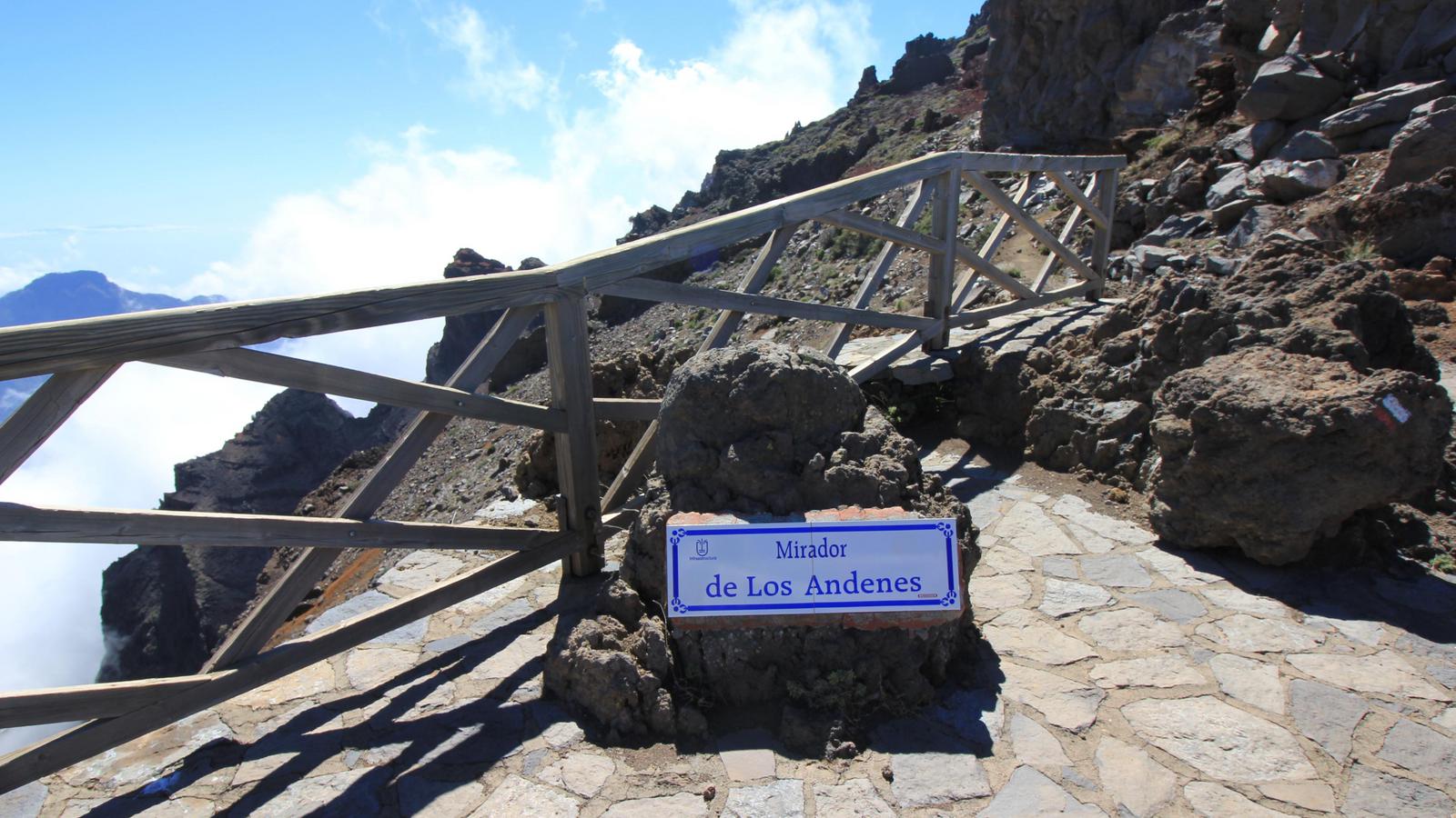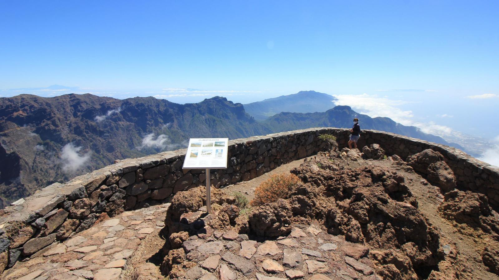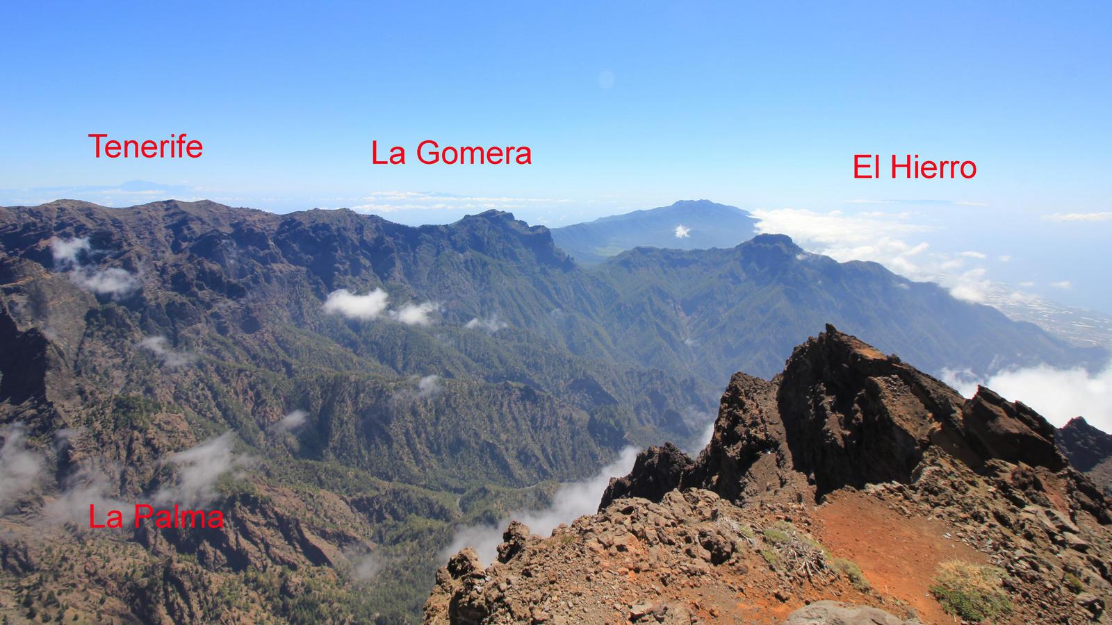 Un sentier vertigineux nous mène aux différentes plateformes, la plus éloignée et la plus basse est une avancée naturelle dans la caldera d'où nous apercevons les trois îles voisines, Tenerife et le Teide, La Gomera et El Hierro.