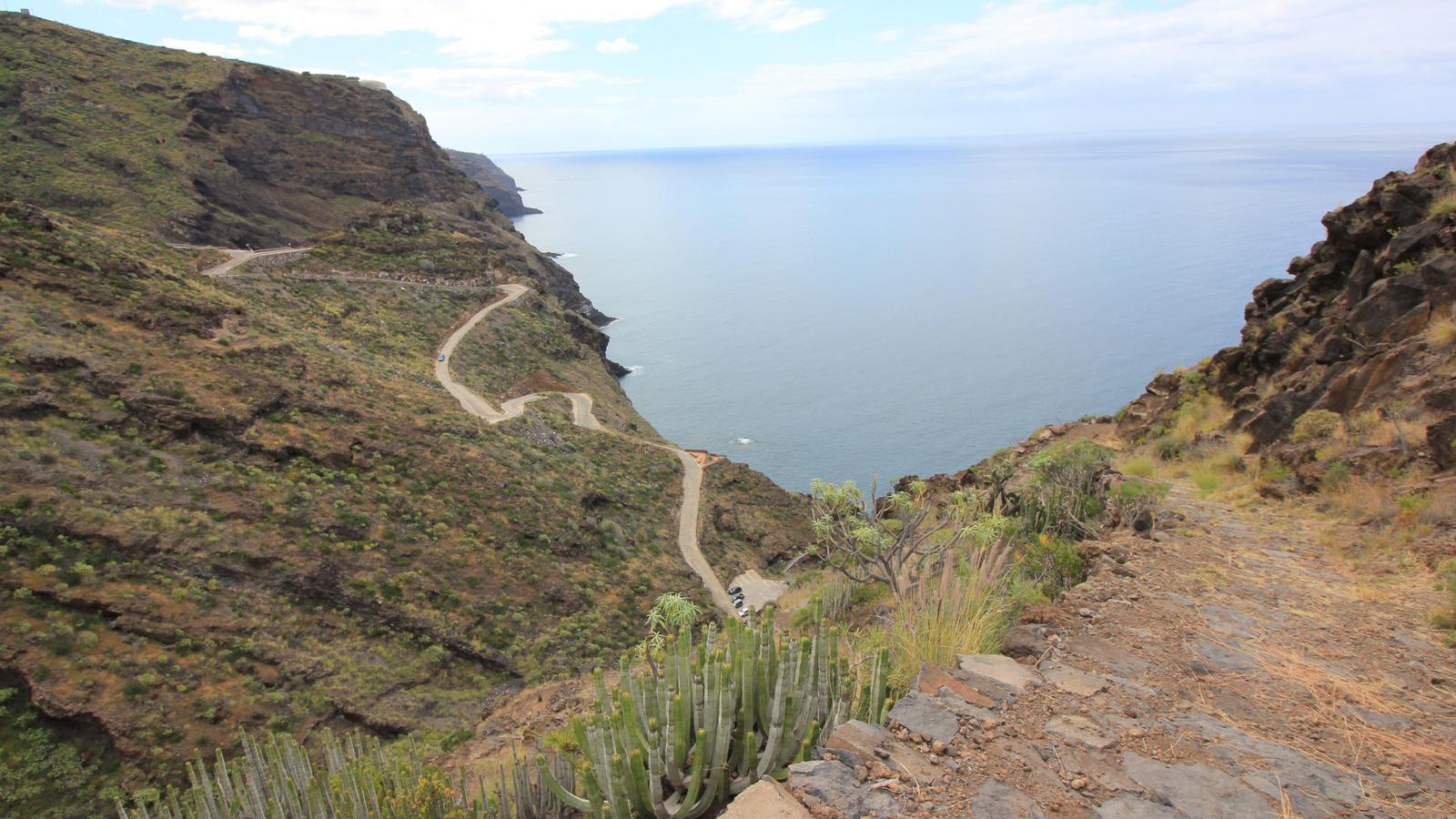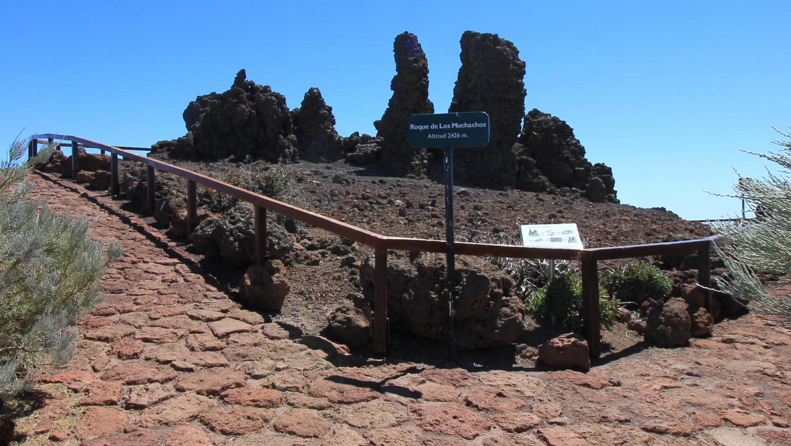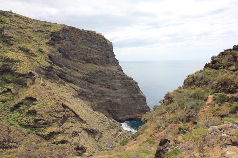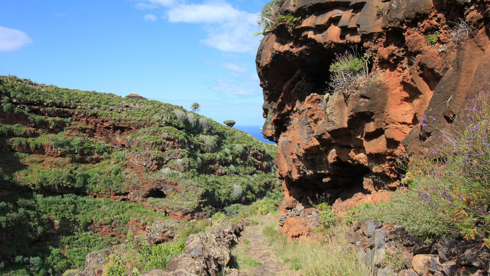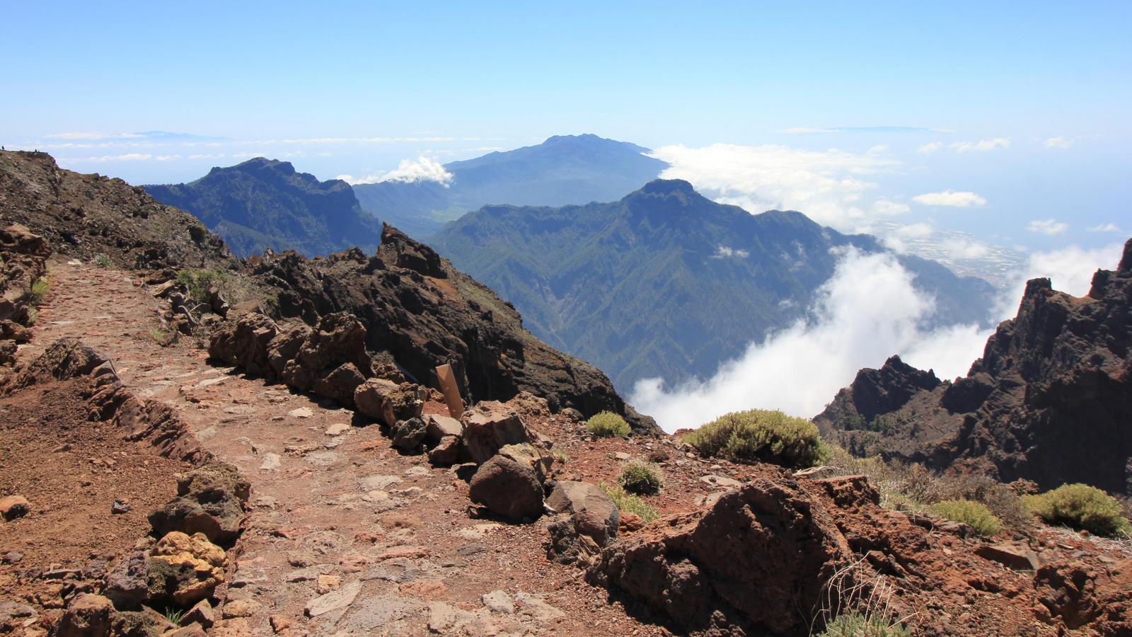 Un sentier vertigineux nous mène aux différentes plateformes, la plus éloignée et la plus basse est une avancée naturelle dans la caldera d'où nous apercevons les trois îles voisines, Tenerife et le Teide, La Gomera et El Hierro.