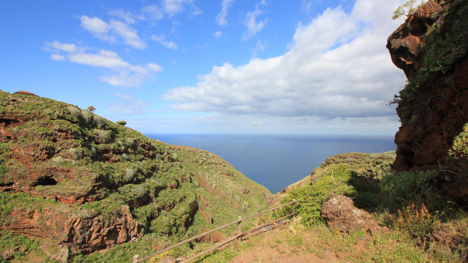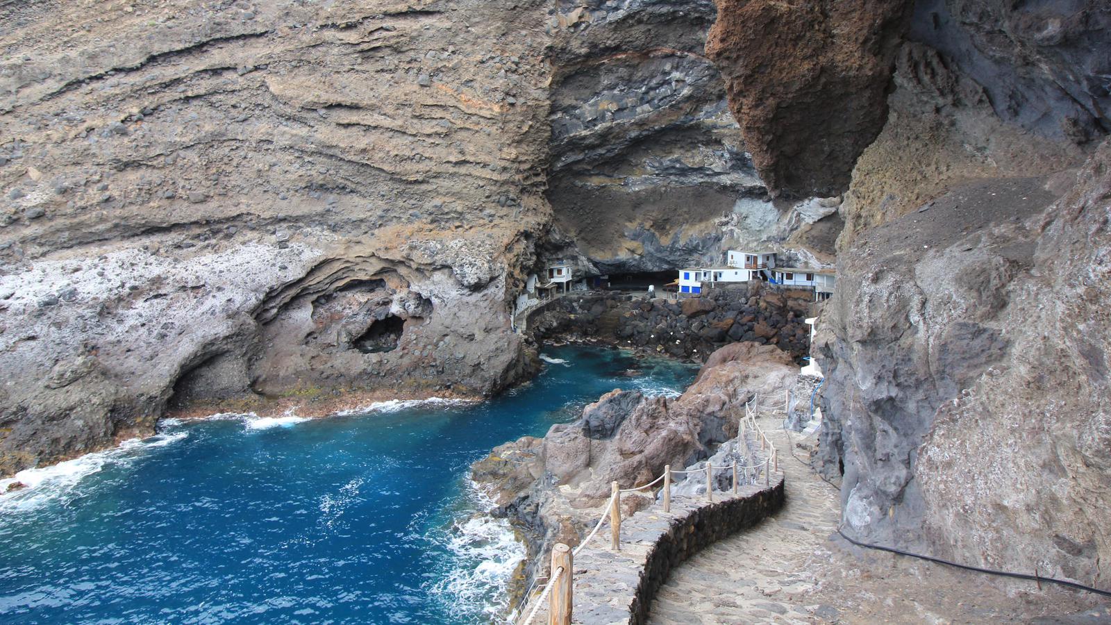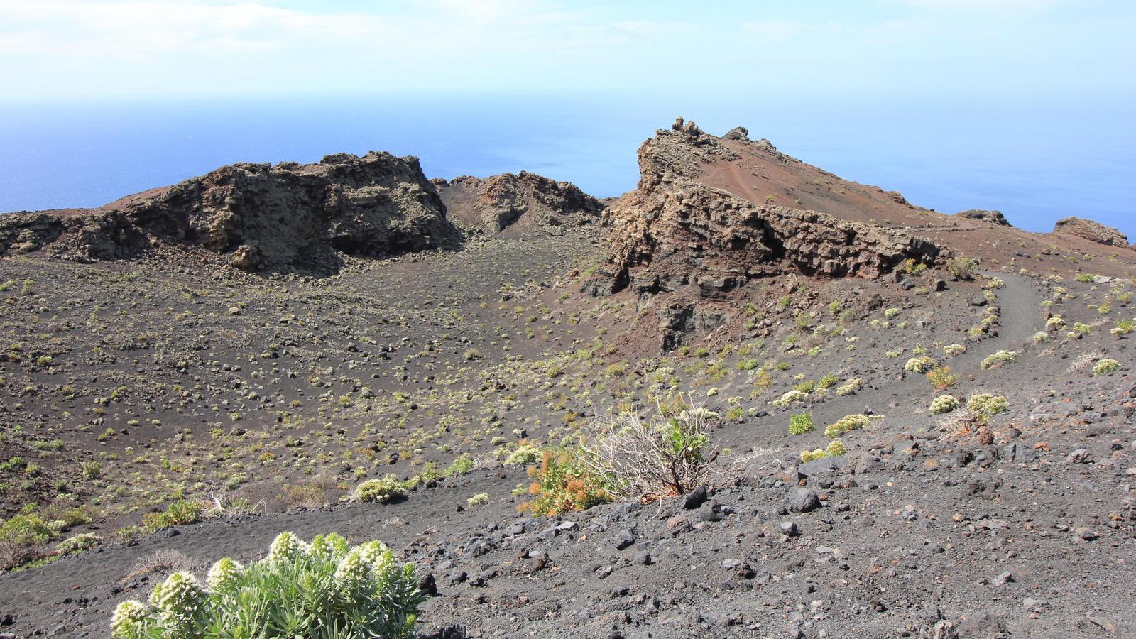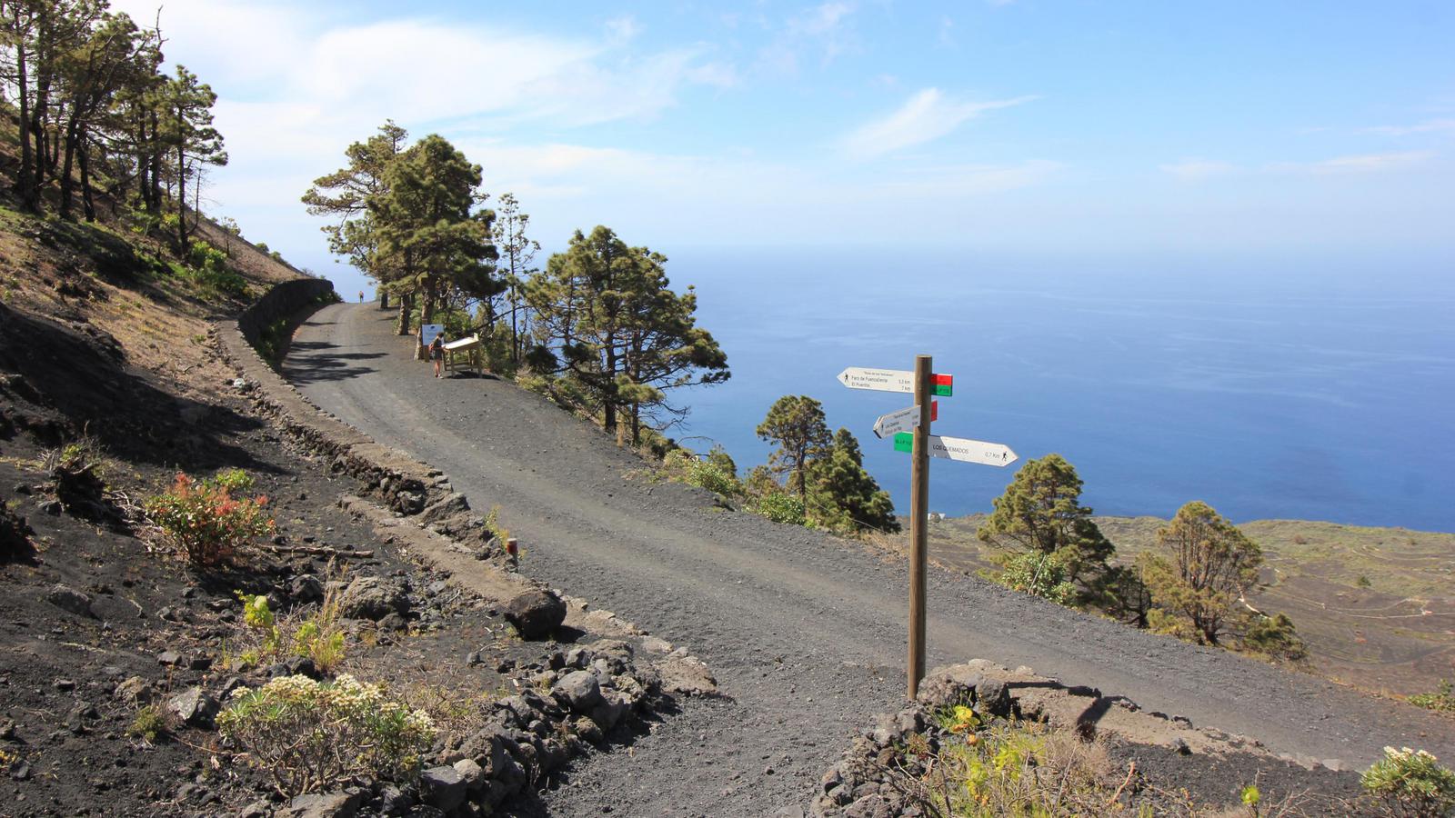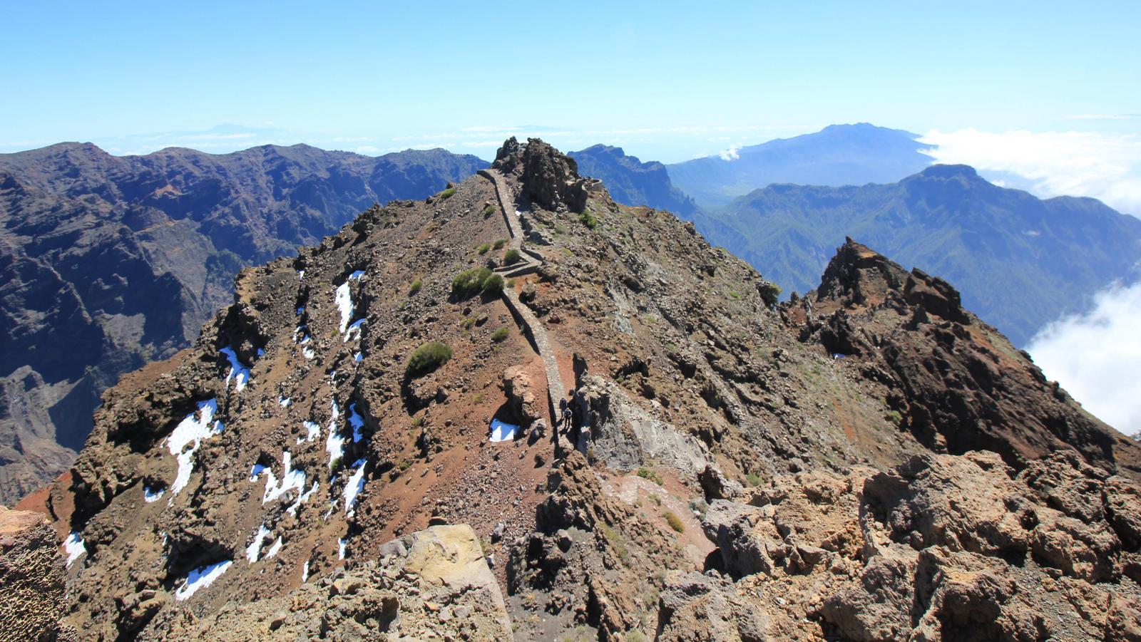 Un sentier vertigineux nous mène aux différentes plateformes, la plus éloignée et la plus basse est une avancée naturelle dans la caldera d'où nous apercevons les trois îles voisines, Tenerife et le Teide, La Gomera et El Hierro.