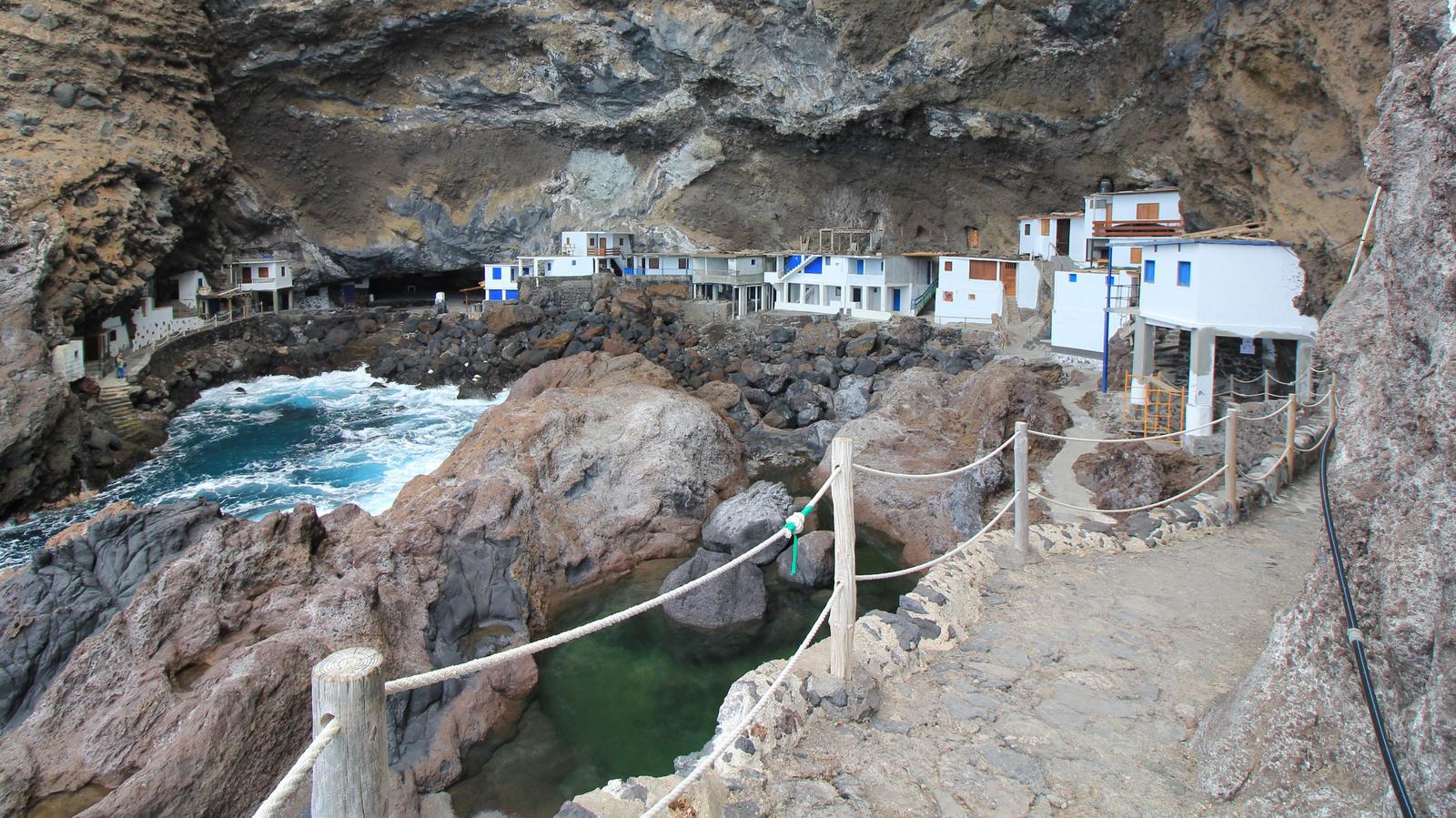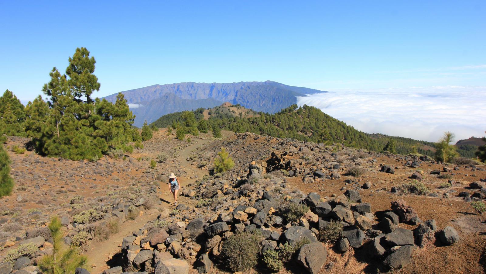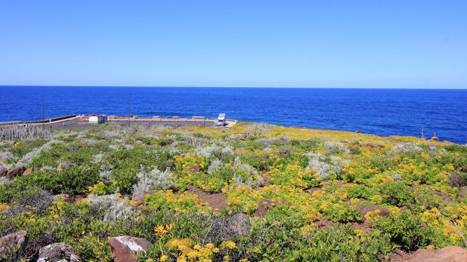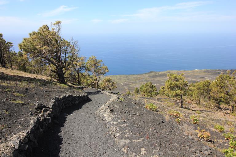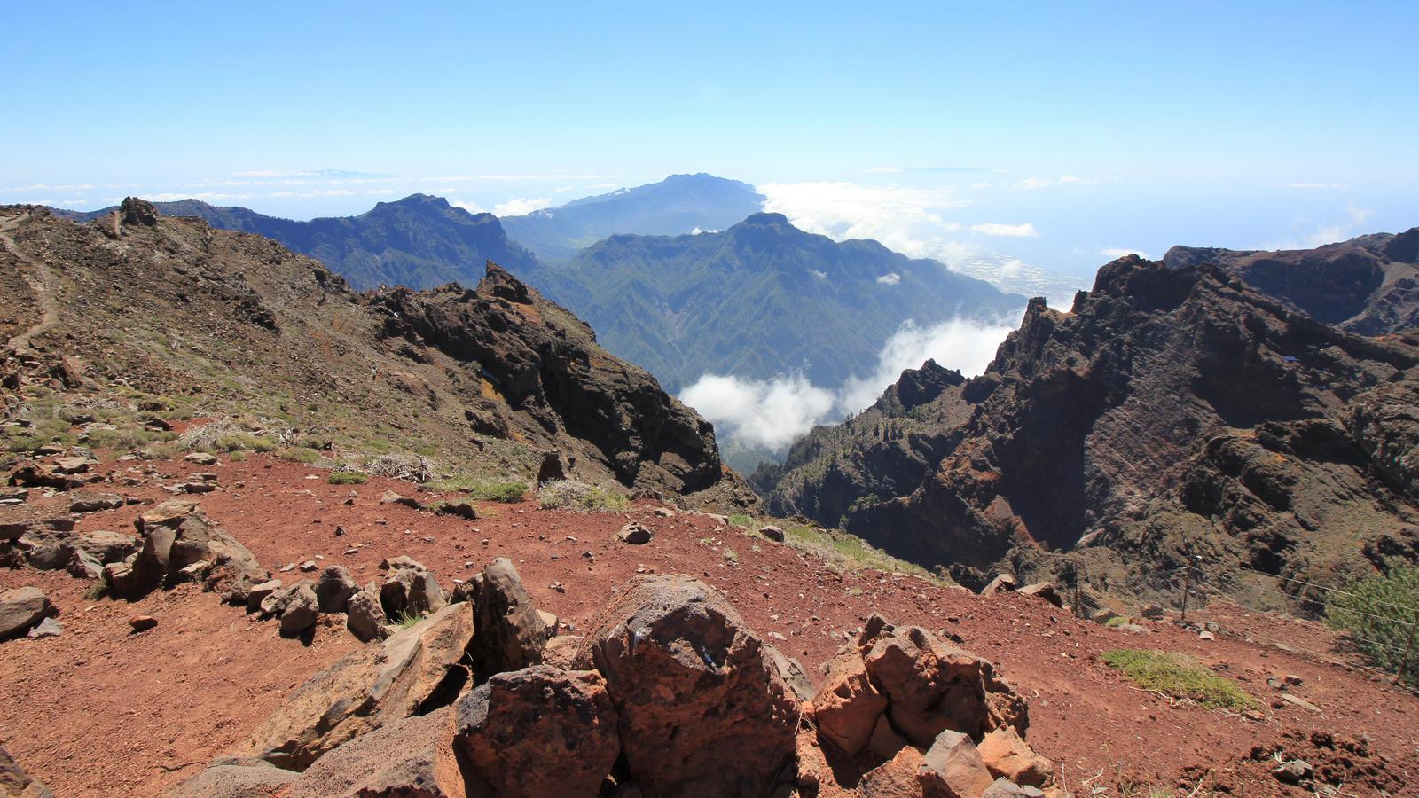 Un sentier vertigineux nous mène aux différentes plateformes, la plus éloignée et la plus basse est une avancée naturelle dans la caldera d'où nous apercevons les trois îles voisines, Tenerife et le Teide, La Gomera et El Hierro.