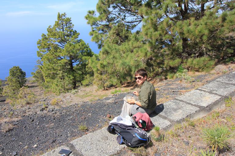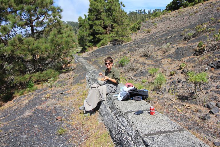 Réveil 5h00. Il ne faut pas traîner car il nous faut déjà une grosse demi-heure pour remonter à Los Canarios. Nous laissons la voiture devant l'office du tourisme et prenons nos sacs. A peine ai-je attrapé le mien que je ressens une humidité dans le bas du dos... La boîte de coca s'est percée et il y en a partout au fond du sac. Il nous faut tout ressortir et tout nettoyer en guettant l'arrivée du bus, la journée commence bien!