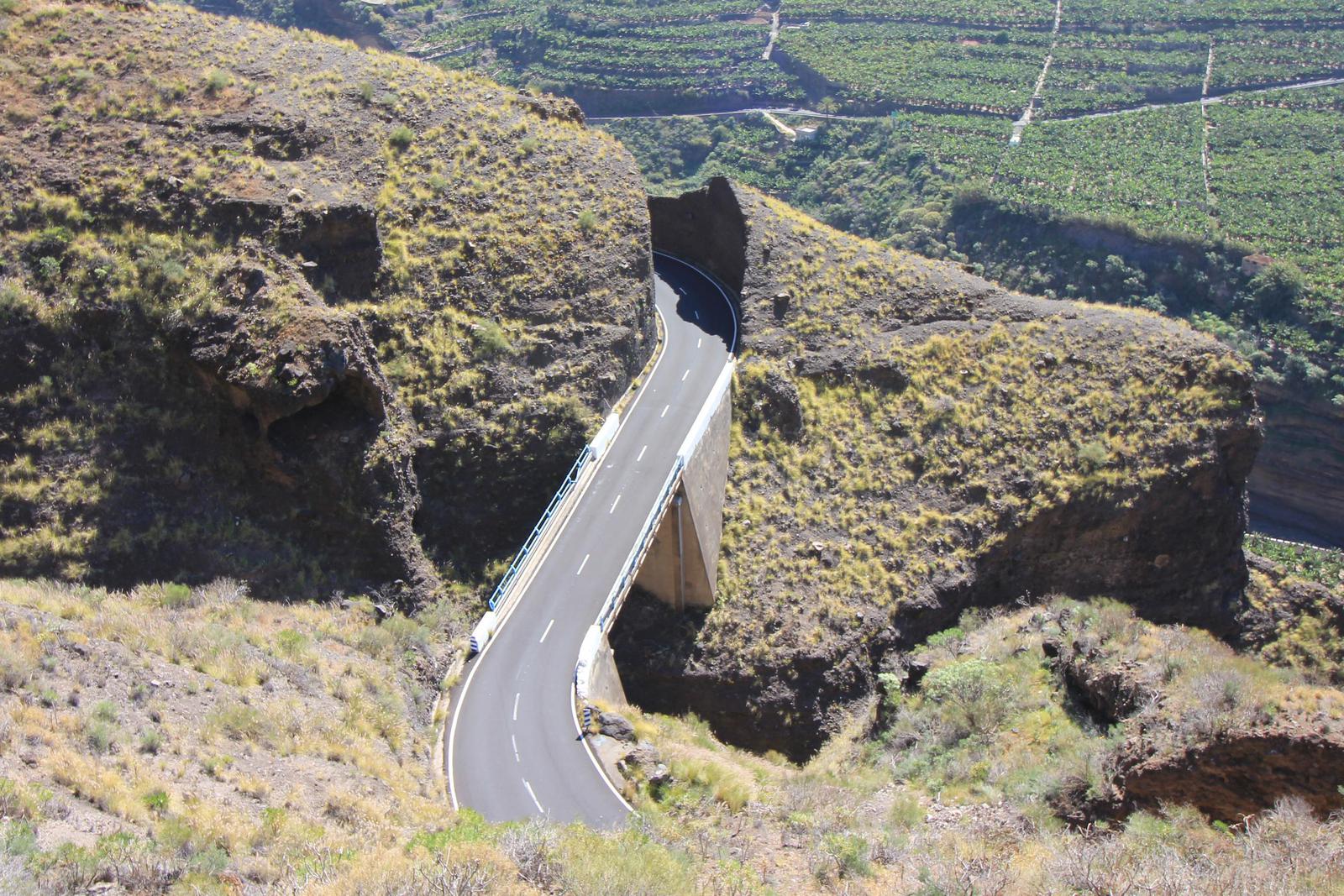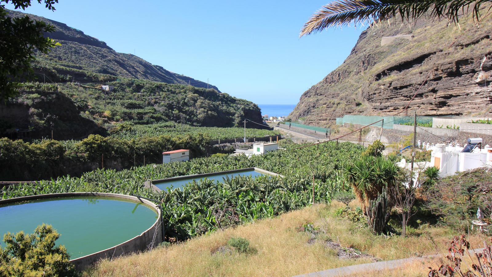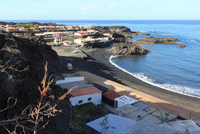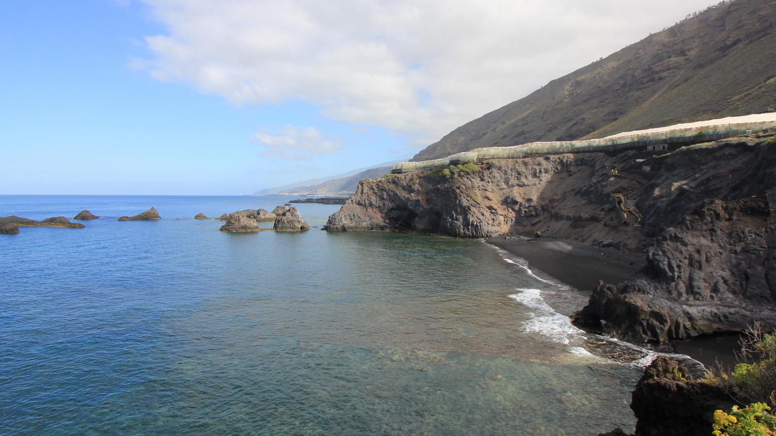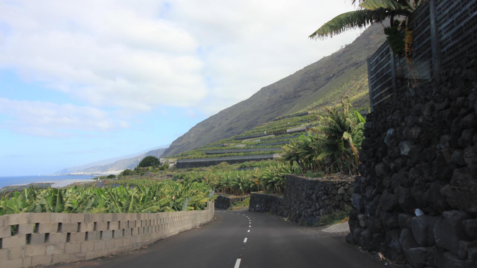 Nous roulons ainsi sur une vingtaine de kilomètres. Les bananeraies occupent maintenant toute la partie la moins pentue de la frange côtière et s'étendent jusqu'au bord des falaises, sur l'océan comme sur les barrancos. De temps à autre, la marée basse laisse apparaître de jolies petites criques de sable noir.