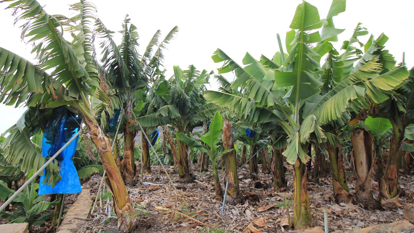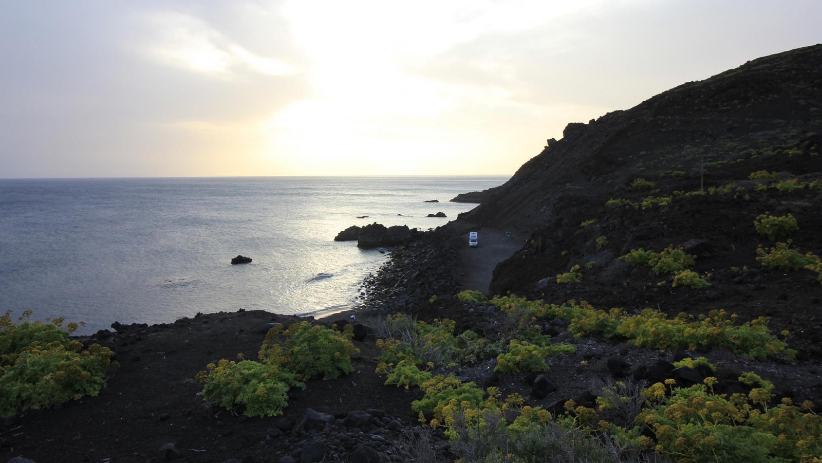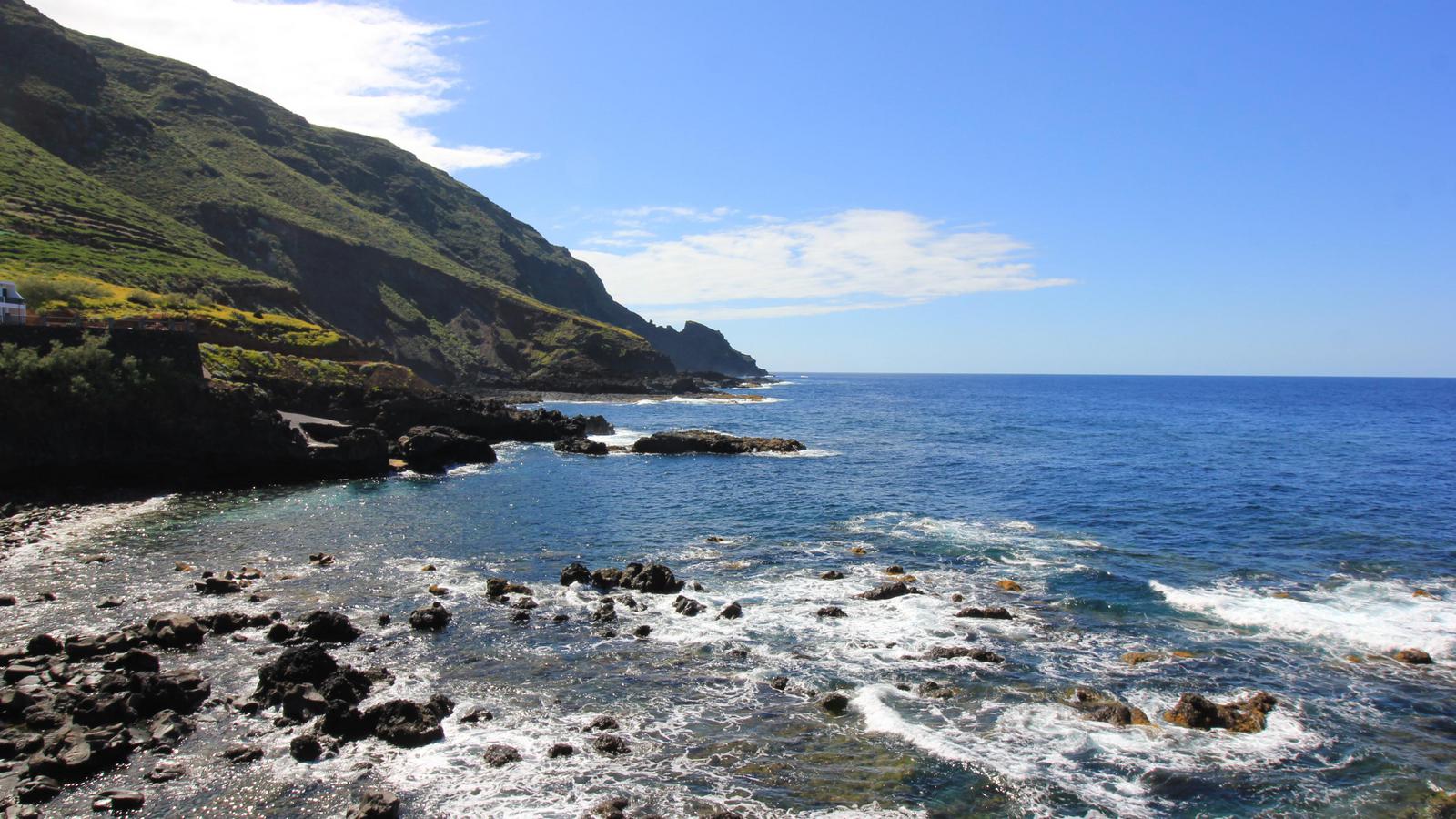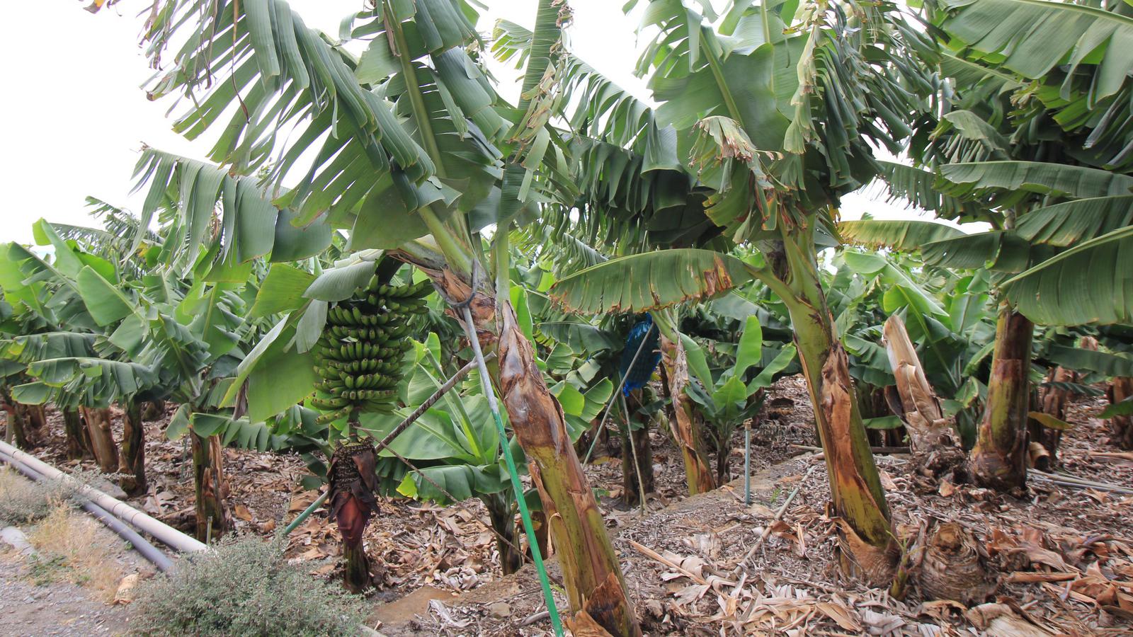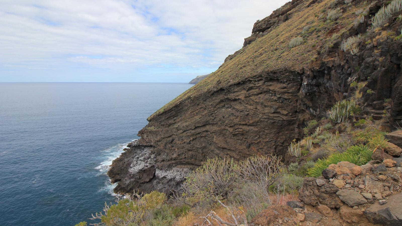 Nous roulons ainsi sur une vingtaine de kilomètres. Les bananeraies occupent maintenant toute la partie la moins pentue de la frange côtière et s'étendent jusqu'au bord des falaises, sur l'océan comme sur les barrancos. De temps à autre, la marée basse laisse apparaître de jolies petites criques de sable noir.