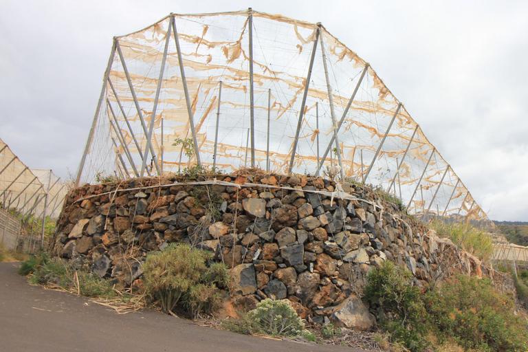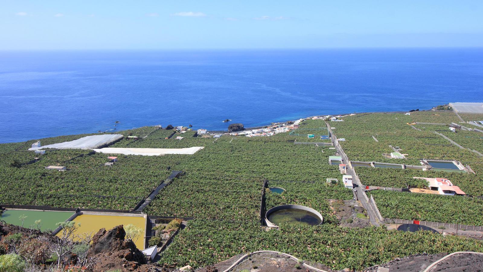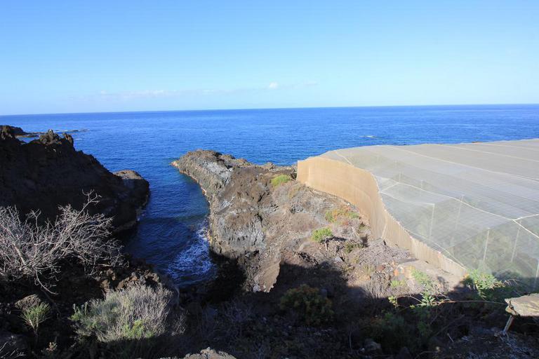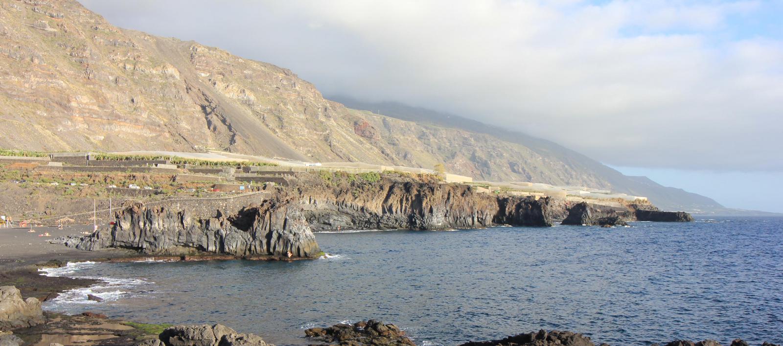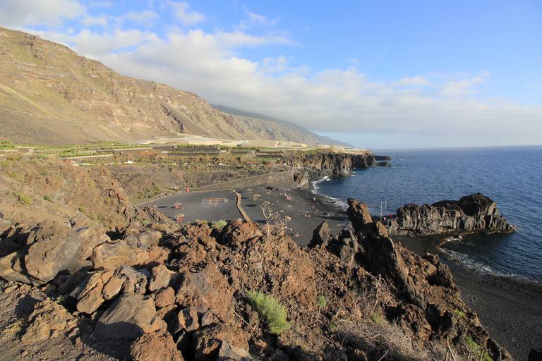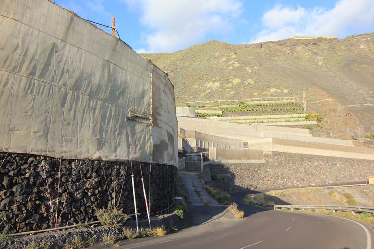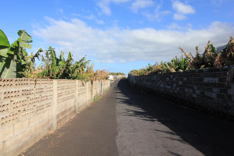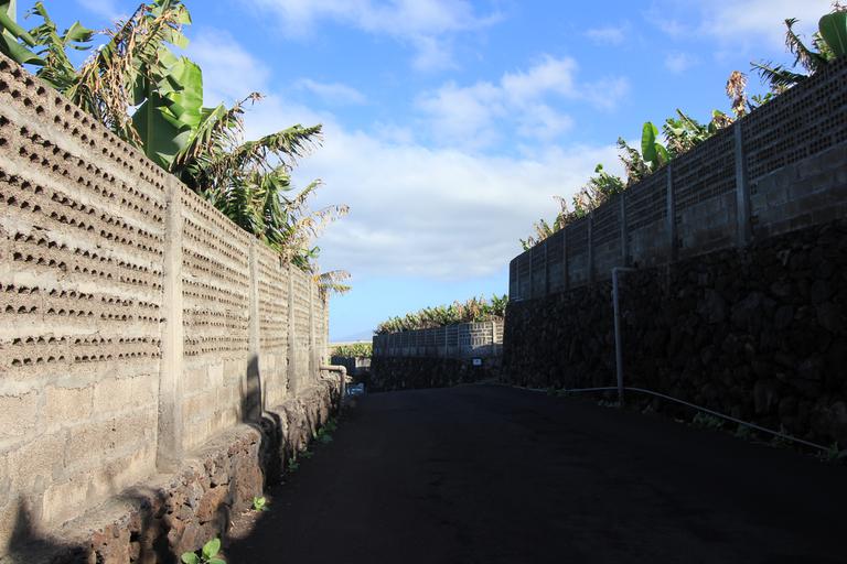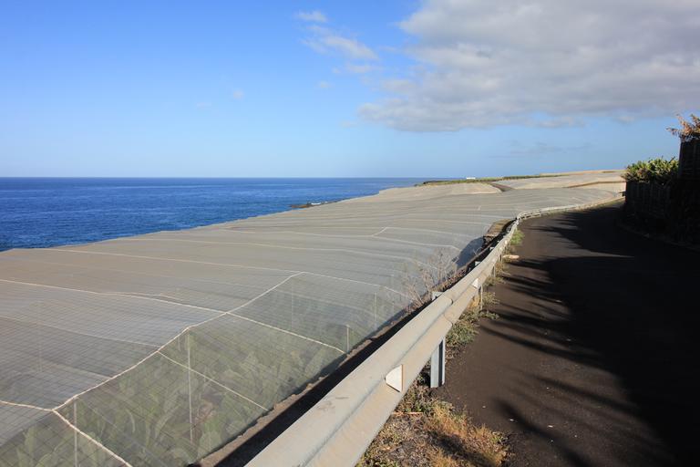 Nous quittons définitivement la Punta de Fuencaliente en essayant de rester au plus près de la côte. Nous passons la Playa Nueva, la fameuse nouvelle plage apparue lors de l'éruption de 1971, puis notre route se borde de hautes parois abritant des bananeraies. Les plus anciennes sont en agglomérés béton perforés, quant aux plus récentes elles sont en toiles de fibres plastiques lesquelles couvrent également le dessus des parcelles.