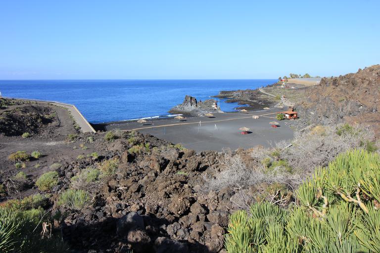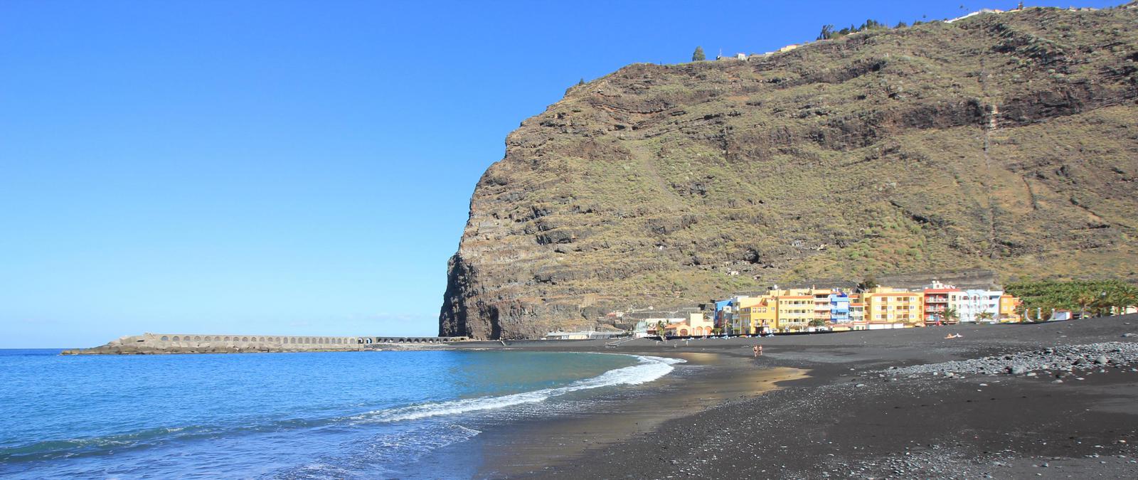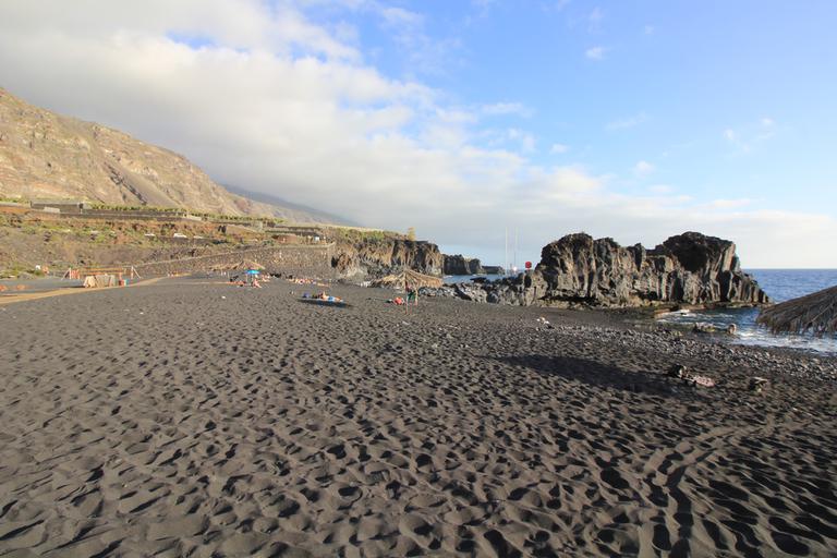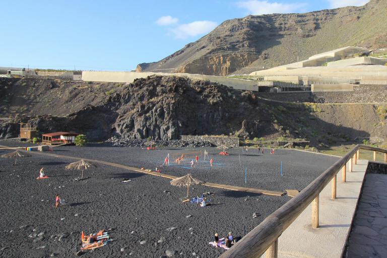 Nous passons Tazacorte, puis Puerto de Tazacorte. Nous nous arrêtons un petit moment pour nous promener sur sa belle plage de sable noir. Celle-ci est dominée par une vertigineuse paroi. Un pan a dû, ici aussi, s'effondrer car une partie de la plage est interdite au public et une équipe de spécialistes travaille en rappel pour sécuriser la falaise.