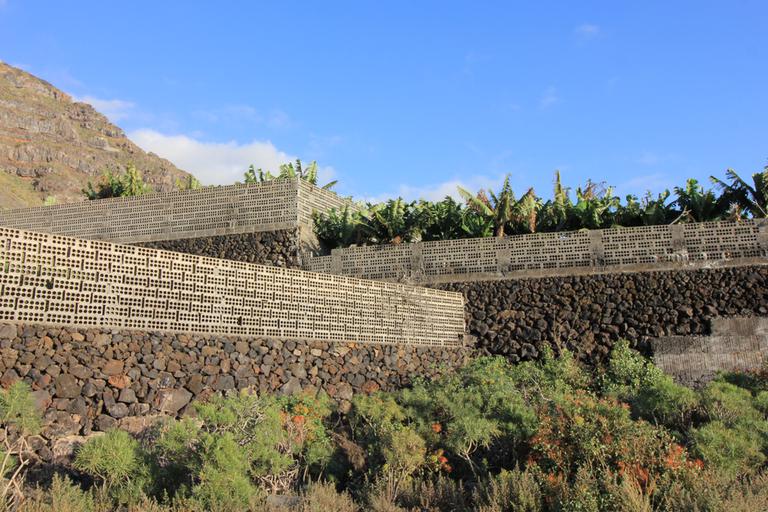 Nous nous installons sur le parking de celle-ci, en compagnie de quelques vans. Nous sommes maintenant nous aussi entourés de plantations de bananes, construites en terrasses sur d'impressionnants soubassement en pierre volcanique.