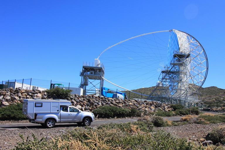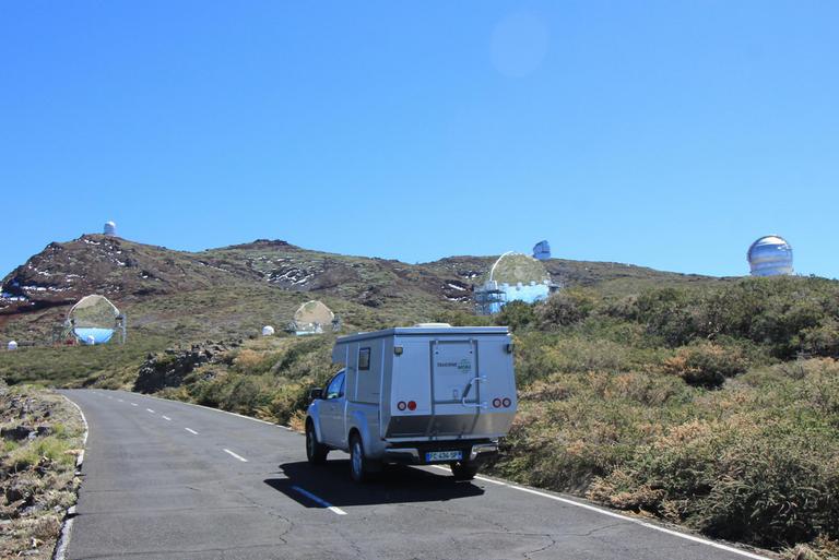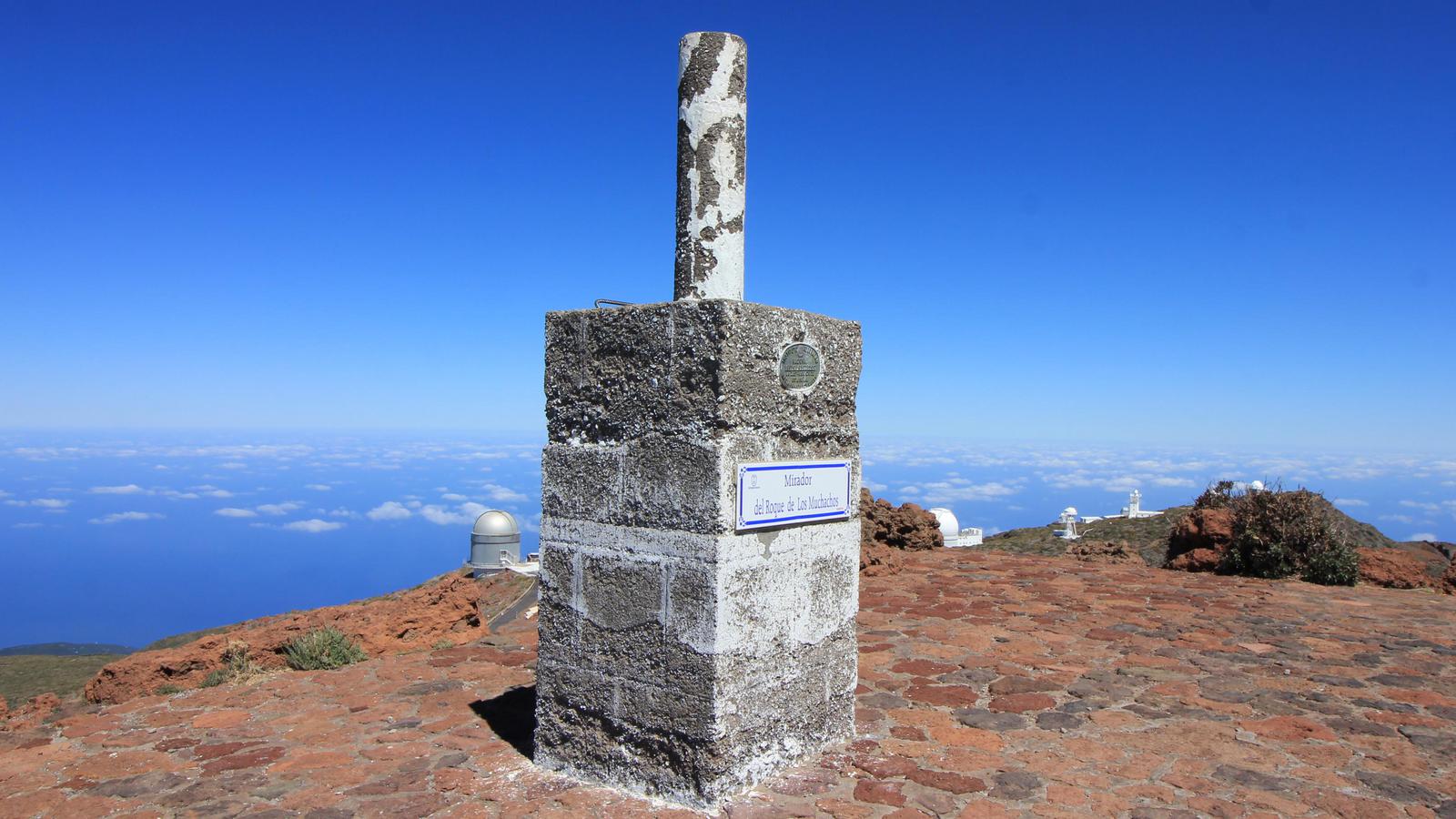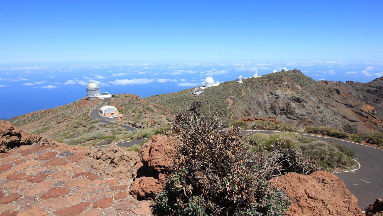 Les pins disparaissent peu à peu, nous commençons à apercevoir la mer par-dessus des nuages. Nous arrivons au centre d'observatoire d'astrophysique, nous entrons à l'intérieur du site et grimpons entre les intallations sans avoir vu la moindre indication. Une dernière montée pour atteindre un petit parking en terre et nous voilà arrivés au Roque de los Muchahos.