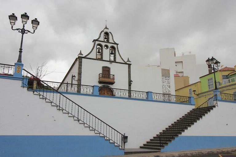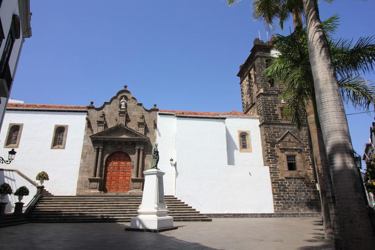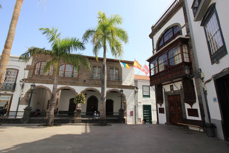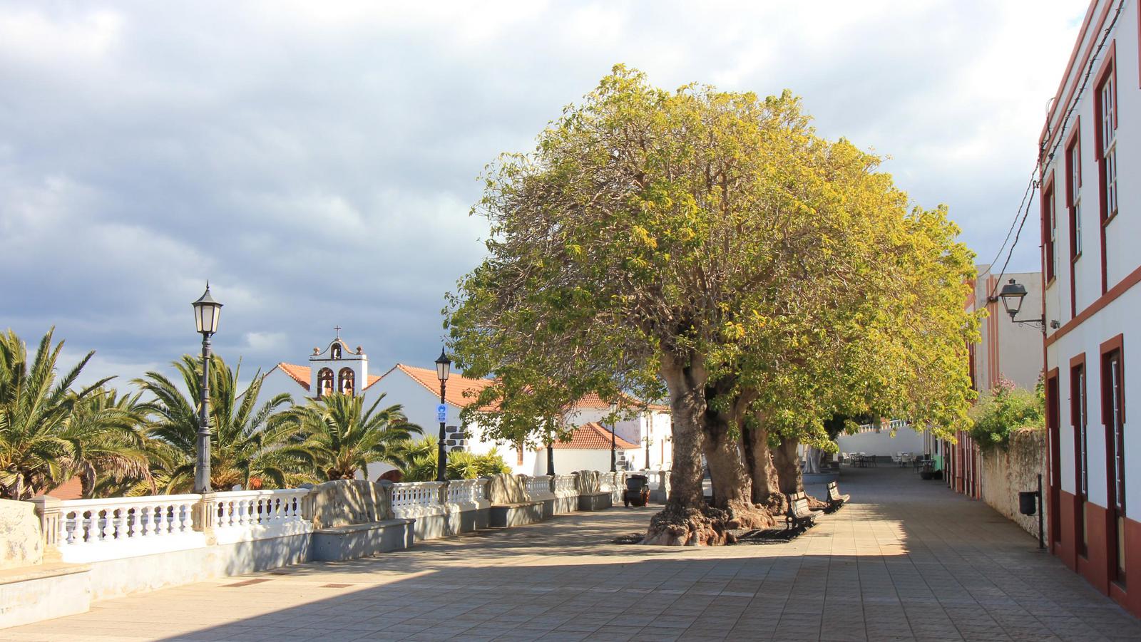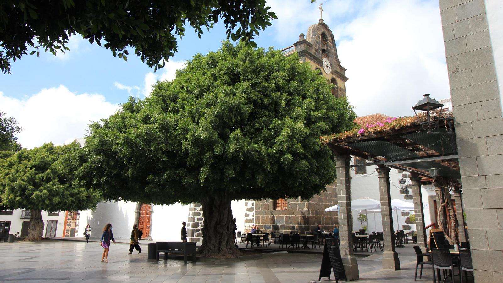 Nous laissons notre véhicule près du marché et remontons l'avenue Enrique Mederos. Puis, nous traversons la double rue à terre-plein central planté de grands arbres, où nous étions venus à l'office du tourisme et arrivons sur la Plaza de Espana. De part et d'autre de celle-ci, la belle mairie de la ville et l'Iglesia Nuestra Senora de los Remedios se regardent par dessus les immenses ficus. En flanant autour de la place, nous en découvrons une seconde, beaucoup plus petite mais tout aussi charmante, la Plaza Chica, ornée de 8 palmiers géants.