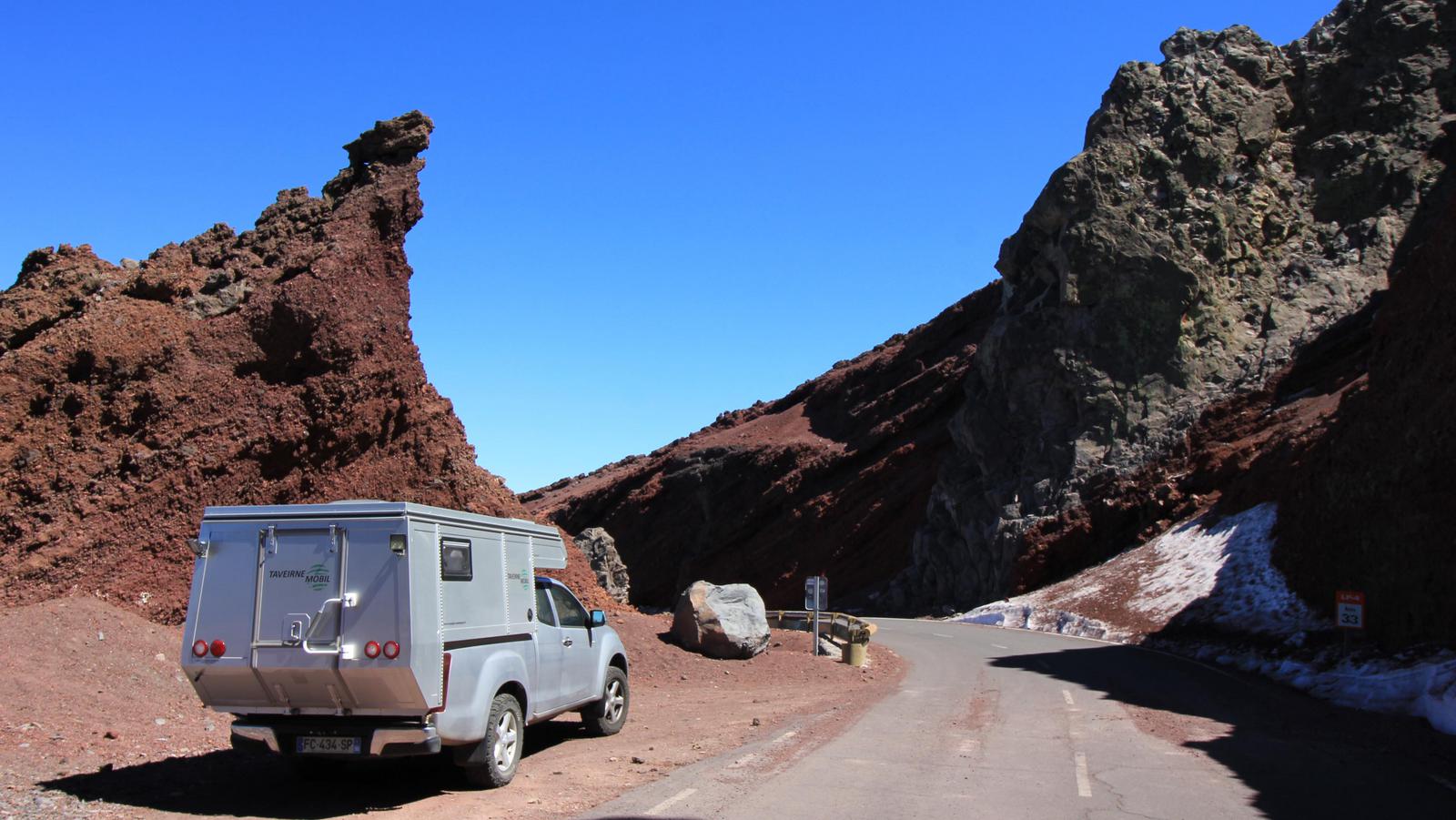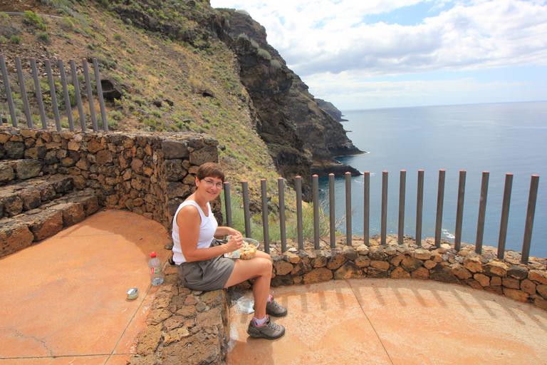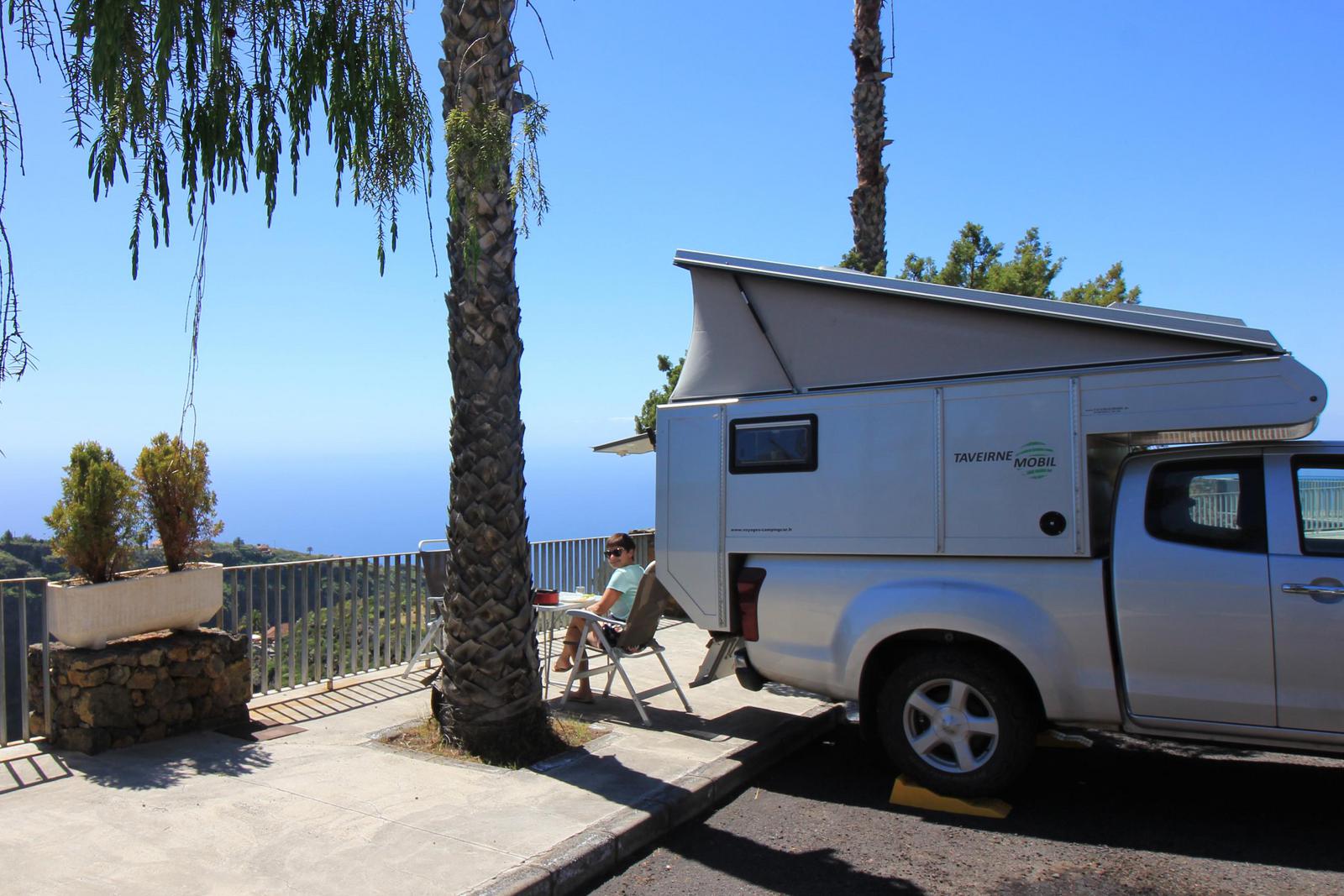Nous reprenons la voiture et poursuivons vers le mirador de los Andenes. La route devient vertigineuse, et alors que nous aimerions déjeuner, les possibilités de stationnement se font quasiment inexistantes. Une petite plateforme se présente à côté de ce mirador, juste au bord du vide... Je vérifie trois fois si mon frein à main est serré et si ma vitesse est bien engagée, de la porte de notre cellule nous dominons l'océan Atlantique, 2300m sous nos roues...