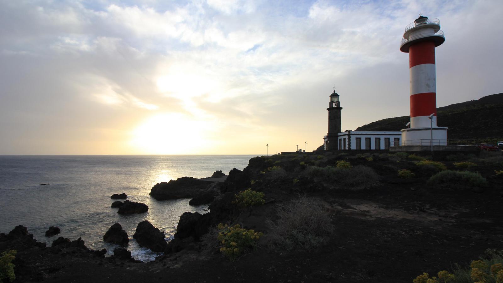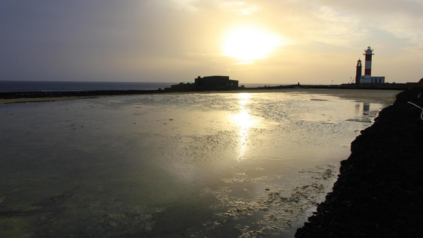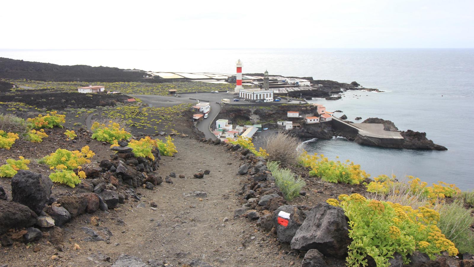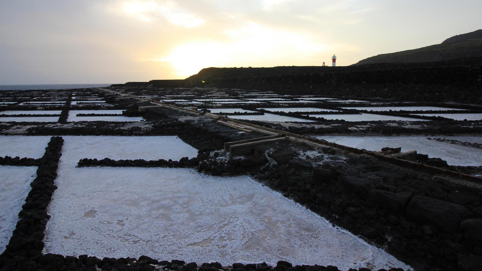 La route serpente au milieu des champs de lave et passe en contrebas de quelques volcans. Nous retrouvons des paysages que nous n'avions plus croisés depuis que nous avons quitté Lanzarote. Le phare nous apparaît dans la descente, dressé devant des salines dont les petits carrés d'eau commencent à virer de teinte avec le soleil qui décline.