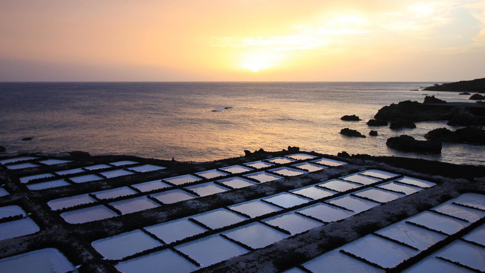 Le beau temps est de retour et nous accompagne jusqu'à la plage. Nous retournons voir la saline en espérant assister à un joli coucher de soleil. Le site est ouvert et la visite est gratuite, cependant la récolte n'étant assurée que de mai à octobre, nous n'avons pas la chance de voir les photogéniques petits tas de sel tout blanc posés au bord des bassins de sable noir... Le soleil disparait derrière un banc de brume avant d'atteindre la mer, nous nous réconfortons en dégustant un verre de Teneguia sur la terrasse du bar de la saline...