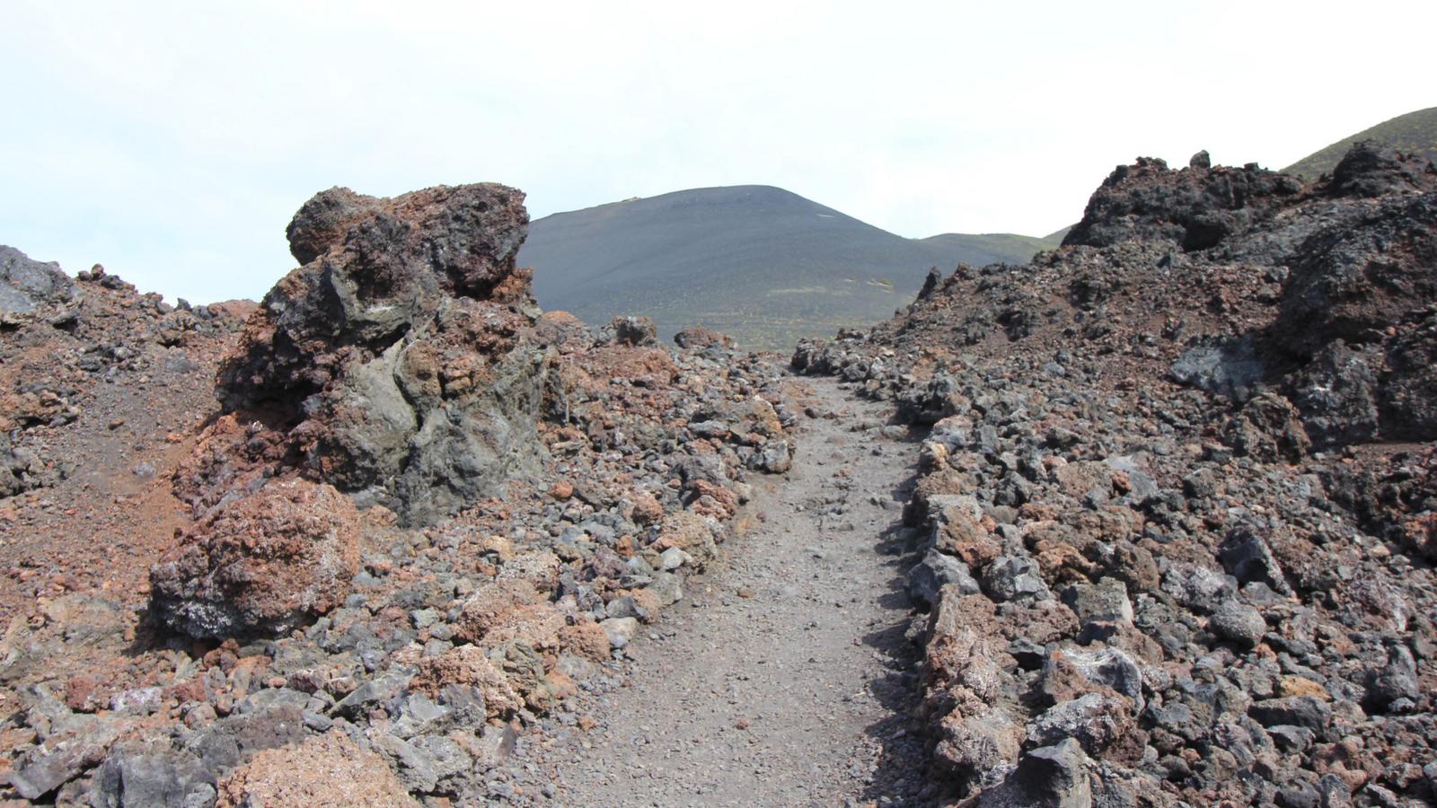 Nous sommes sur une crête, côté océan le ciel reste dégagé en revanche, à monter doucement, les nuages occupent maintenant presque totalement la caldera. Nous entamons la descente vers Santa Cruz. La route n'est pas spécialement délicate cependant le risque d'éboulement est constant et ce ne sont que des amas de blocs de toutes tailles sur le bas-côté.