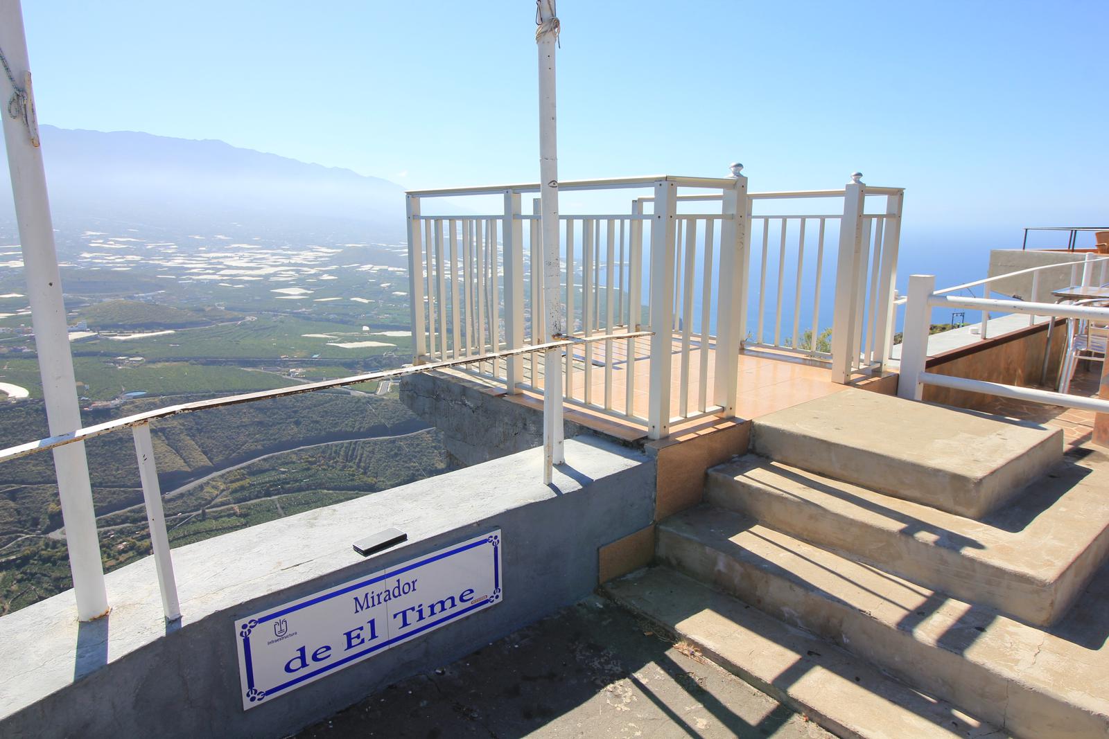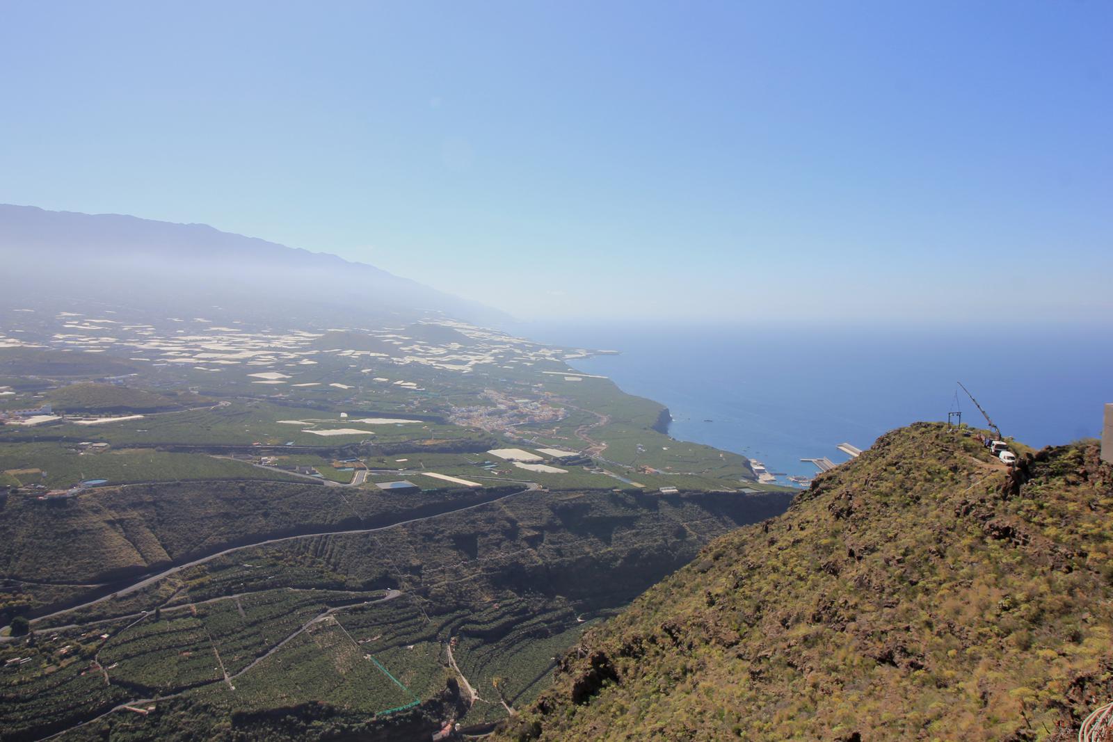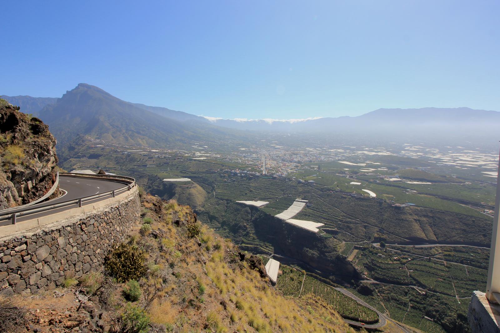 La route quitte le fond du ravin pour s'attaquer à la paroi du barranco de las Angustias. Comme à coups de serpe, la LP-1 est taillée dans la roche pour gravir en quelques lacets les 600m qui séparent le bord de mer du mirador de El Time. De ce dernier, nous découvrons un panorama exceptionnel sur Los Llanos de Aridane. Au-dessus de la ville, nous apercevons la mer de nuages sur la caldera de Taburiente, moins spectaculaire toutefois que lors de notre randonnée sur la Ruta de los Volcanes.