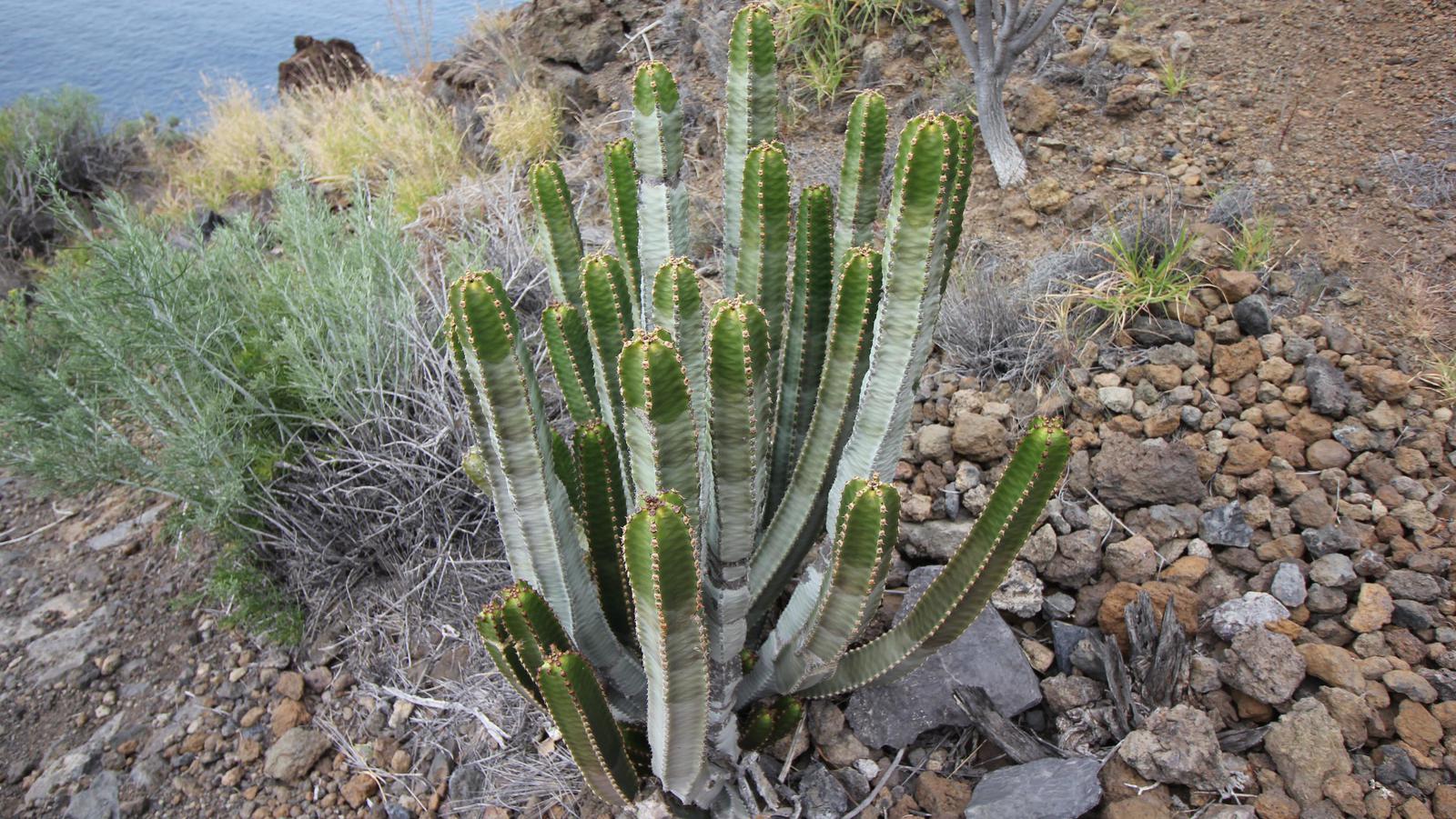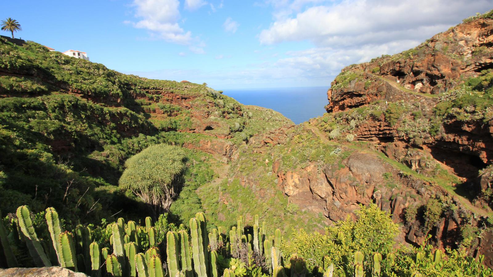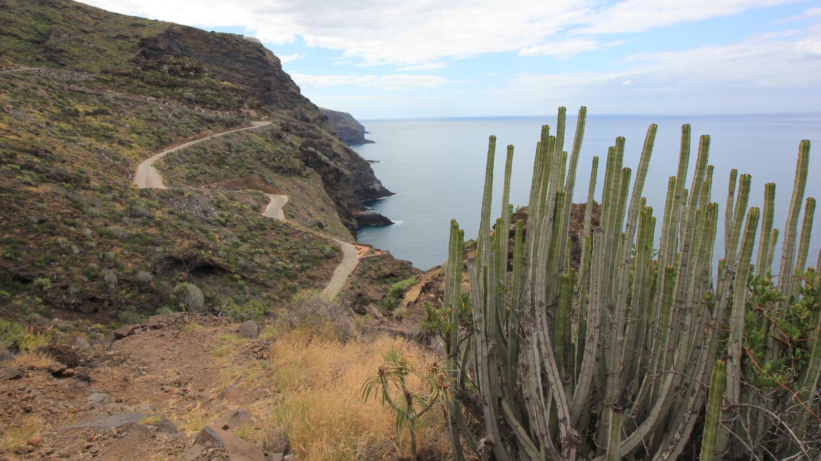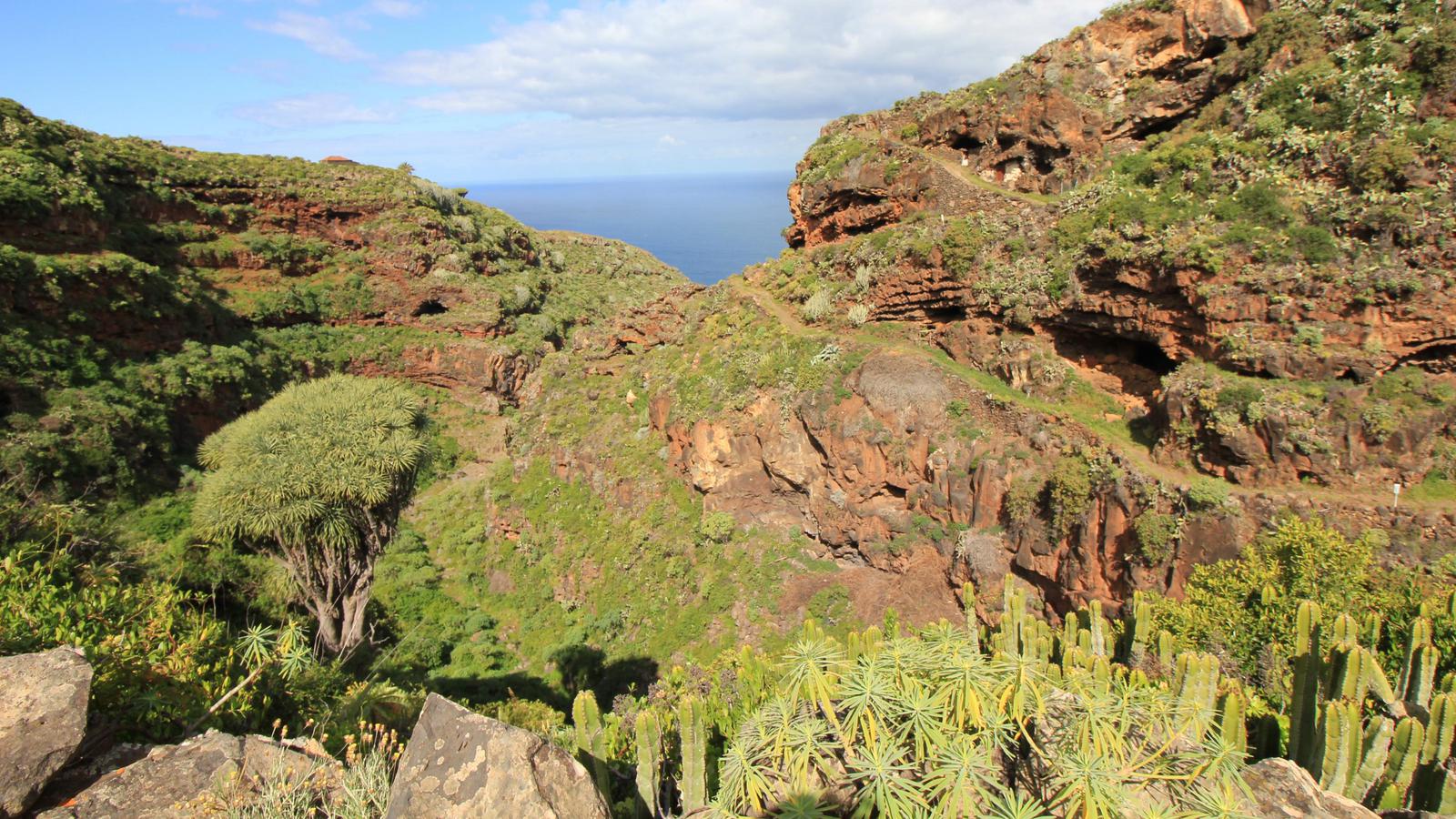 Nous suivons celui-ci. Contrairement à la plupart des barrancos que nous avons rencontrés, ce dernier est très vert et nous apercevons rapidement quelques beaux specimens de dragonniers des Canaries. Le chemin nous conduit au fond du ravin puis remonte sur l'autre versant. Il continue ensuite le long de la côte, nous trouvons d'autres indications dragos, poursuivre ce sentier serait agréable mais nous ne saurions pas revenir. Nous faisons demi-tour.