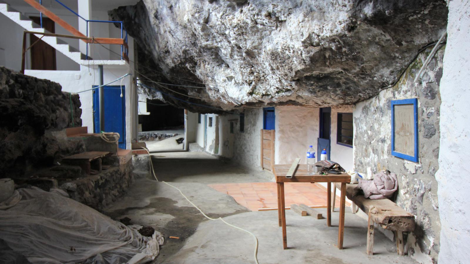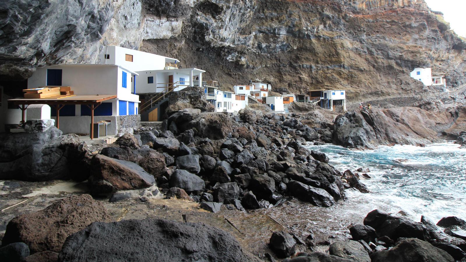 L'endroit est tout à fait hors du commun, c'est une quinzaine de petites maisons sur un ou deux niveaux, imbriquées sous l'énorme falaise. Au centre, une profonde voûte assez basse de plafond, à laquelle nous accèdons par une ruelle entre les maisons coincées sous la roche, sert d'abri aux barques de pêche. Entre les rochers, la mer est limpide quoique bien agitée... Les cabanes sont bien entretenues et plusieurs sont en cours de réhabilitation. Ici aussi l'ambiance doit être festive lorsqu'arrivent les fins de semaine...