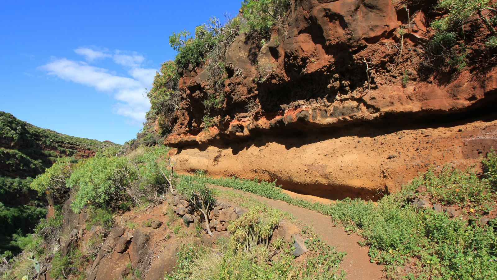 Après une première partie relativement facile, nous abordons la descente du barranco. Le sentier est un ouvrage conséquent, maçonné et en lacet. Malgré cela, la pente est extrêmement raide et la marche éprouvante. Par endroit celui-ci est vertigineux et vraiment pas à conseiller aux familles avec de jeunes enfants.