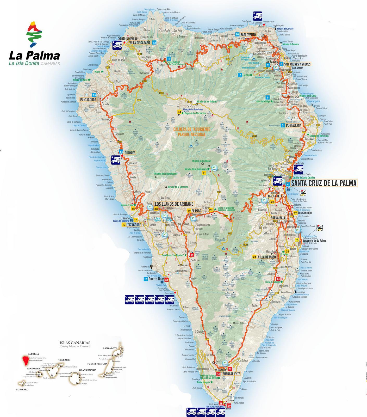 La Palma compte 87 000 habitants. Elle a la forme d'un coeur allongé, elle mesure 25km dans sa plus grande largeur et 65km dans sa longueur. Son point culminant est le Roque de Los Muchachos à 2 426m d'altitude. Le rapport de sa hauteur sur sa largeur fait d'elle, l'île la plus escarpée du monde... La partie nord est occupée par l'immense caldeira de Taburiente, tandis qu'une succession de volcans forme une crête en direction du sud.