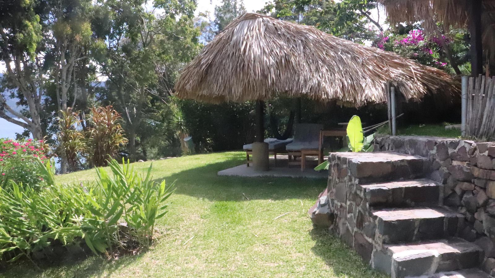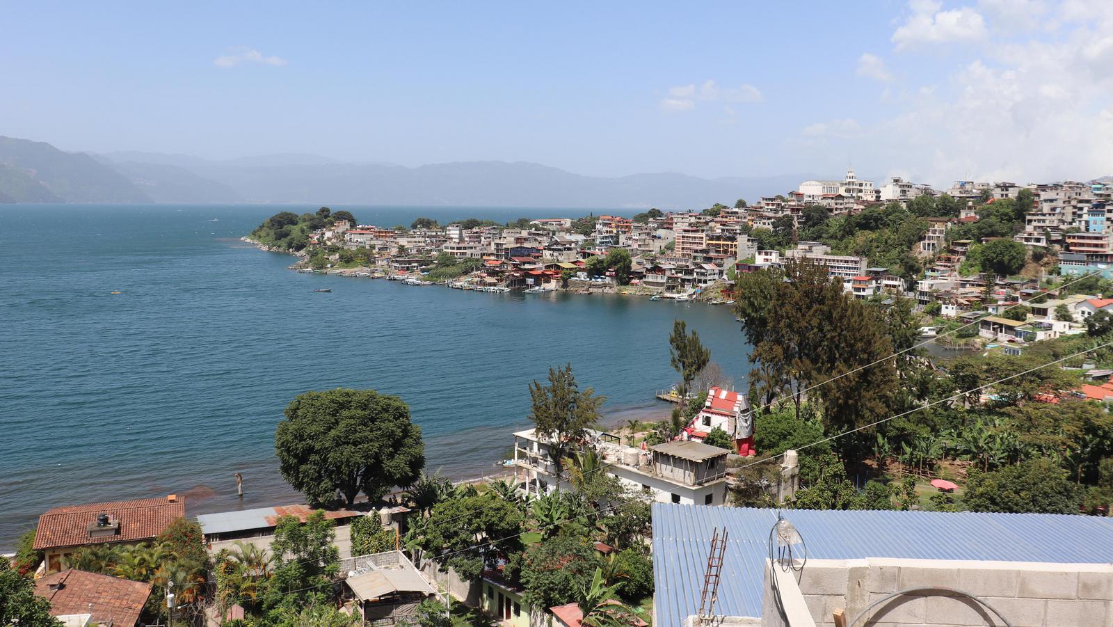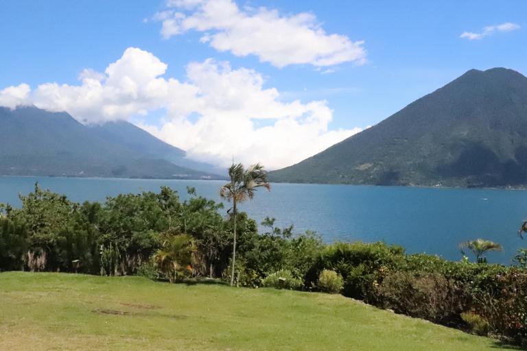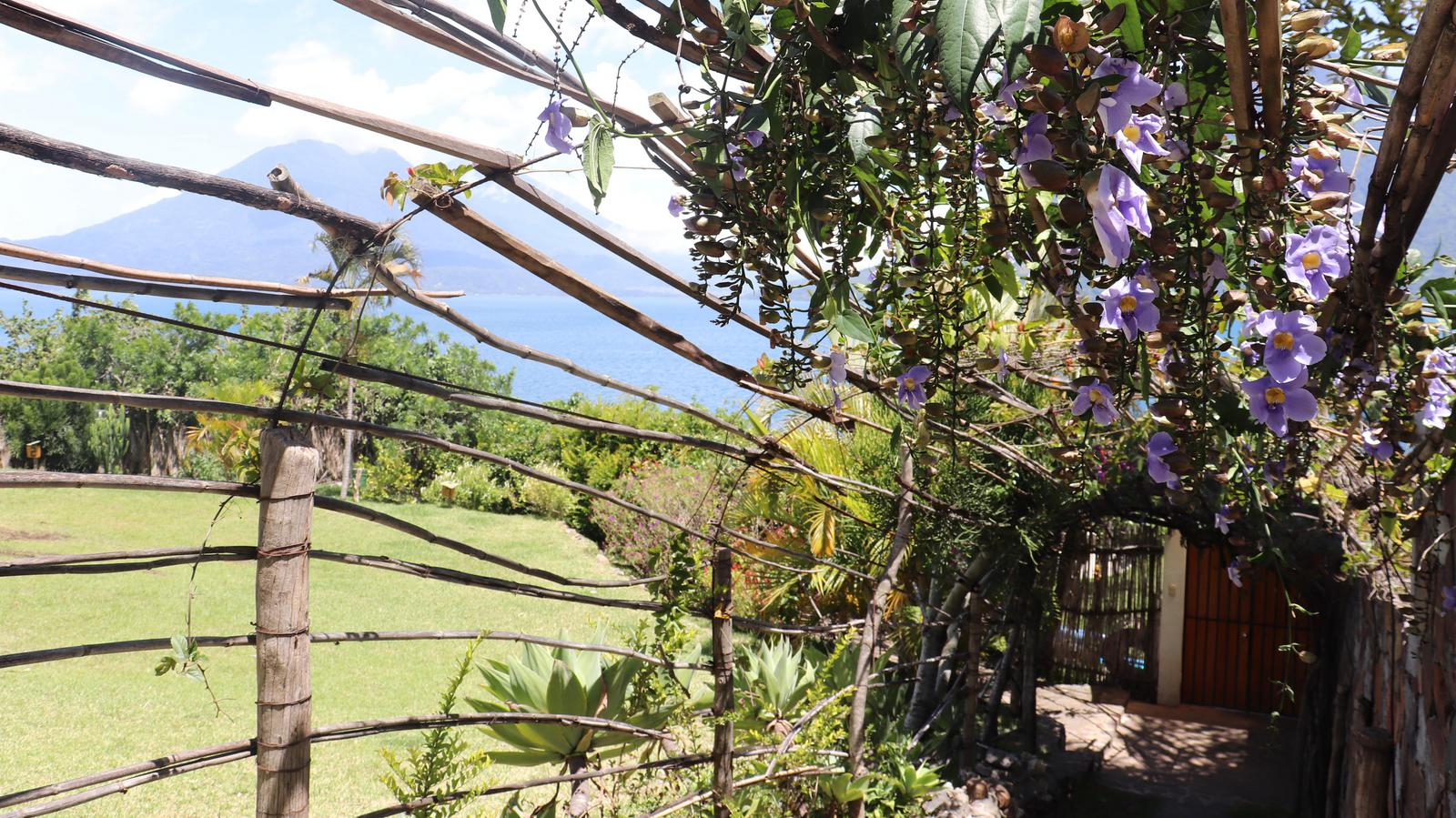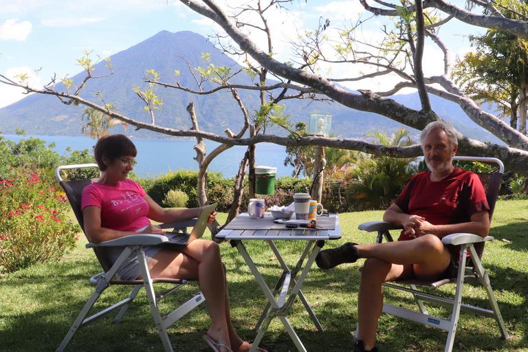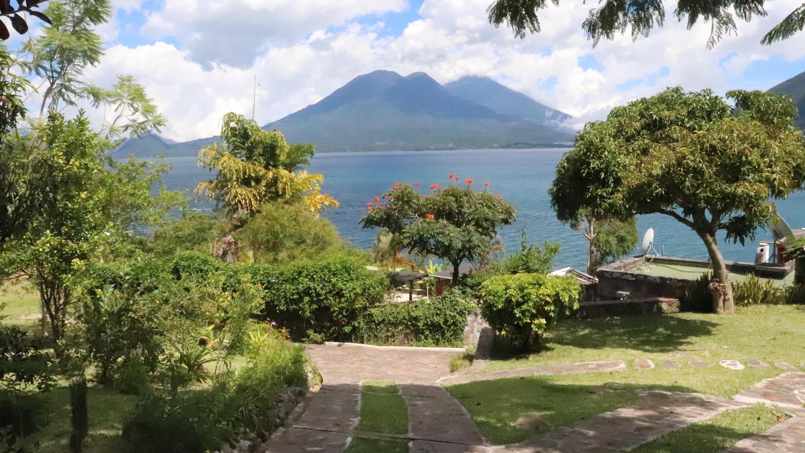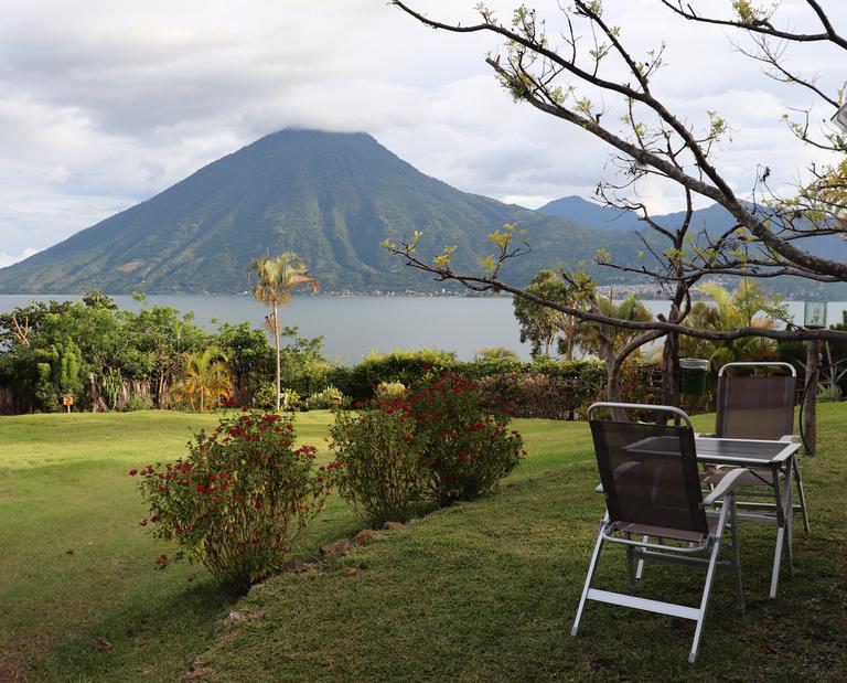 Pierre est installé au Guatemala depuis 24 ans. Il a acheté ce terrain en 1997, juste à la fin de la guerre civile, et l'a aménagé au fil des ans. Aujourd'hui, cette grande propriété comprend 16 appartements et presque autant de places de camping. Les maisons sont dissimulées dans la végétation et étagées au-dessus du lac. Quant à nous, nous dominons celui-ci et avons un panorama unique sur les volcans Atitlan et San Pedro.
