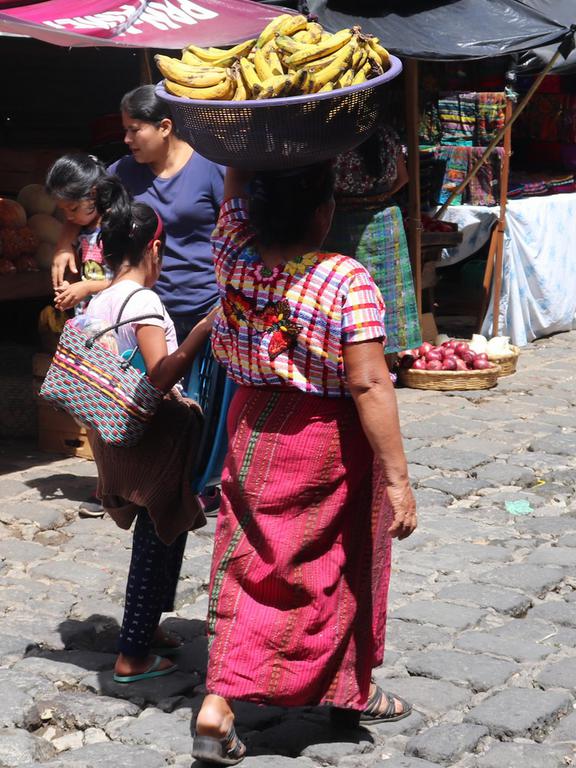 Le marché ouvre dès 6h00. il occupe la place devant l'iglesia Santo Tomas et toutes les rues adjacentes. L'église date de 1540. C'est une des plus ancienne du pays dans laquelle se déroulent des offices mélangeant le culte catholique et les rites mayas, à l'image des scènes auxquelles nous avons pu assister dans le Chiapas voisin. Nous arrivons au marché un peu après 7h00, les allées sont déjà pleines de monde, d'indiens venus des villages environants, clients ou marchands assurant le réapprivisionnement des échoppes. Avec 1,49m, le Guatemala détient la taile moyenne de population la plus petite au monde. Nous le vérifions au milieu de cette foule et nous nous sentons, une fois n'est pas coutume, bien grands... Les stands se côtoient, sans organisation particulière, de viande, de fruits et légumes, d'ustenciles de toutes sortes, de vêtements traditionnels et de tissus colorés. On pourrait penser que certains articles sont plus particulièrement destinés aux touristes, comme les masques de bois et les colliers, cependant, il n'y a aucun étranger à part nous et les commerçants font tout de même des affaires. Comme à San Pedro, ce sont les très belles tenues des femmes qui attirent notre attention.