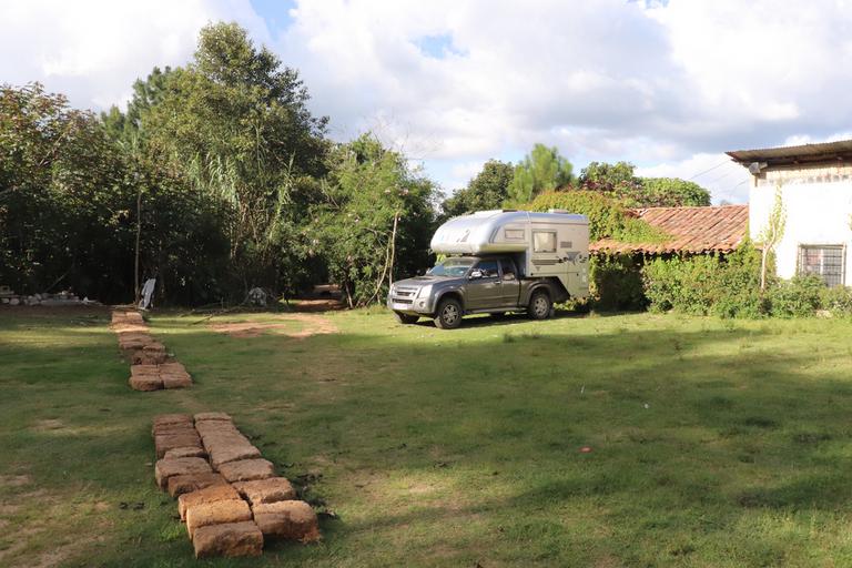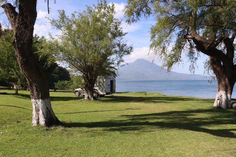 L'aire de camping de l'hôtel Bahia Atitlan était très fréquentée par les voyageurs avant l'épidémie et nombreux d'entre eux ont même vécu leur premier confinement ici. Le site est très beau, l'immense pelouse, sur laquelle nous sommes installés, donne directement sur le lac, en revanche, avec la faible fréquentation, l'entretien de la piscine et des installations laisse un peu à désirer... La nuit nous coûte 75Qtz (8,30 euros) avec électricité, ce qui reste raisonnable.