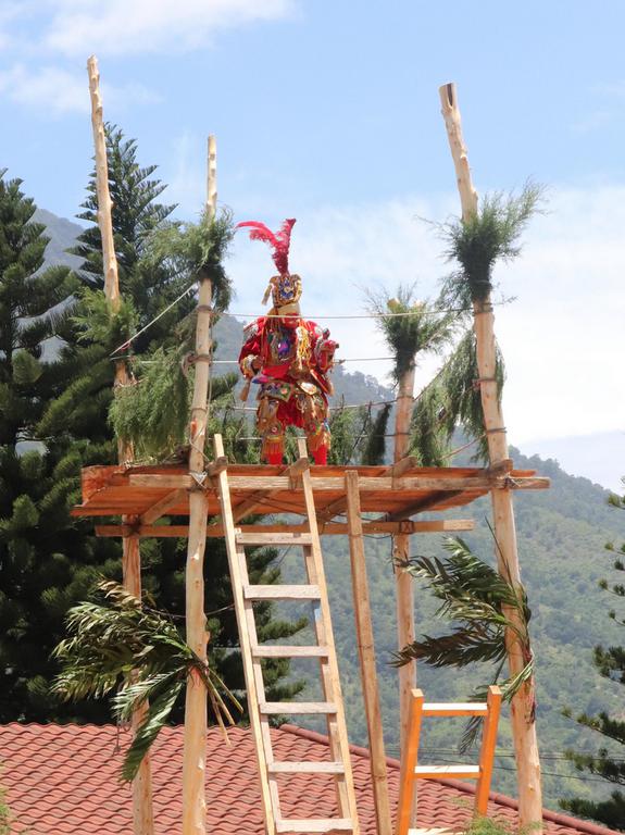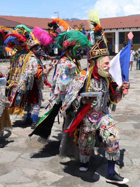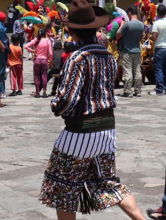 La place de l'église est très animée ce matin. Un orchestre joue de la musique, un personnage costumé est juché sur une plateforme en bois qu'il secoue frénétiquement, tandis que d'autres dansent au pied de ce podium. Les spectateurs sont en habits traditionnels, les hommes également, et c'est la première fois que nous voyons cela.