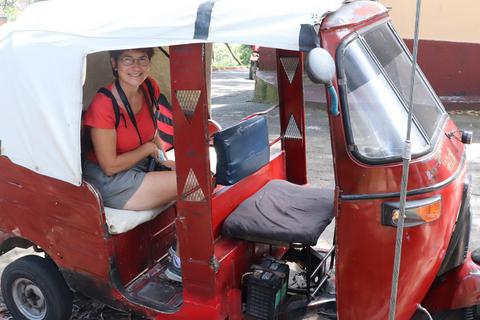 Pour justifier notre refus, j'avais prétexté avoir peur de monter en tuk-tuk. Cela l'avait beaucoup amusé mais au moment de partir, Samuel s'en souvient et me rassure en me disant qu'il conduira doucement et prudemment... Nous partons vers la maison de Maximon, nous grimpons par un dédale de ruelles minuscules, la capote de notre engin frôle les murs à chaque angle de rue...