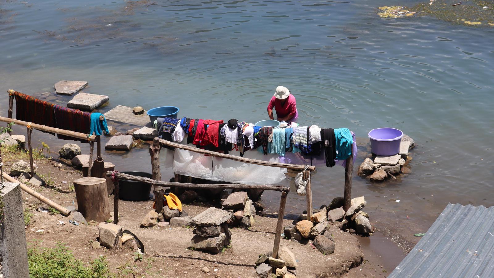 Nous revenons vers le lac en quête d'un endroit pour déjeuner. Entre les champs de maïs et les caféiers, nous apercevons quelques femmes lessivant leur linge, de l'eau jusqu'à la taille.