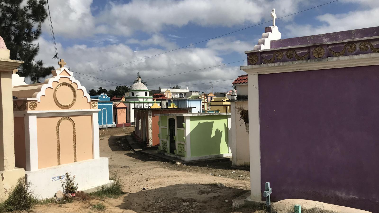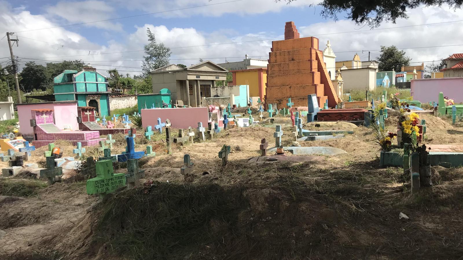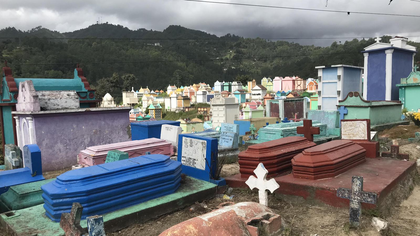 Une des rues se poursuit en traversant le cimetière. Celui-ci est très vaste et s'étend sur plusieurs collines, couvertes de tombes et tombeaux multicolores, peints aux couleurs mayas.