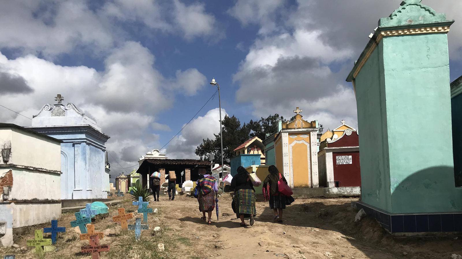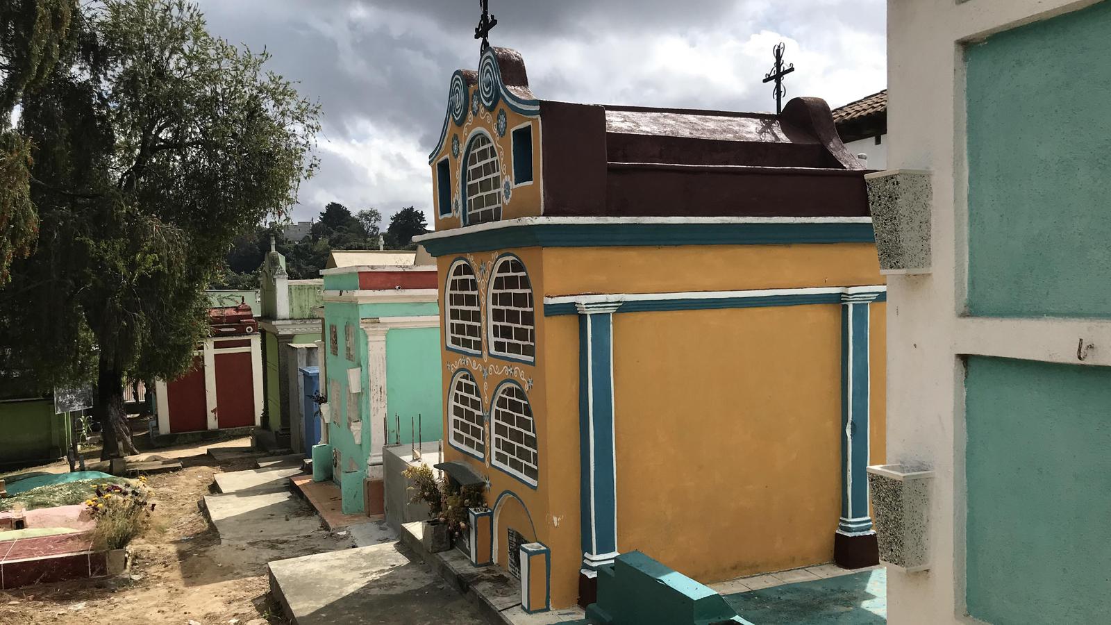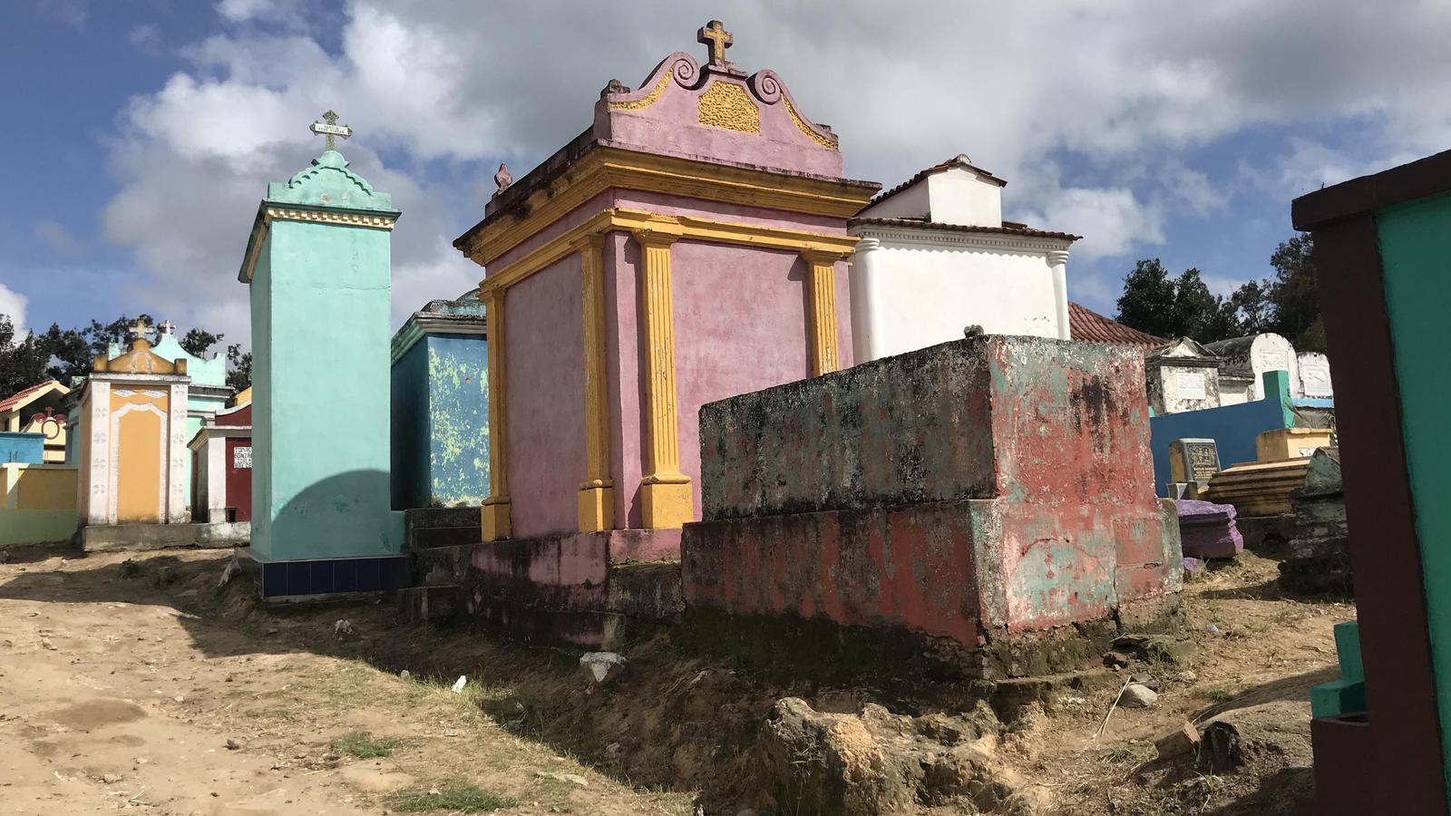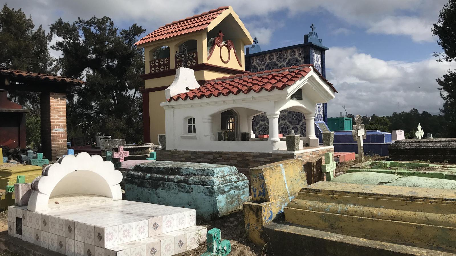 Une des rues se poursuit en traversant le cimetière. Celui-ci est très vaste et s'étend sur plusieurs collines, couvertes de tombes et tombeaux multicolores, peints aux couleurs mayas.